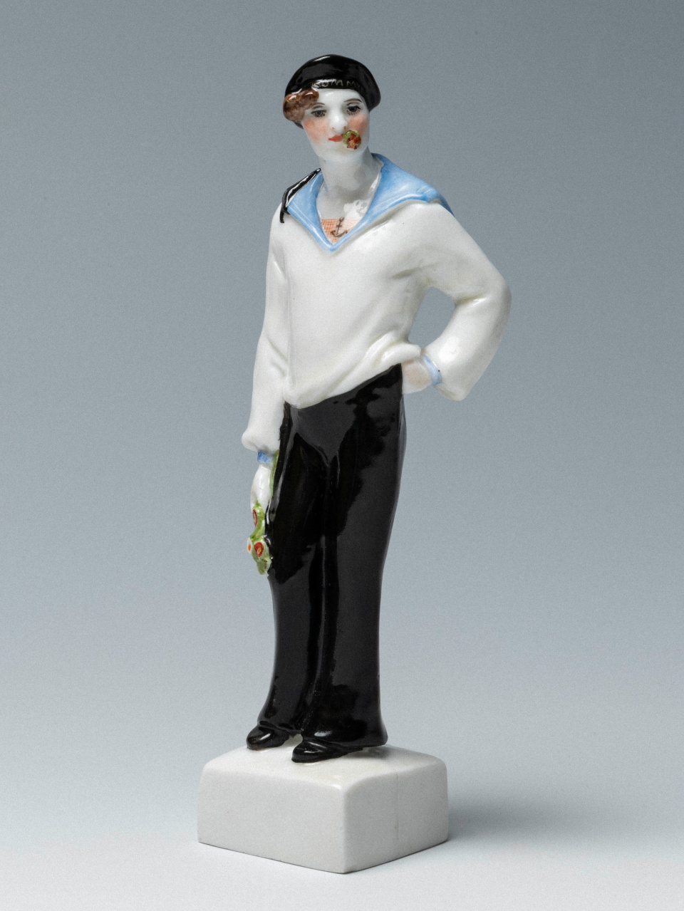 Л: Да, у меня есть несколько таких вещей. Думаю, для любой девушки, которая выросла в порту (а Ленинград — это портовый город), фигура матроса вызывает особый трепет. В моей коллекции есть матрос Балтийского флота, матрос Севастополя, но мой самый любимый — это матрос с чубом и с розой в зубах, который идет на свидание.