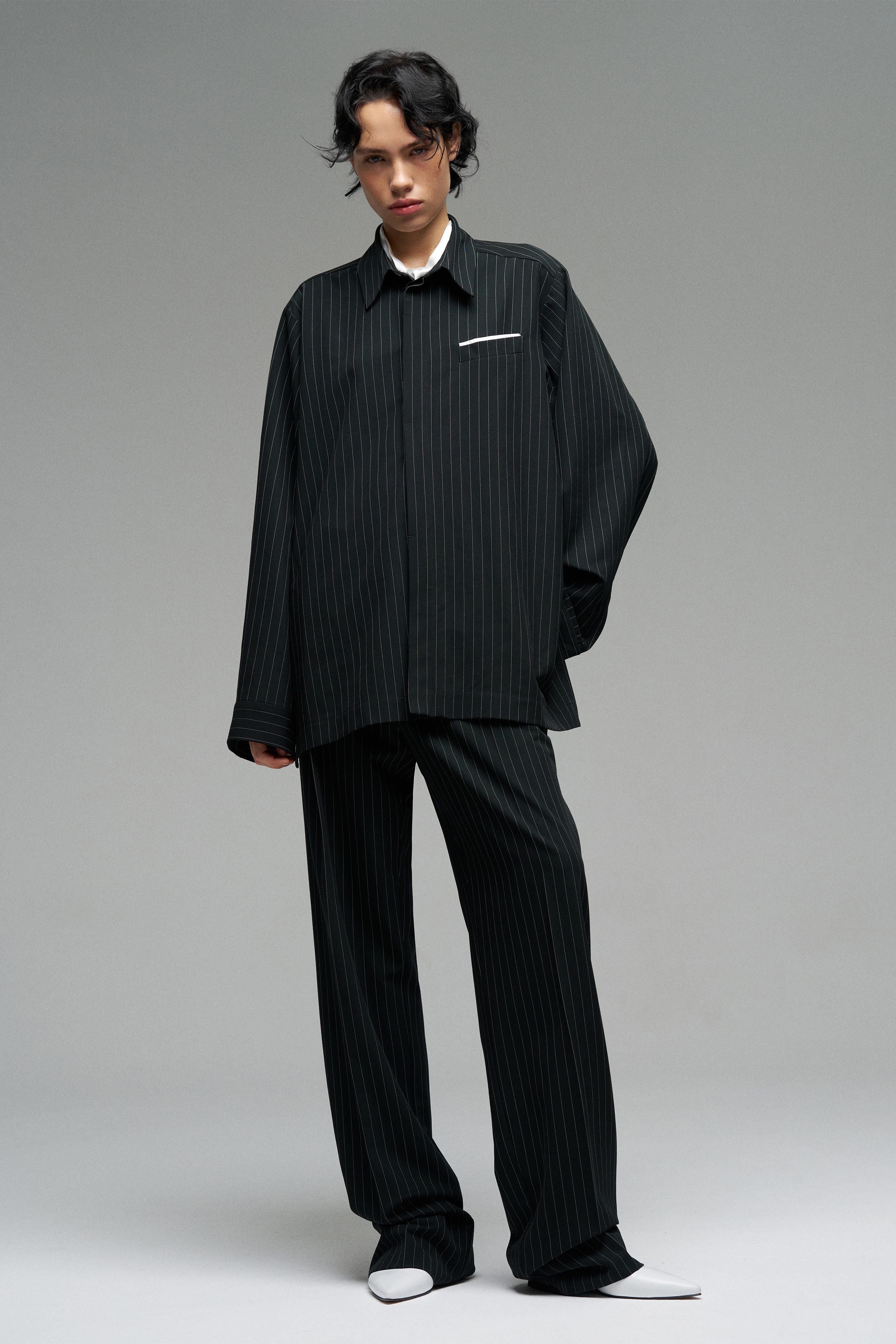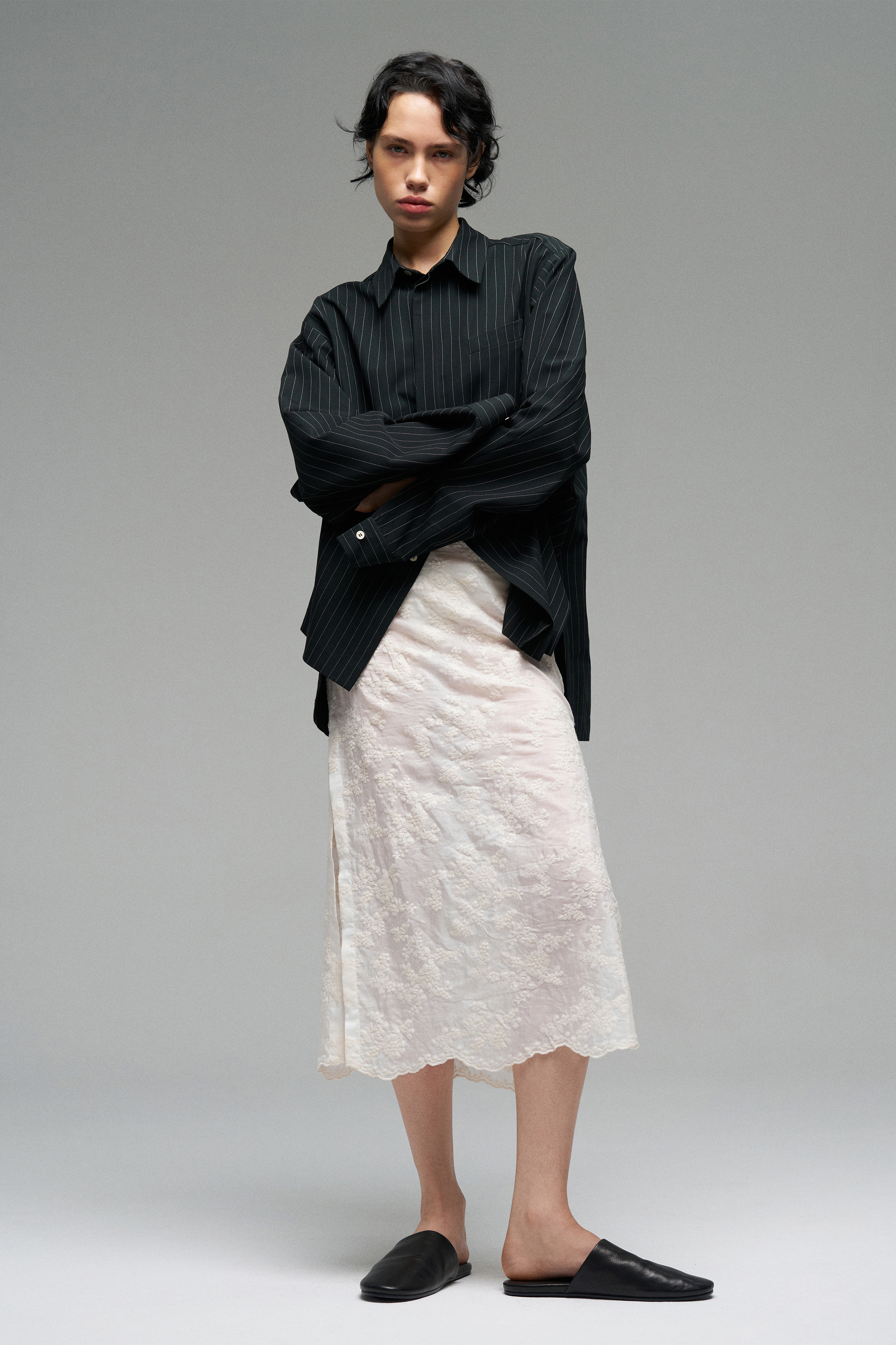 Рубашка свободного кроя с разрезами по бокам и застёжкой на пуговицы, в том числе на манжетах, на груди — функциональный карман.