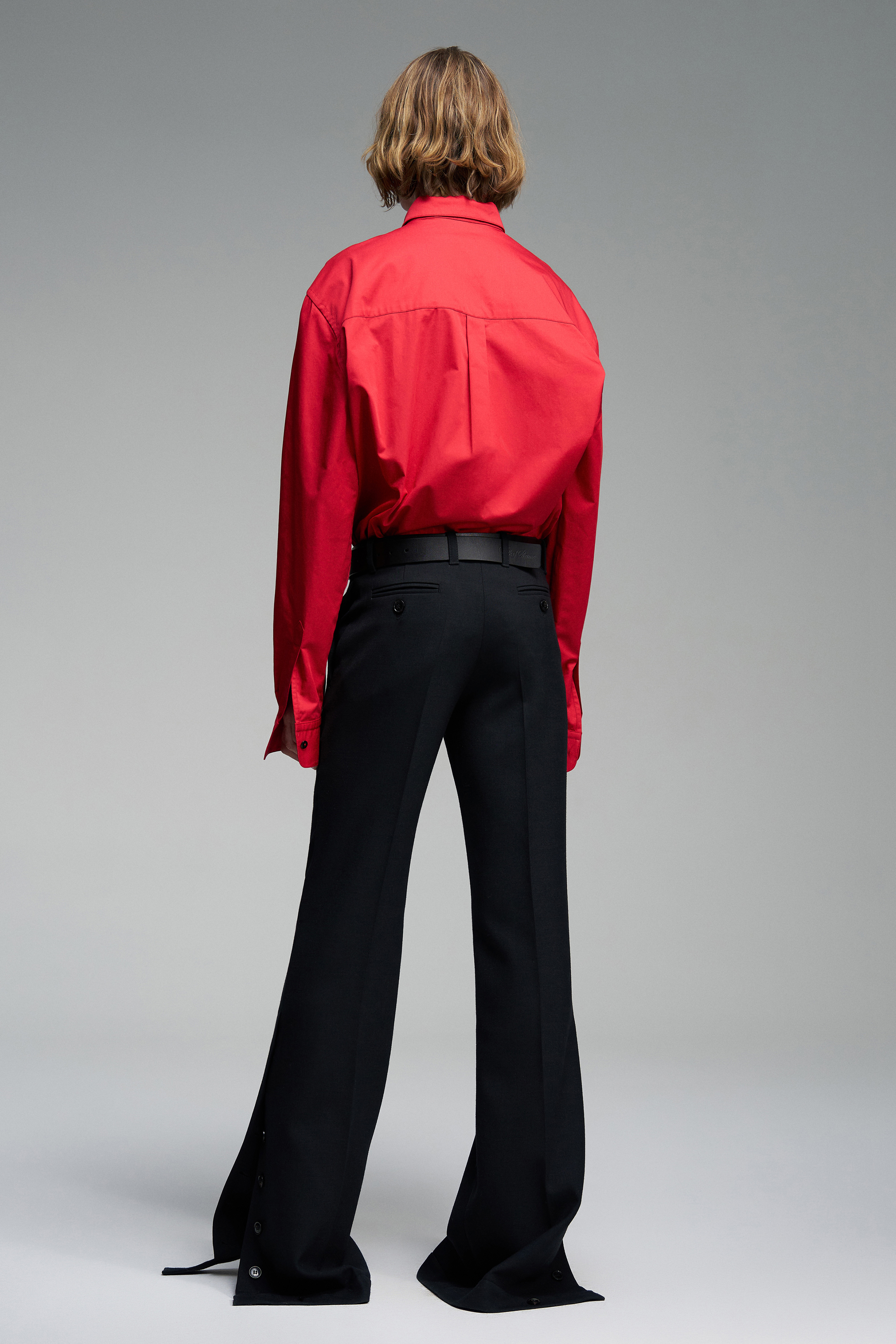 Рубашка красного цвета на пуговицах. Со спущенной линией плеч, манжетах на пуговицах и классическим воротником. Рубашка с вышивкой бренда в тон изделия.