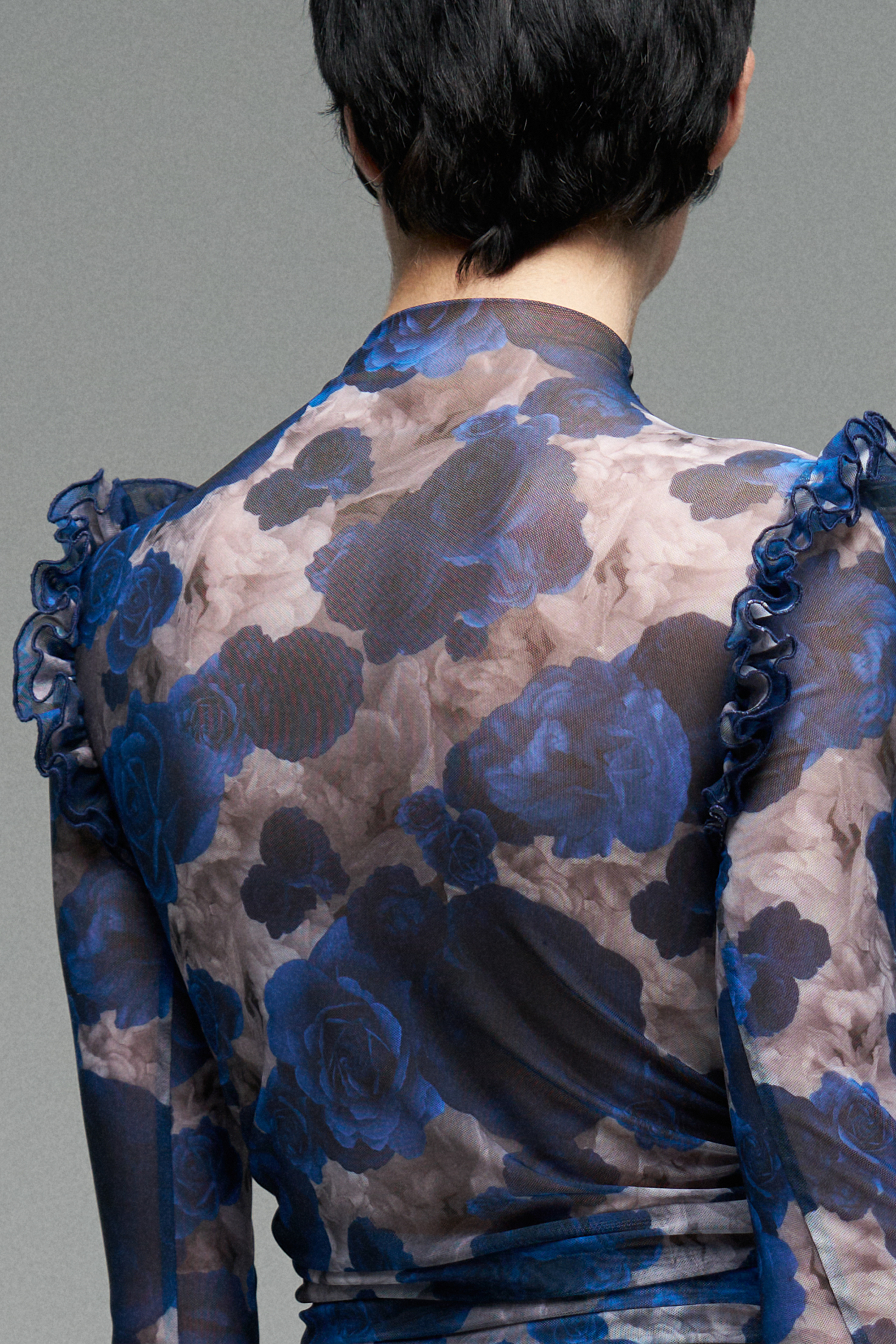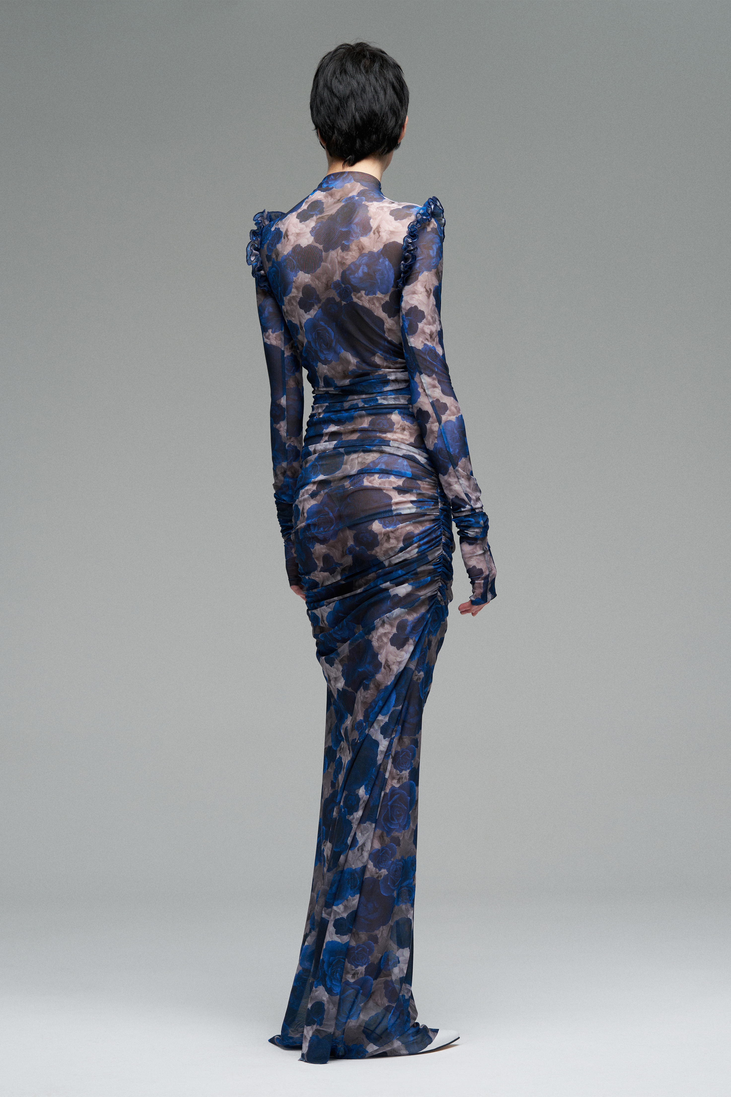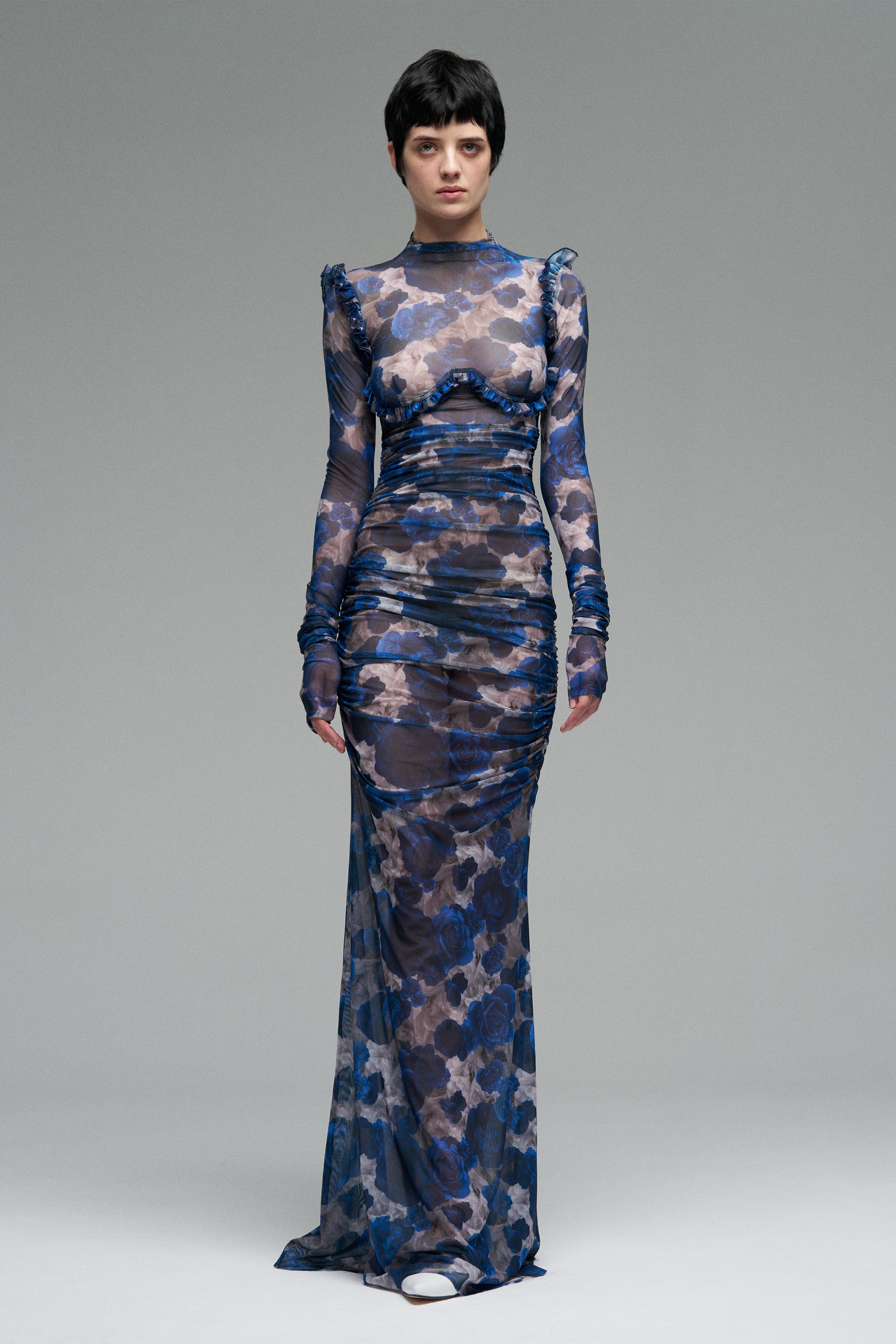 Платье из эластичной сетки с принтом роз. Полупрозрачная ткань мягко драпируется по телу, создавая акцент на силуэте. В конструкции — имитация косточек под грудью и рюши.