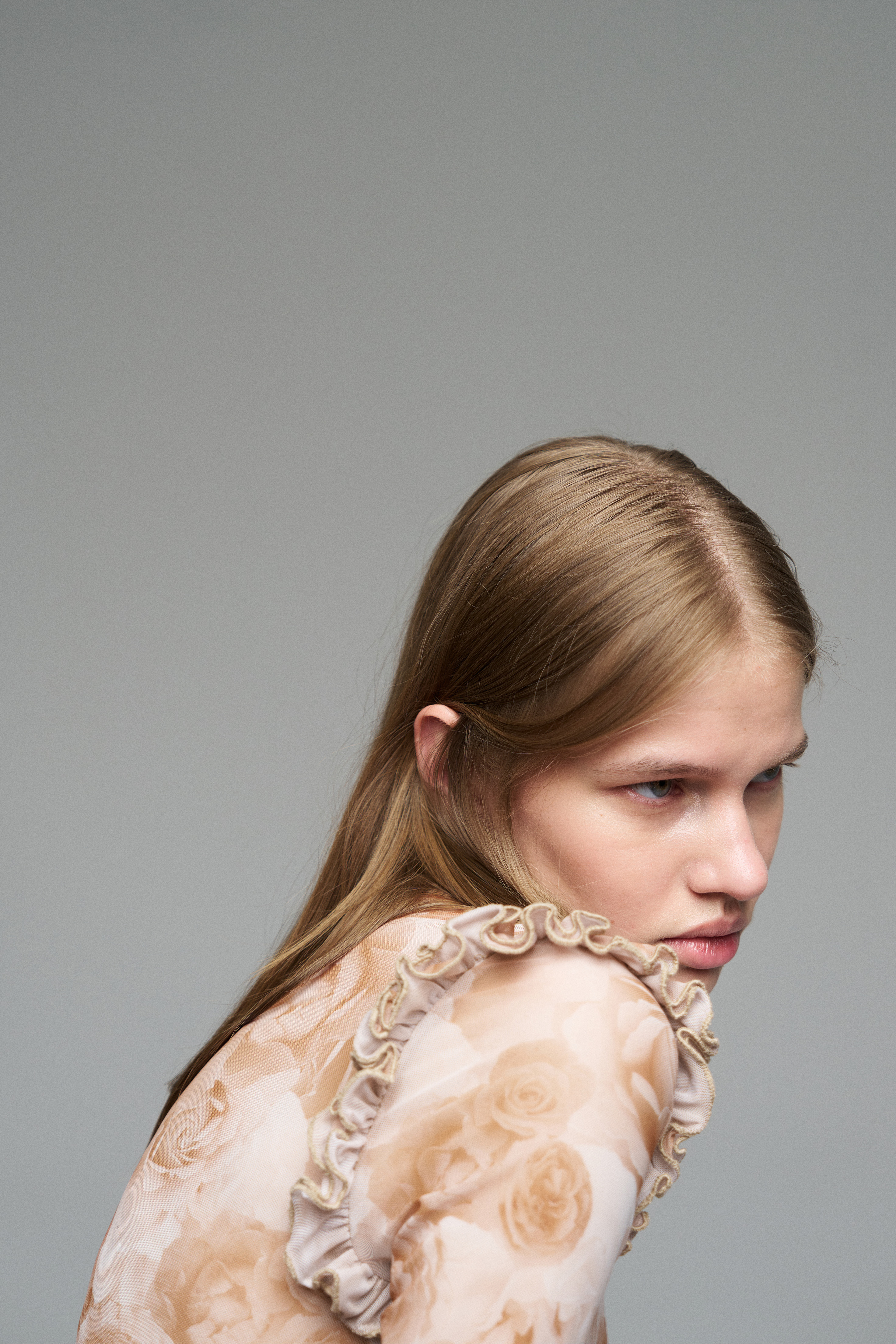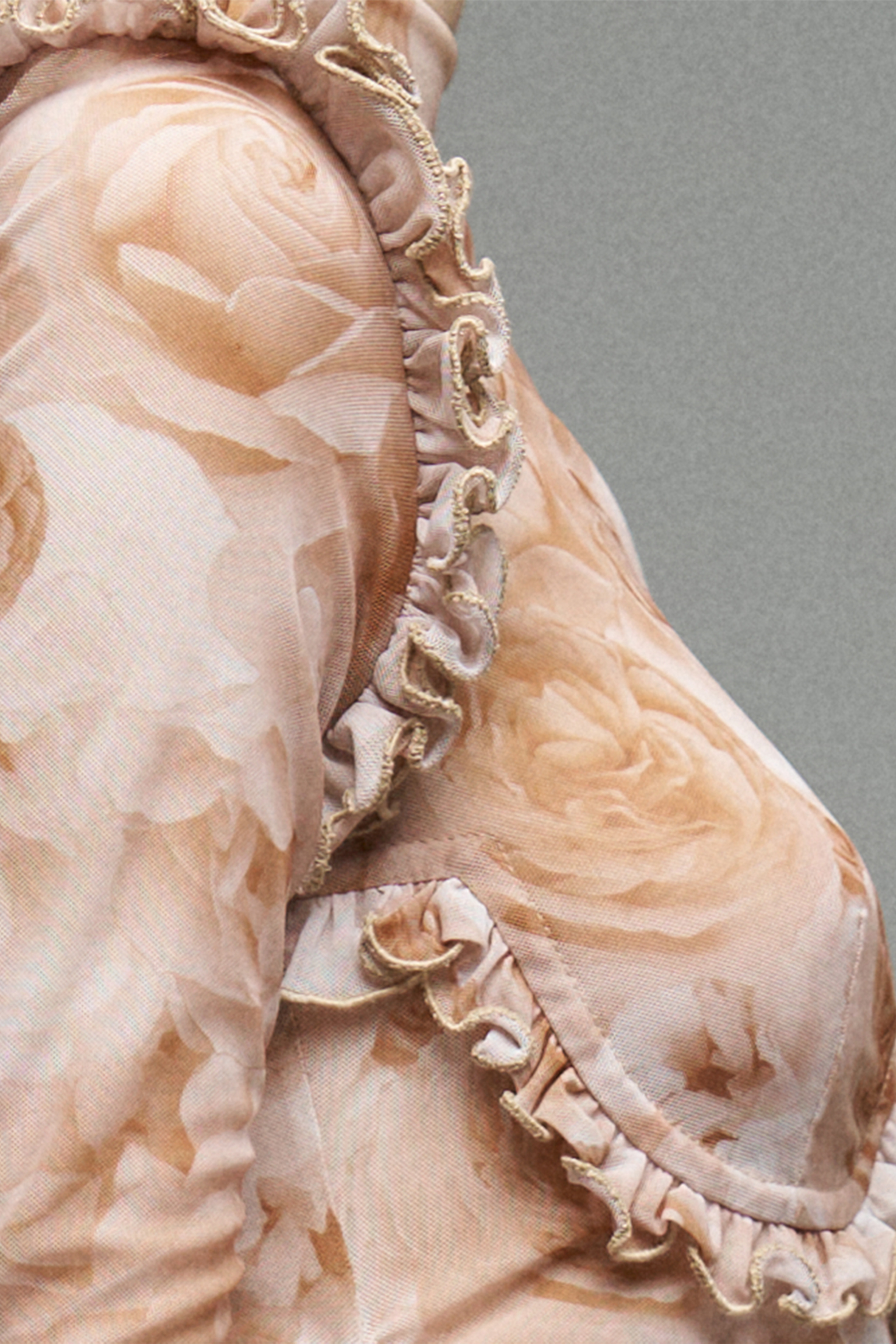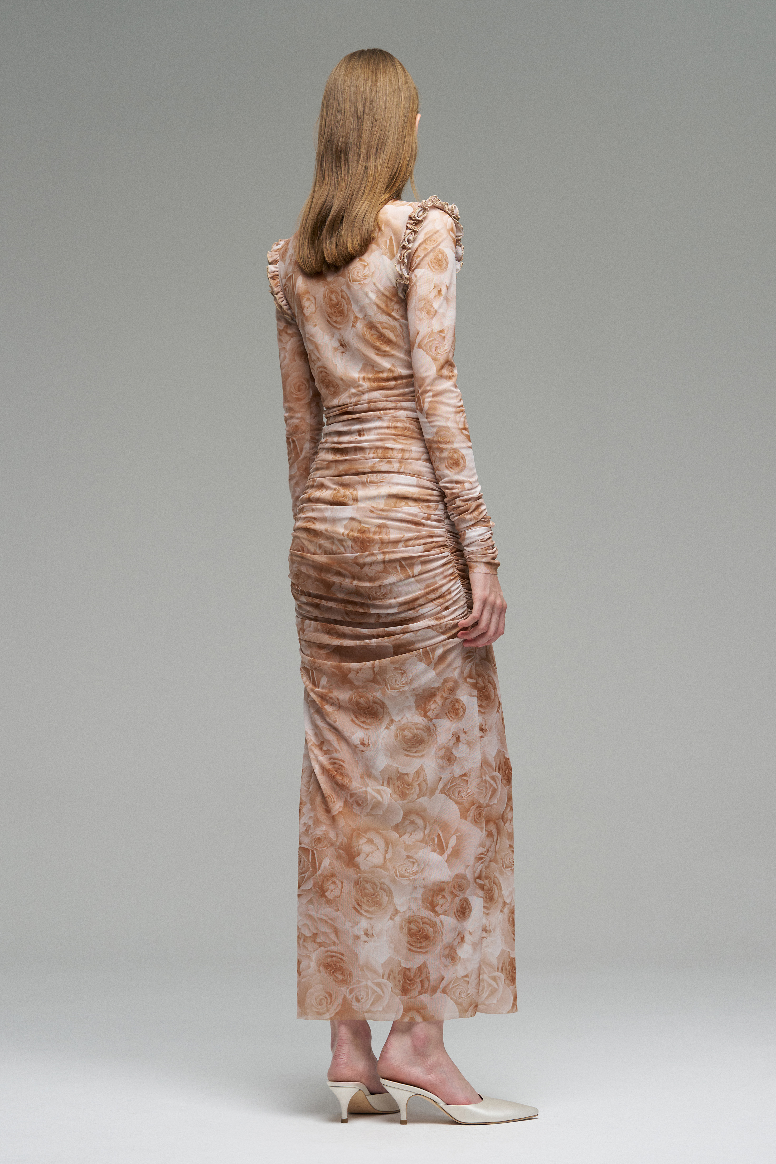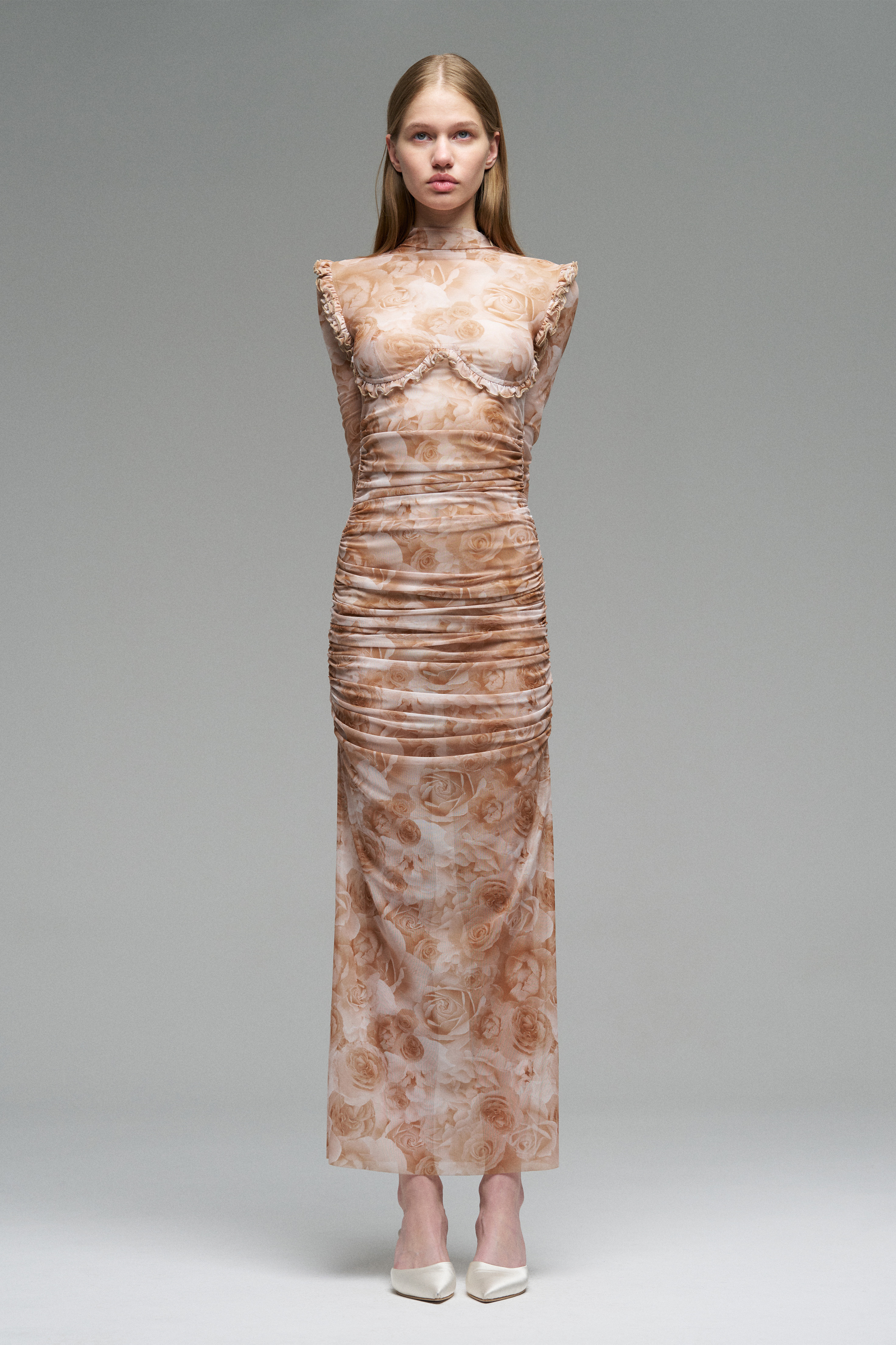 Платье из эластичной сетки с принтом роз. Полупрозрачная ткань мягко драпируется по телу, создавая акцент на силуэте. В конструкции — имитация косточек под грудью и рюши.