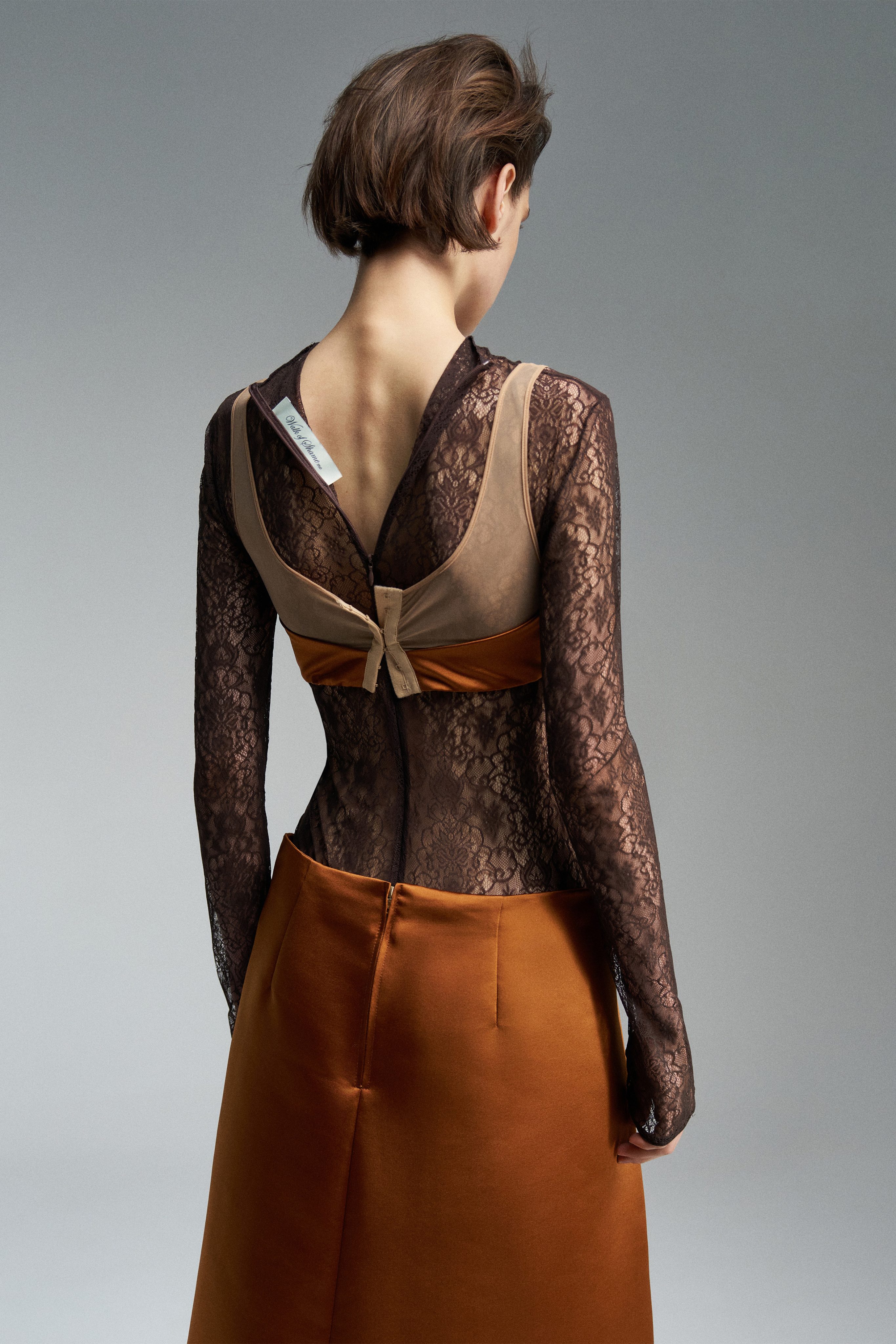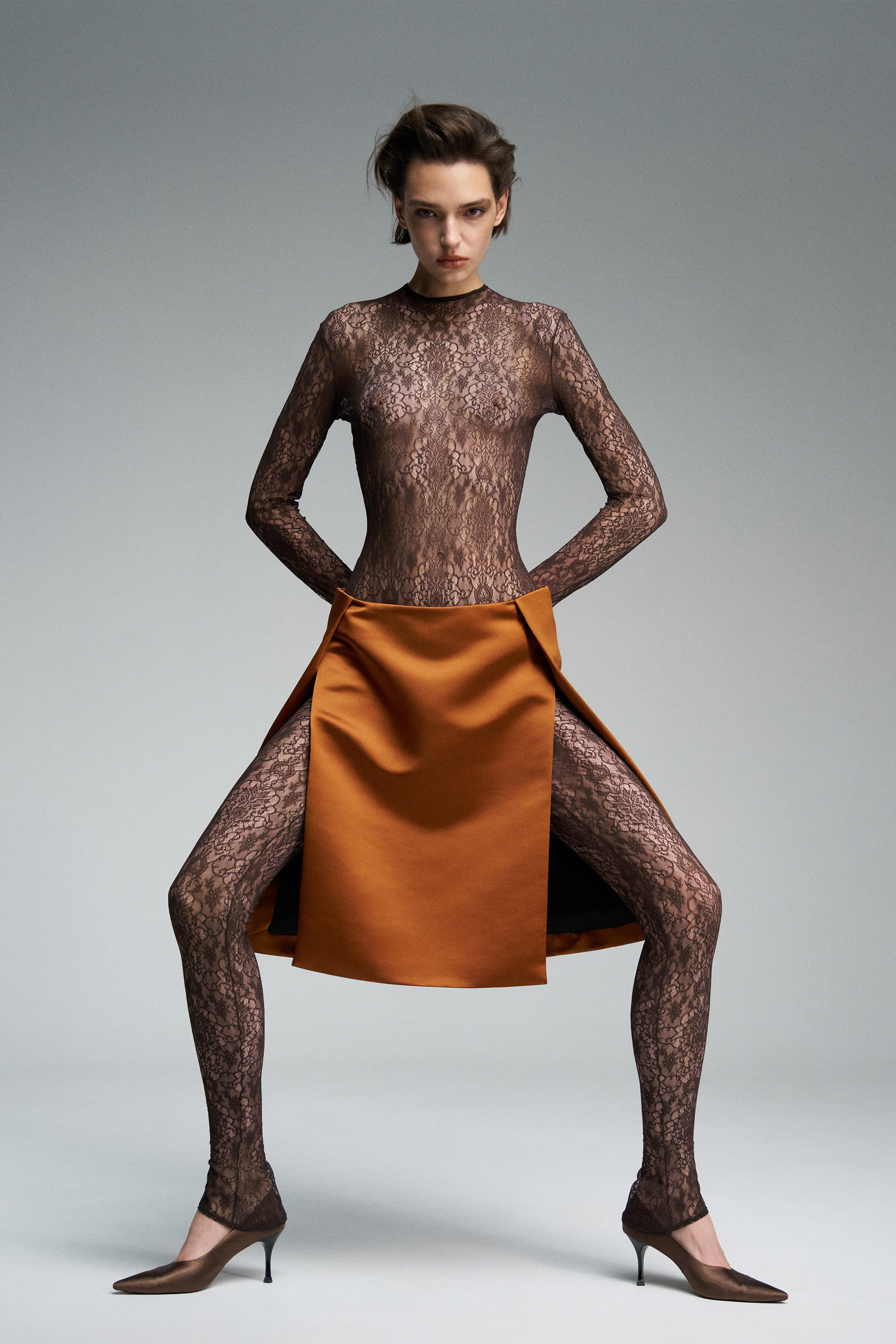Комбинезон из кружева с воротником-стойкой. По спинке — застёжка на молнию, благодаря которой изделие плотно прилегает к телу и подчёркивает силуэт.
