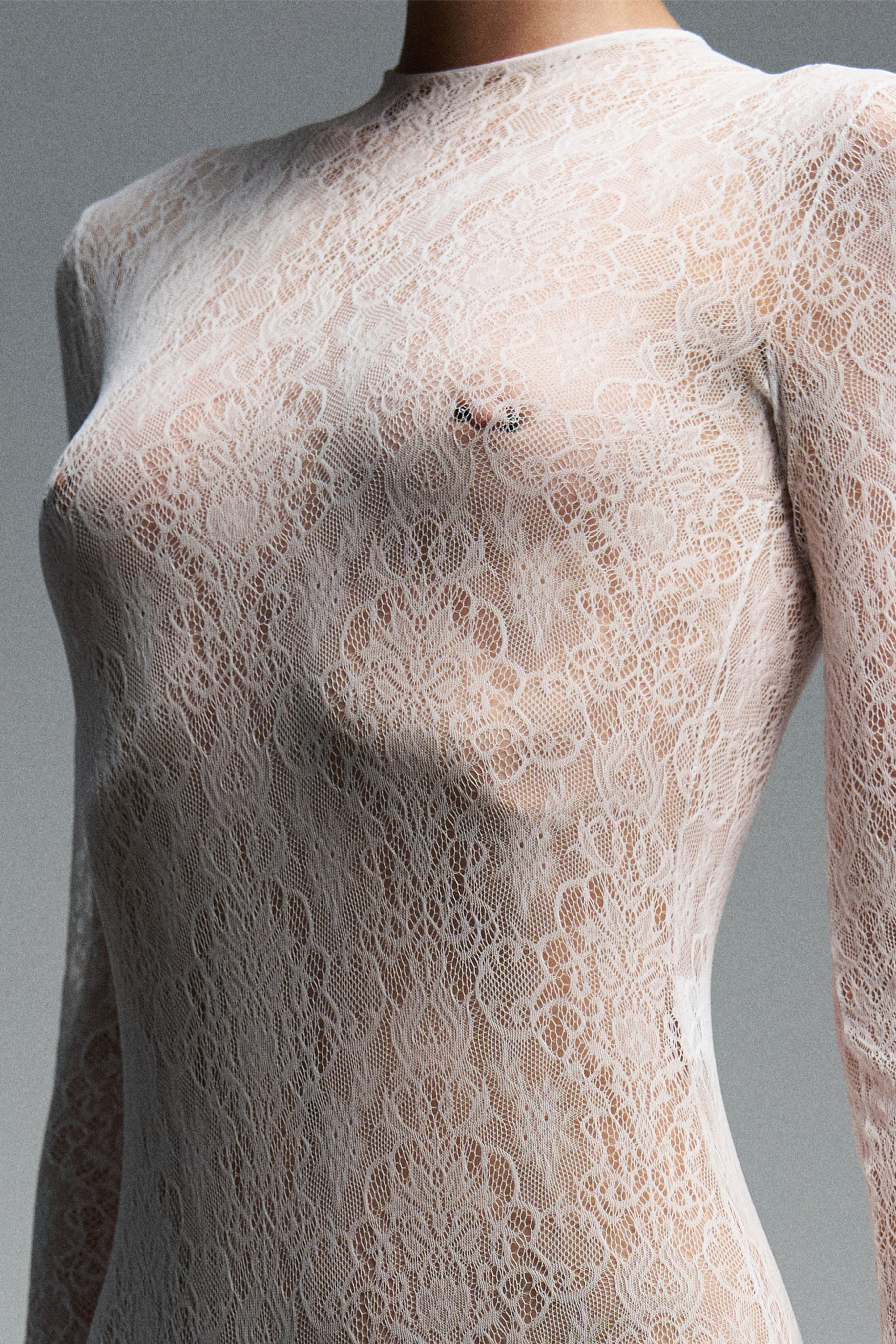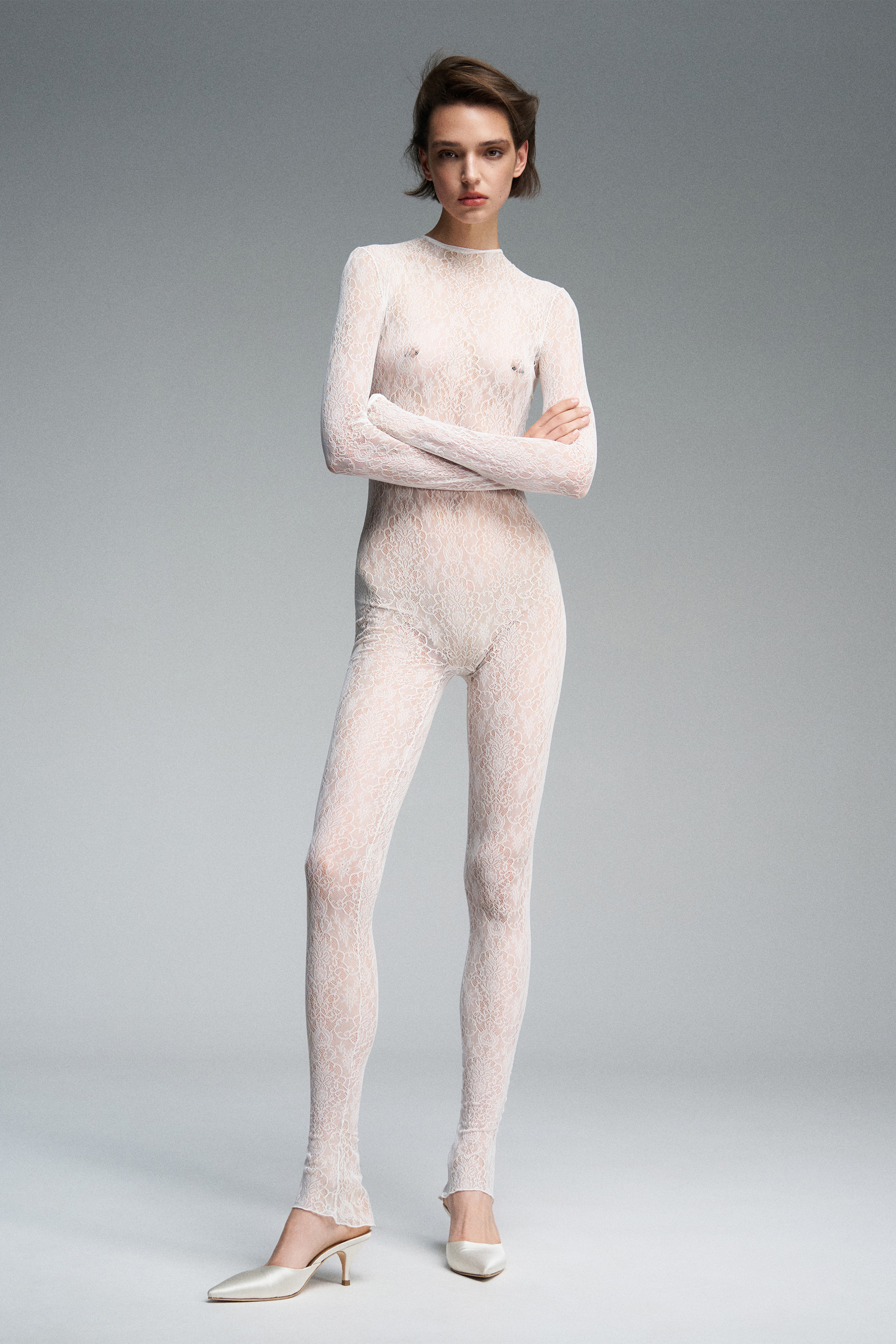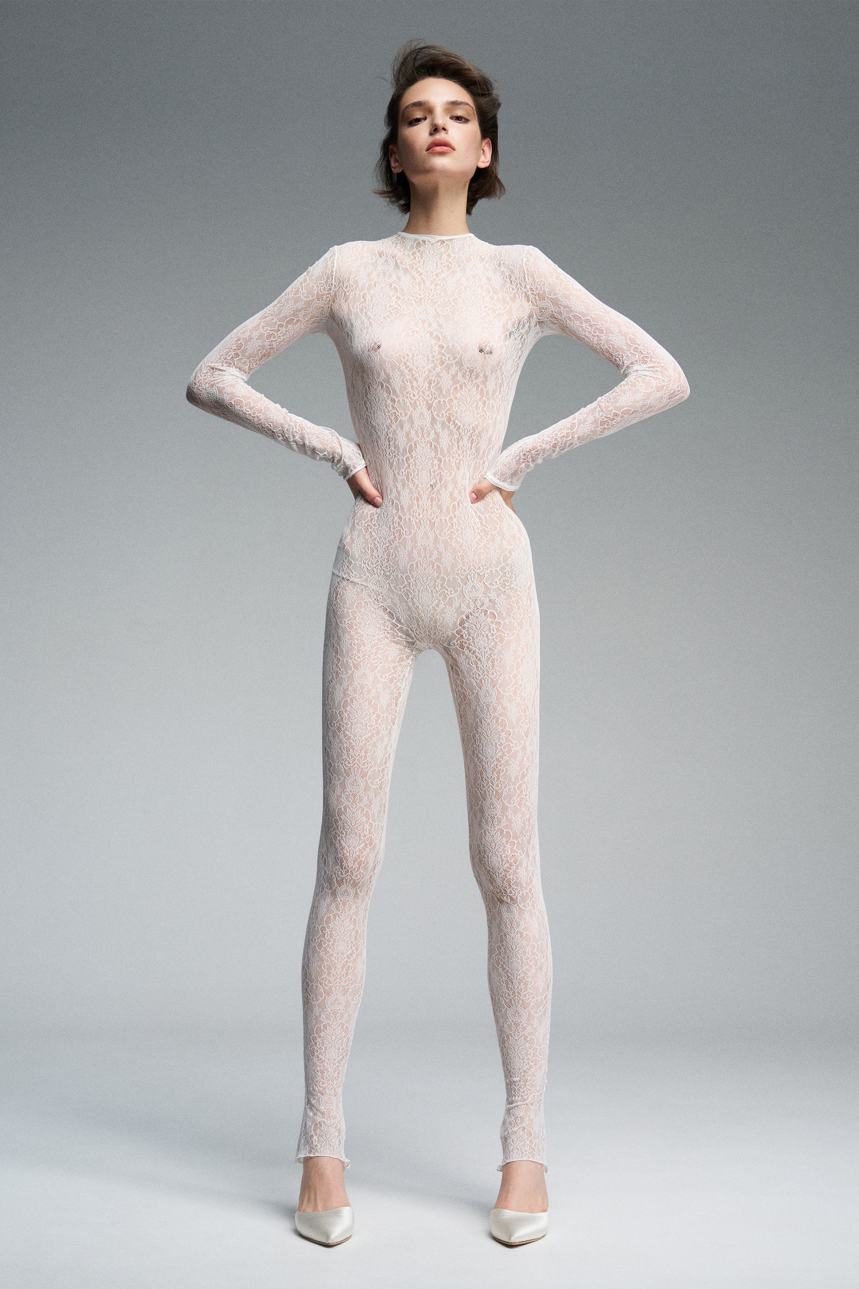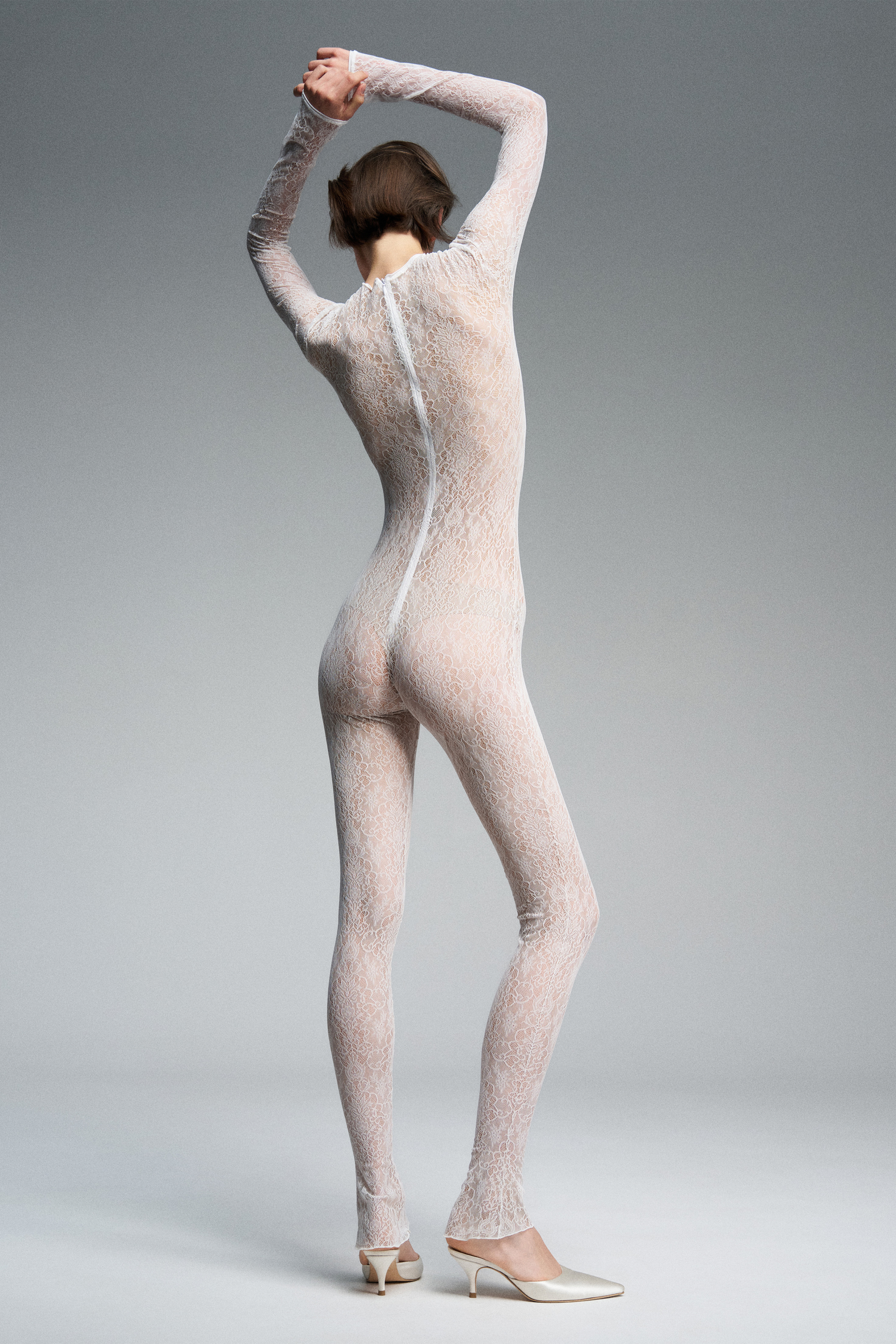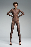 Комбинезон из кружева с воротником-стойкой. По спинке — застёжка на молнию, благодаря которой изделие плотно прилегает к телу и подчёркивает силуэт.