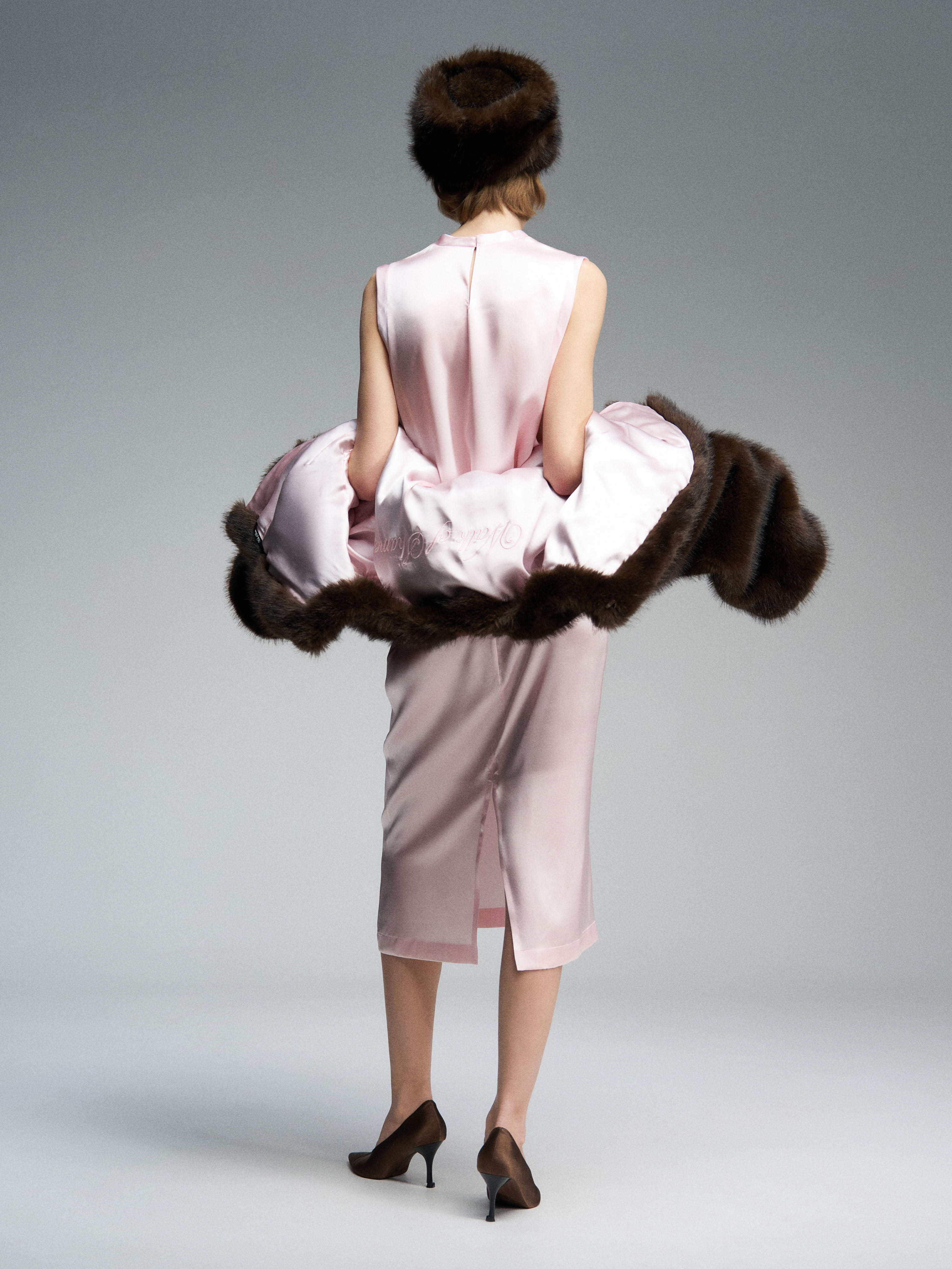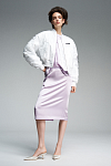 Юбка миди из натурального английского шёлка нежно-розового цвета. Изделие на бельевой резинке, украшенной спереди декоративным бантиком. Сзади — шлица и скрытая застёжка на молнию. Можно носить как самостоятельно, так и в качестве второго слоя под платье или юбку.