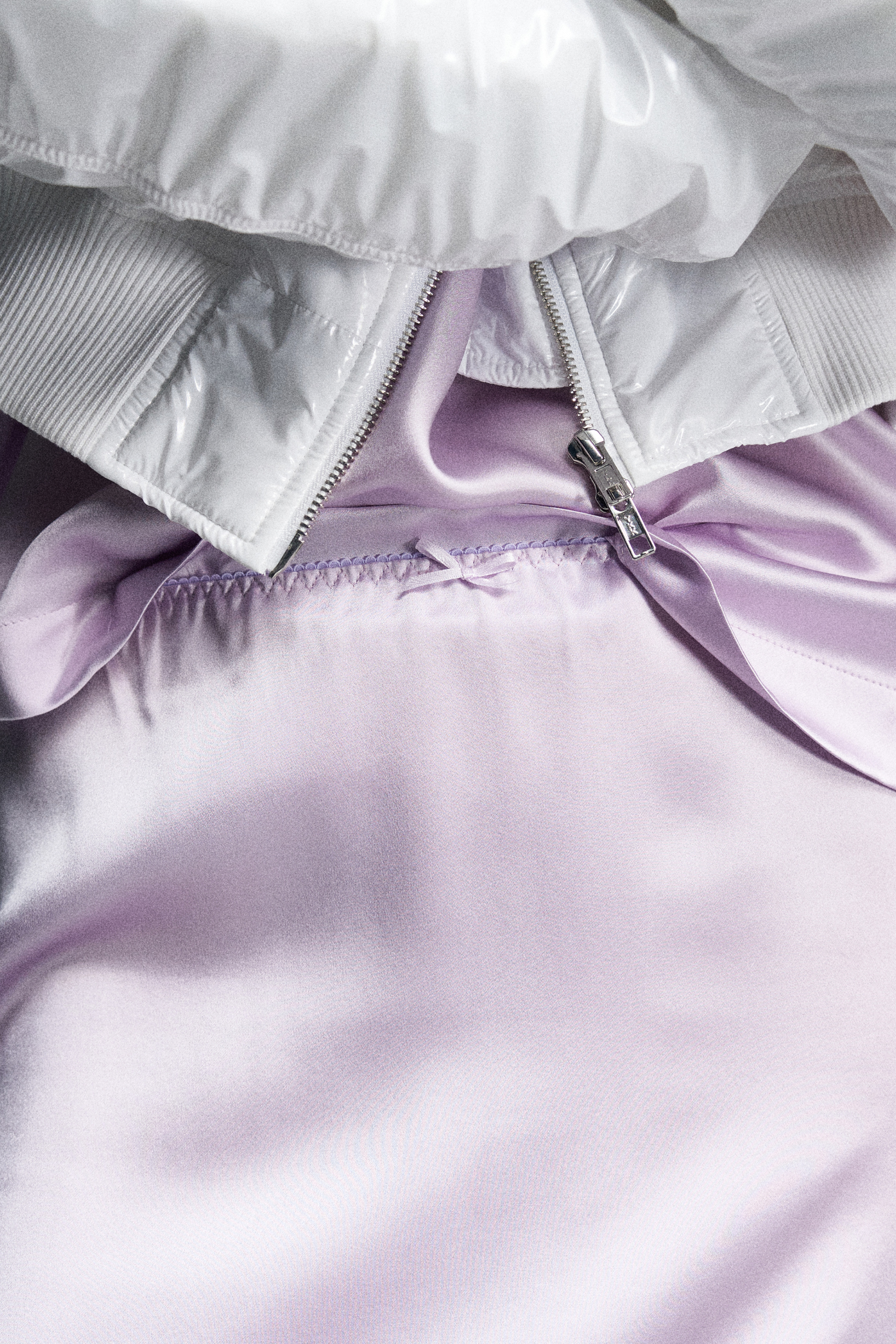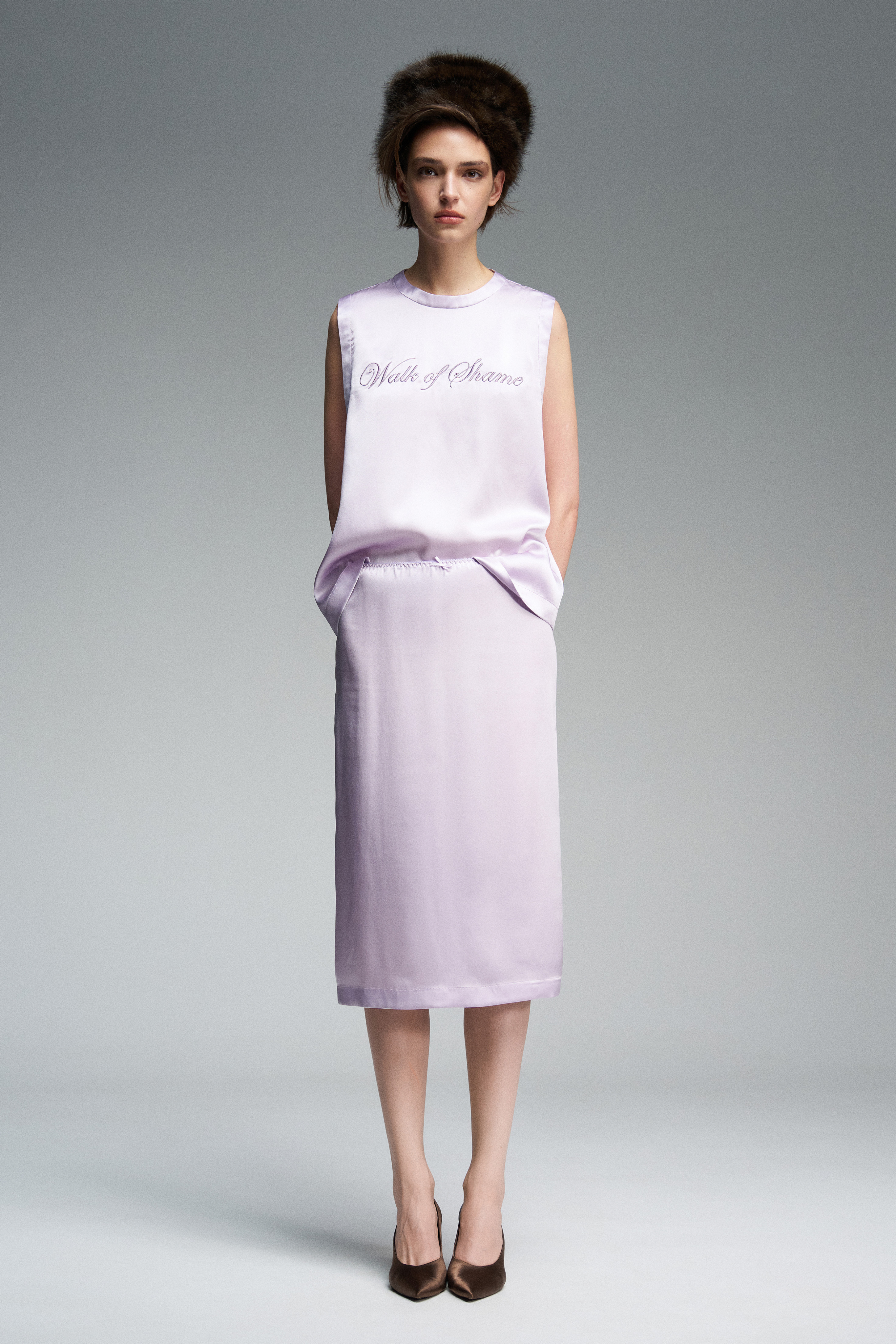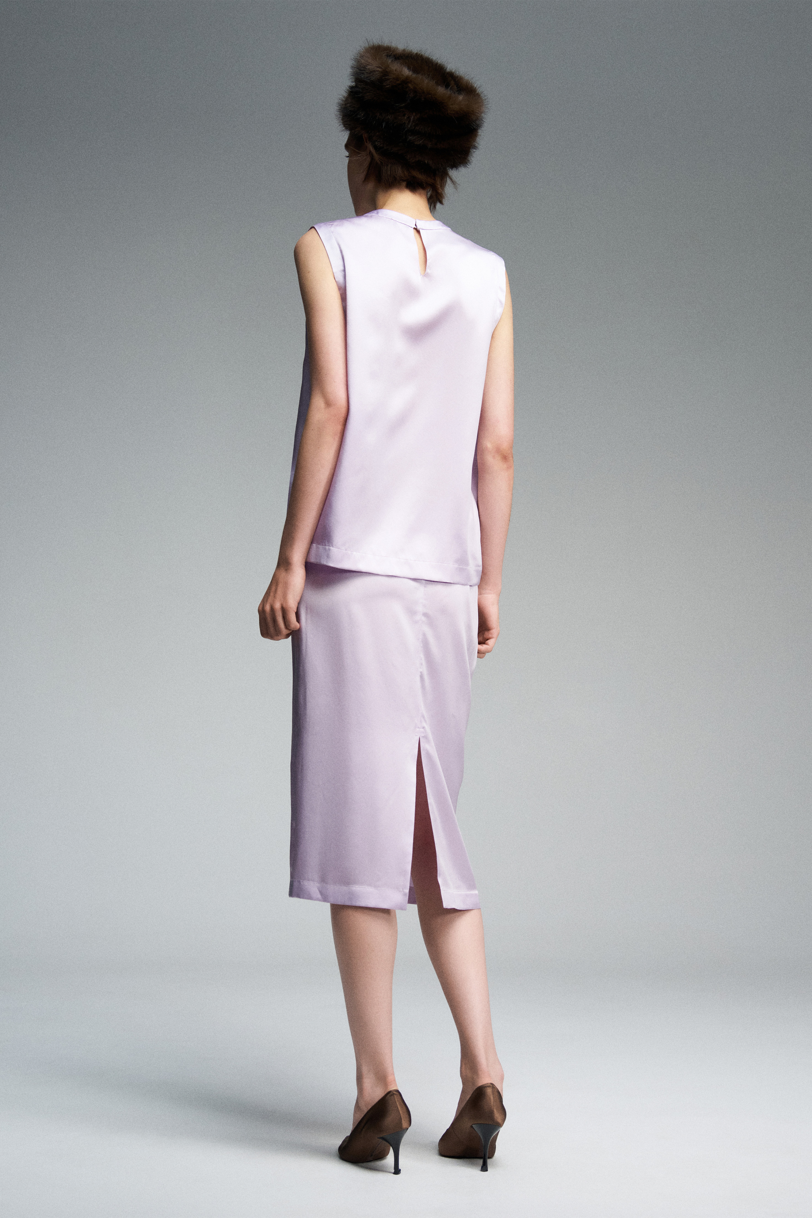 Юбка миди из натурального английского шёлка нежно-розового цвета. Изделие на бельевой резинке, украшенной спереди декоративным бантиком. Сзади — шлица и скрытая застёжка на молнию. Можно носить как самостоятельно, так и в качестве второго слоя под платье или юбку.