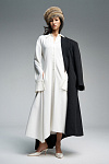 Платье миди с лёгким приталенным силуэтом из шерстяного крепа. Воротник спереди имеет классическую рубашечную форму, а сзади переходит в длинные выразительные ленты, которые можно использовать как шарф. По спинке — V-образный вырез и репсовая тесьма с логотипом бренда. Юбка асимметричная. Модель с длинными рукавами и планкой на пуговицах: в расстегнутом виде манжеты плавно ниспадают вниз.