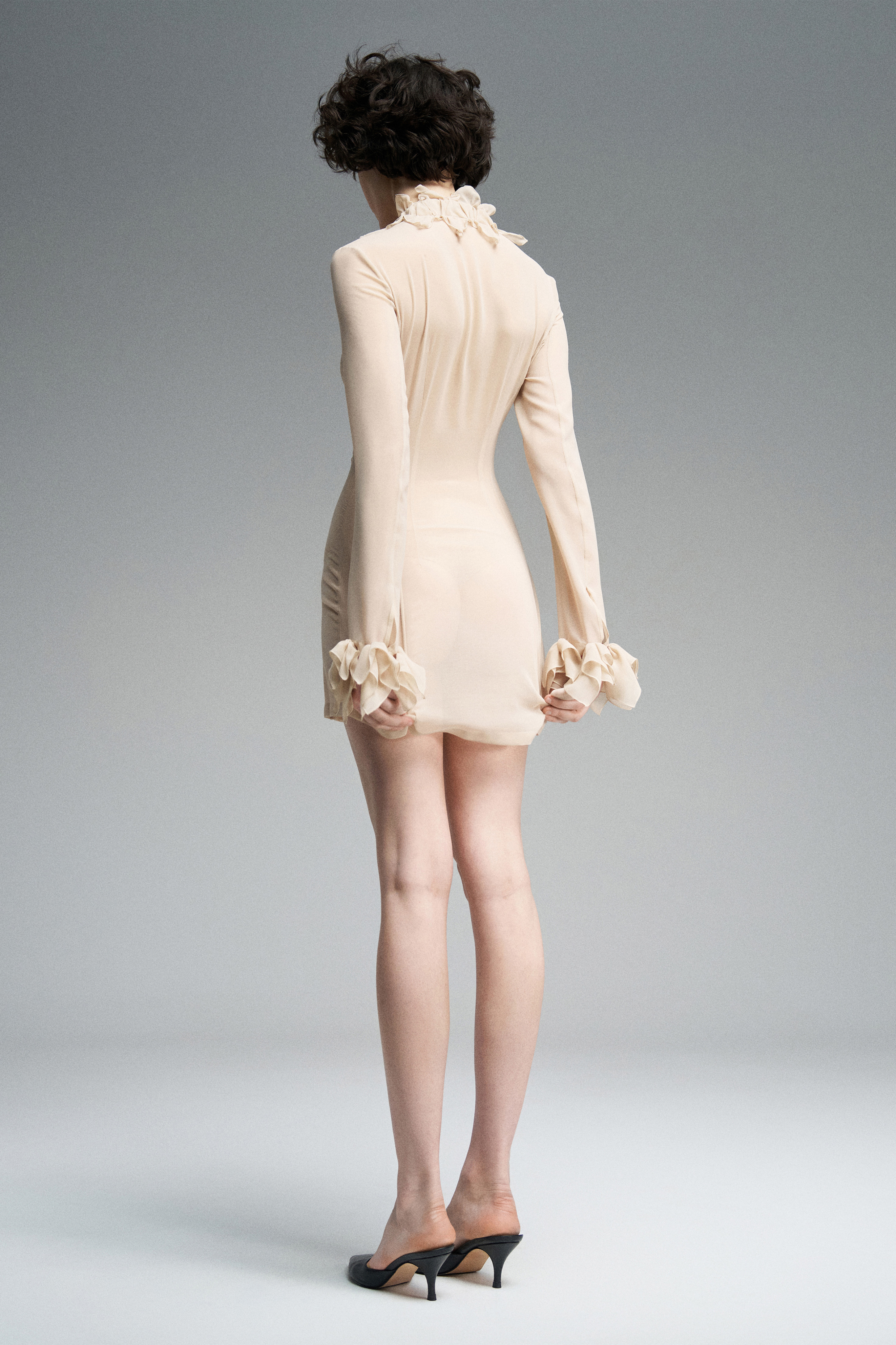 Прозрачное приталенное платье, украшенное рюшами. Рюши проходят вдоль линии застёжки, а также украшают рукава. Изделие для смелых авантюристок.