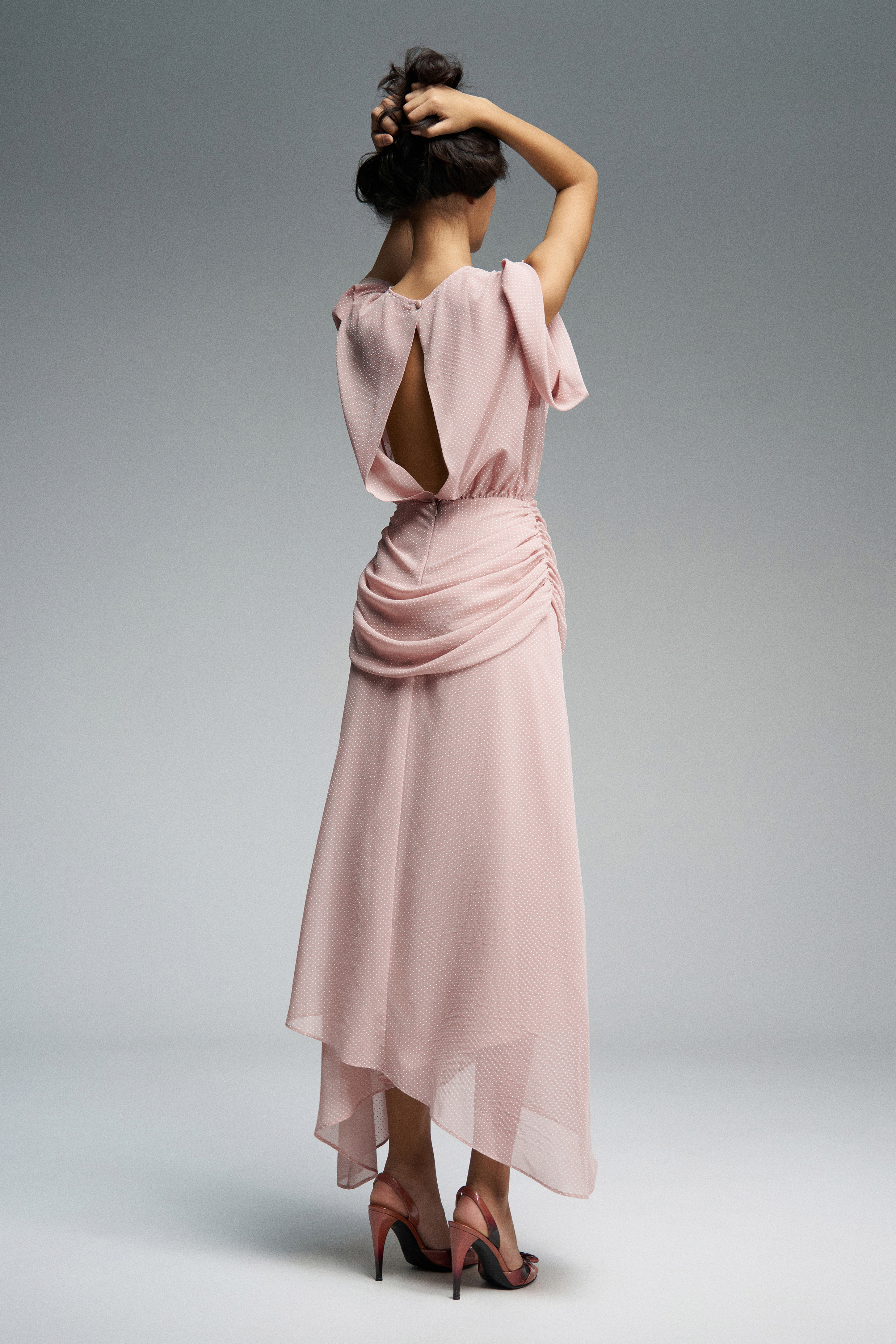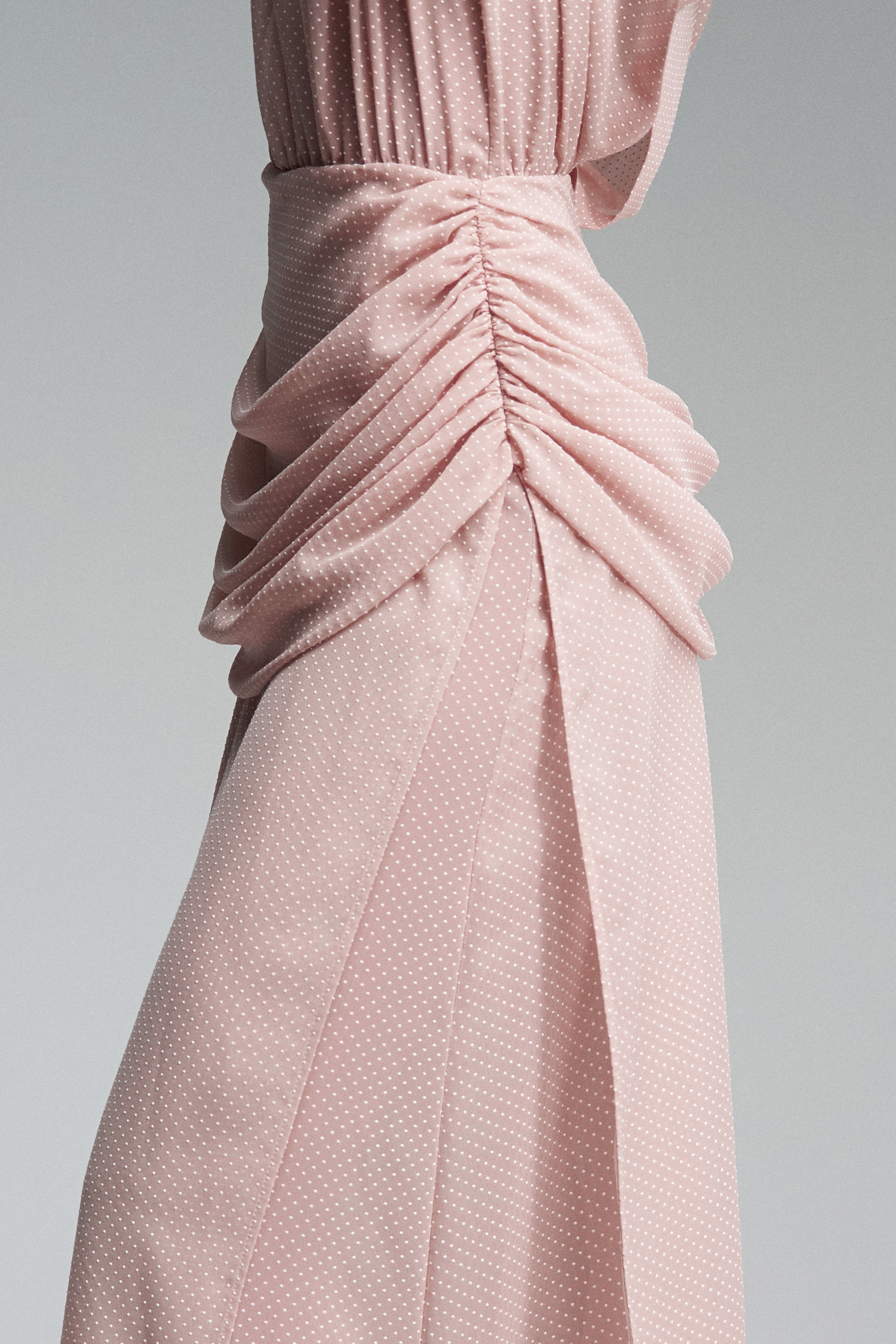 Платье из полупрозрачной ткани с принтом Polka Dot. Горох на ткани выполнен из прорезиненного материала, благодаря чему при соприкосновении с кожей возникают необычные тактильные ощущения. Материал накладывается слоями, формируя изящные драпировки.