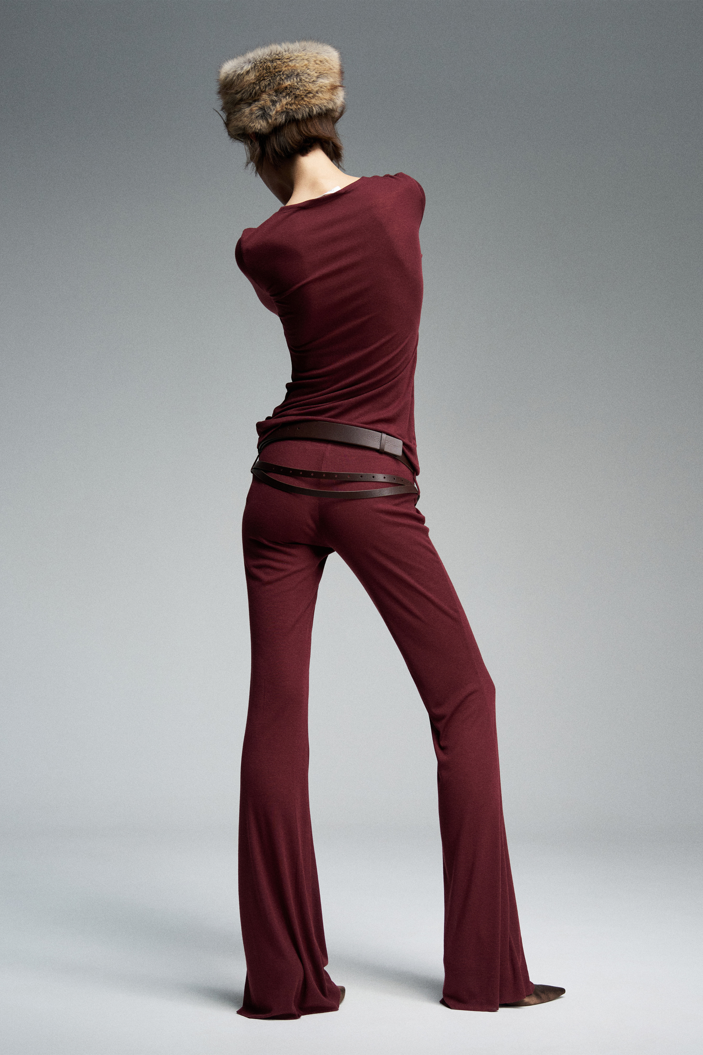 Спортивные трикотажные брюки облегающего клеш-силуэта с заниженной посадкой. Украшены двойным рядом шлевок.