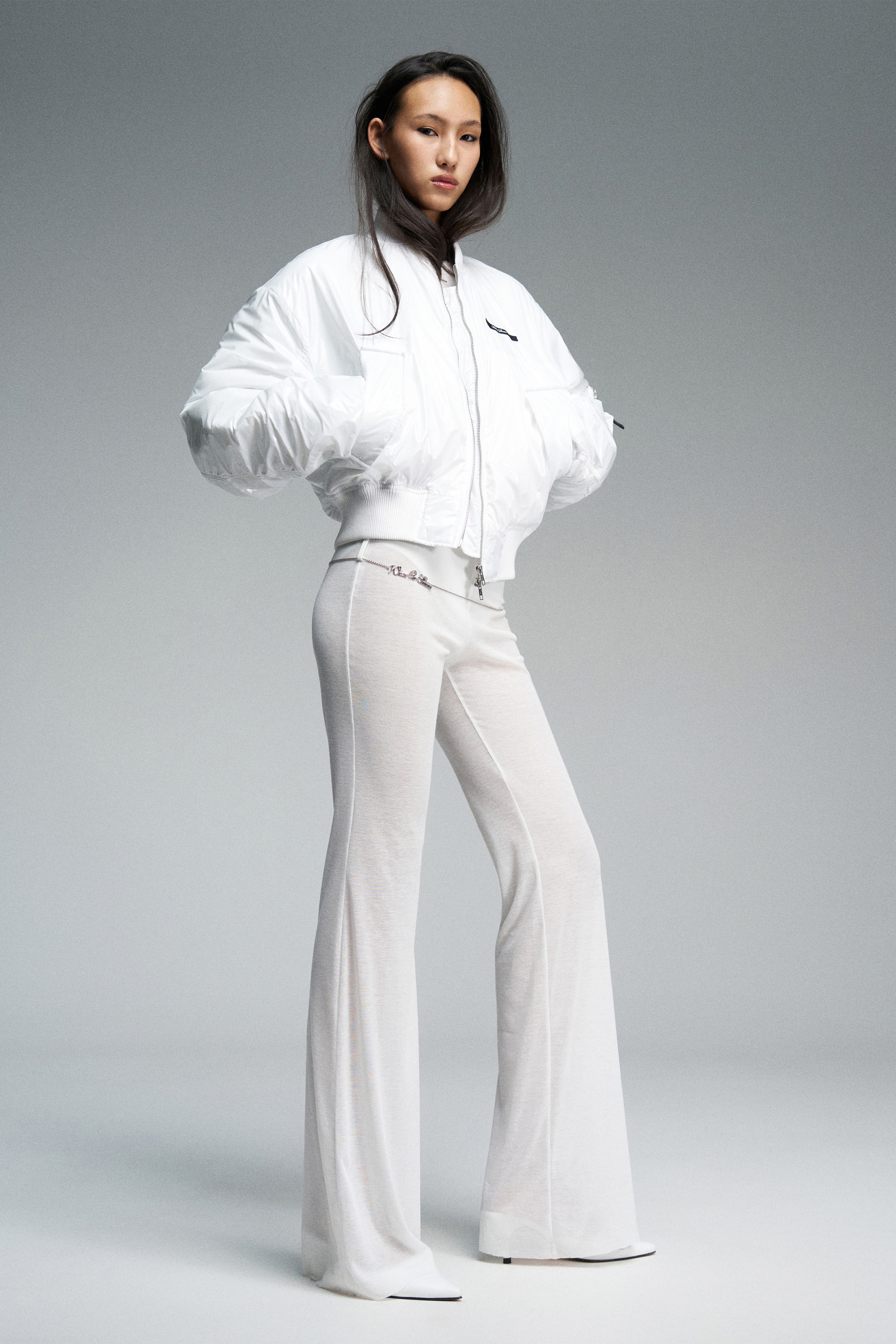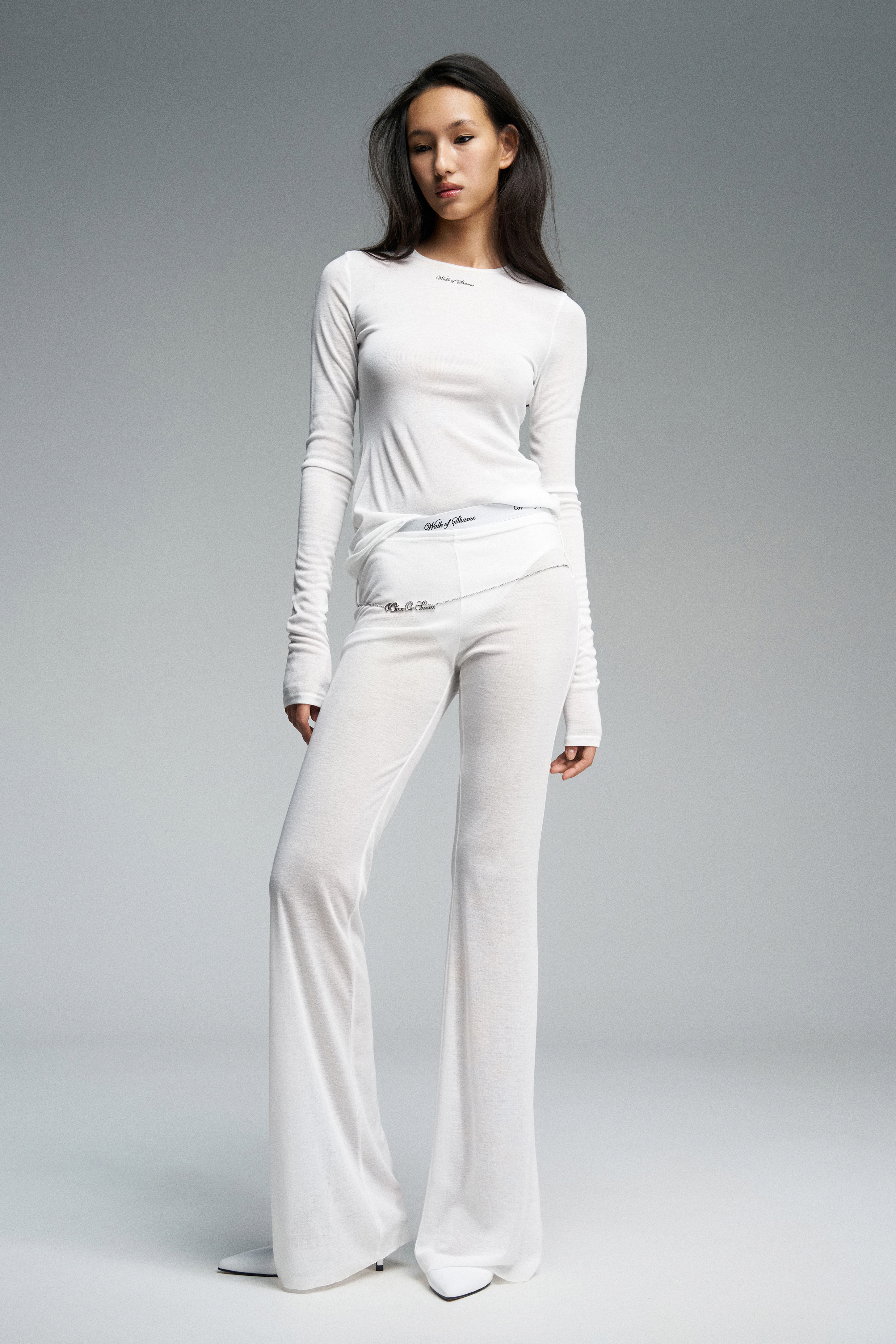 Спортивные трикотажные брюки облегающего клеш-силуэта с заниженной посадкой. Украшены двойным рядом шлевок.