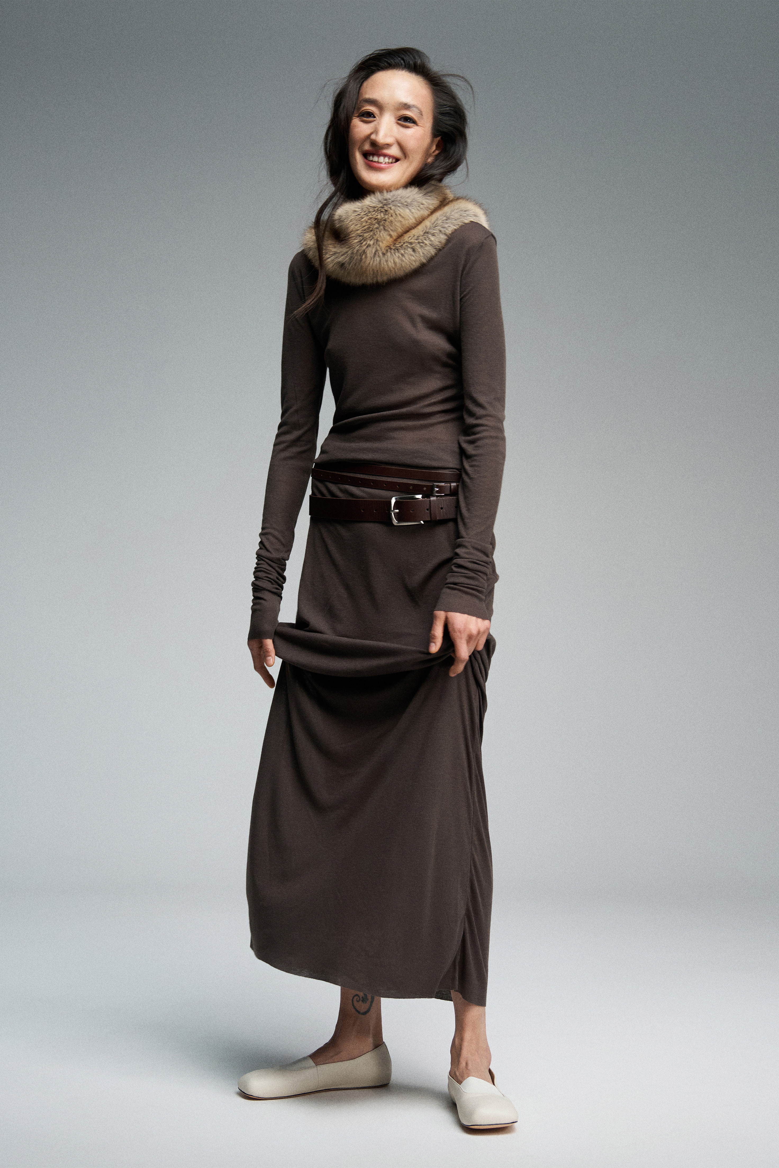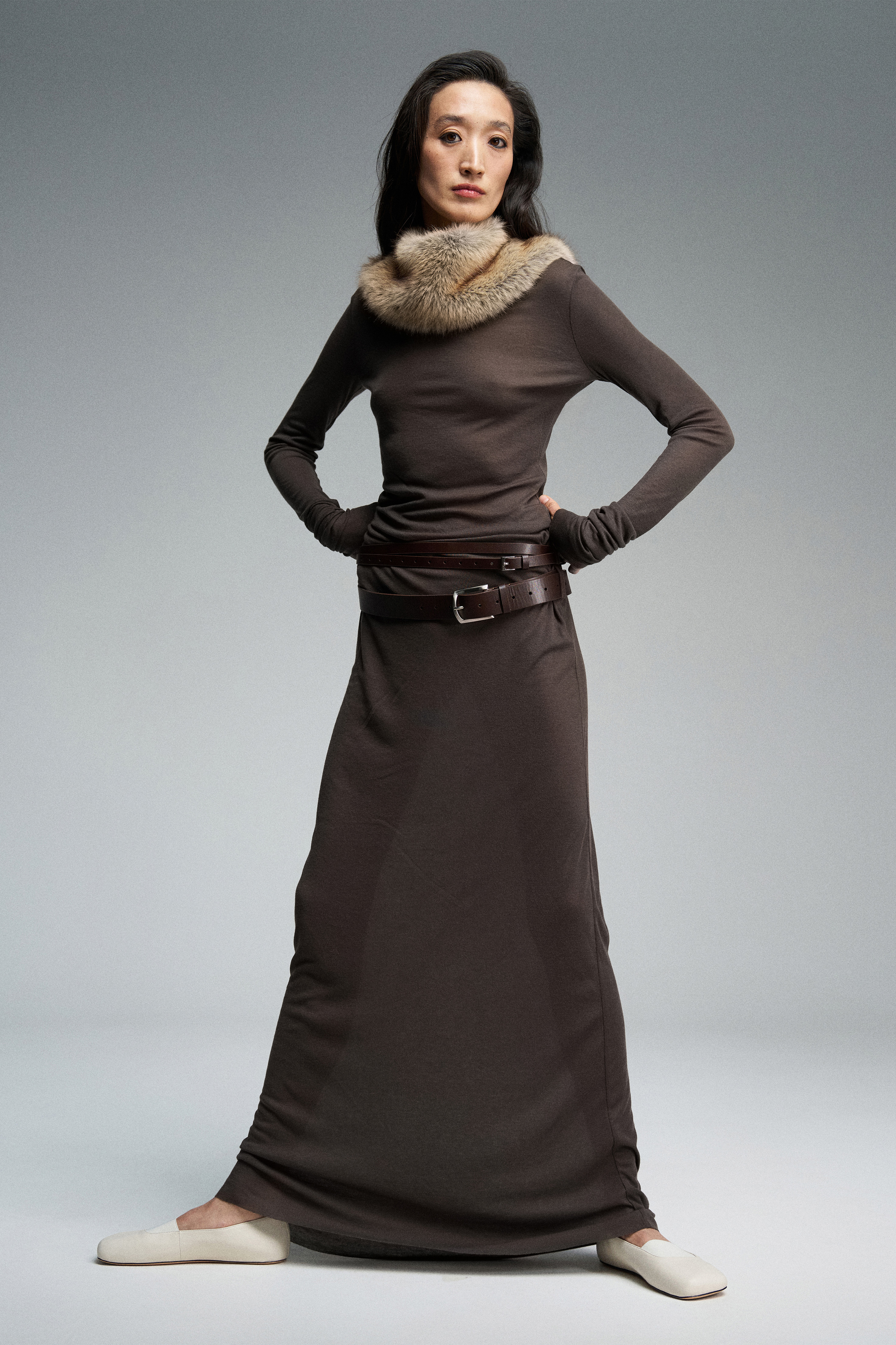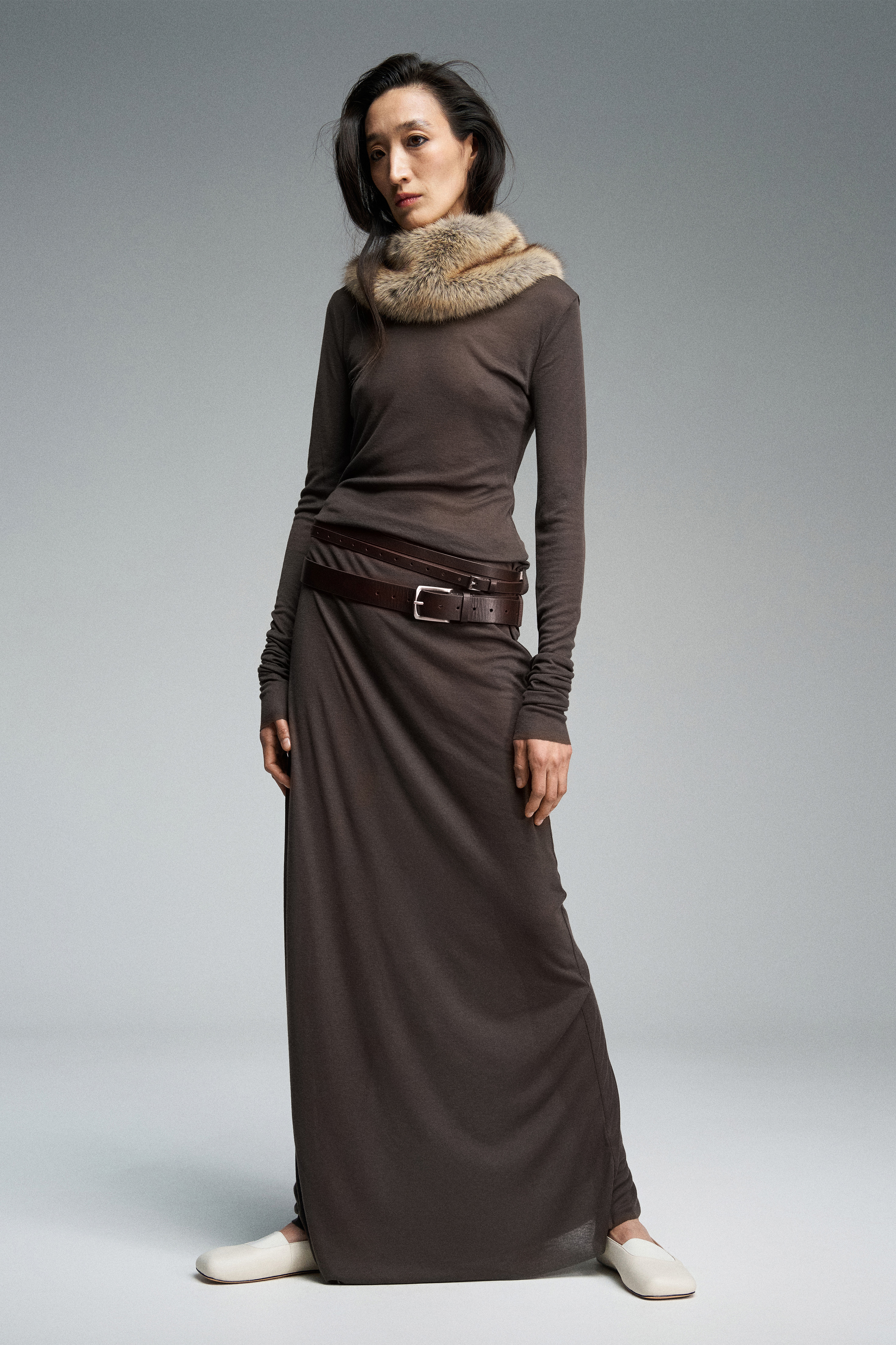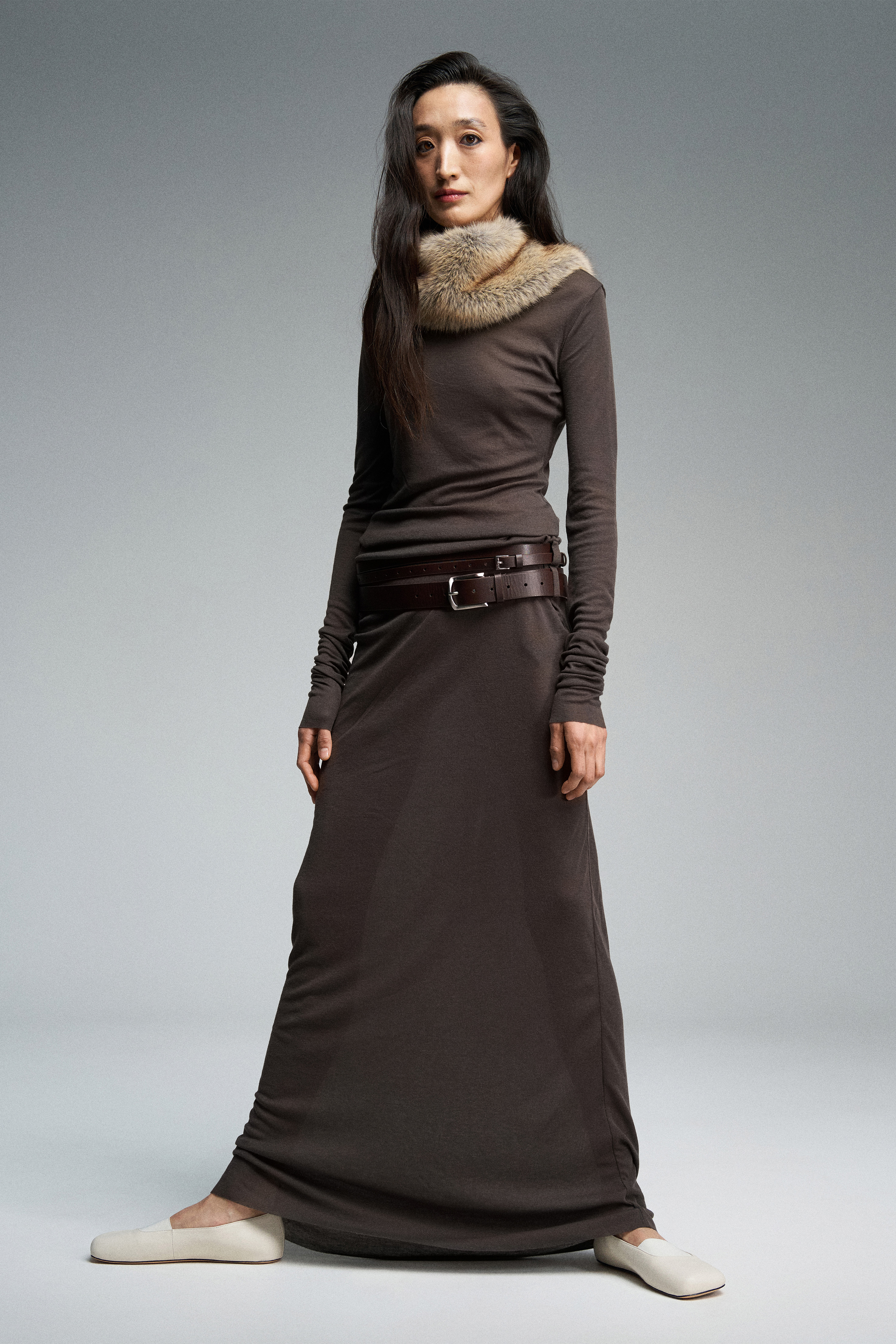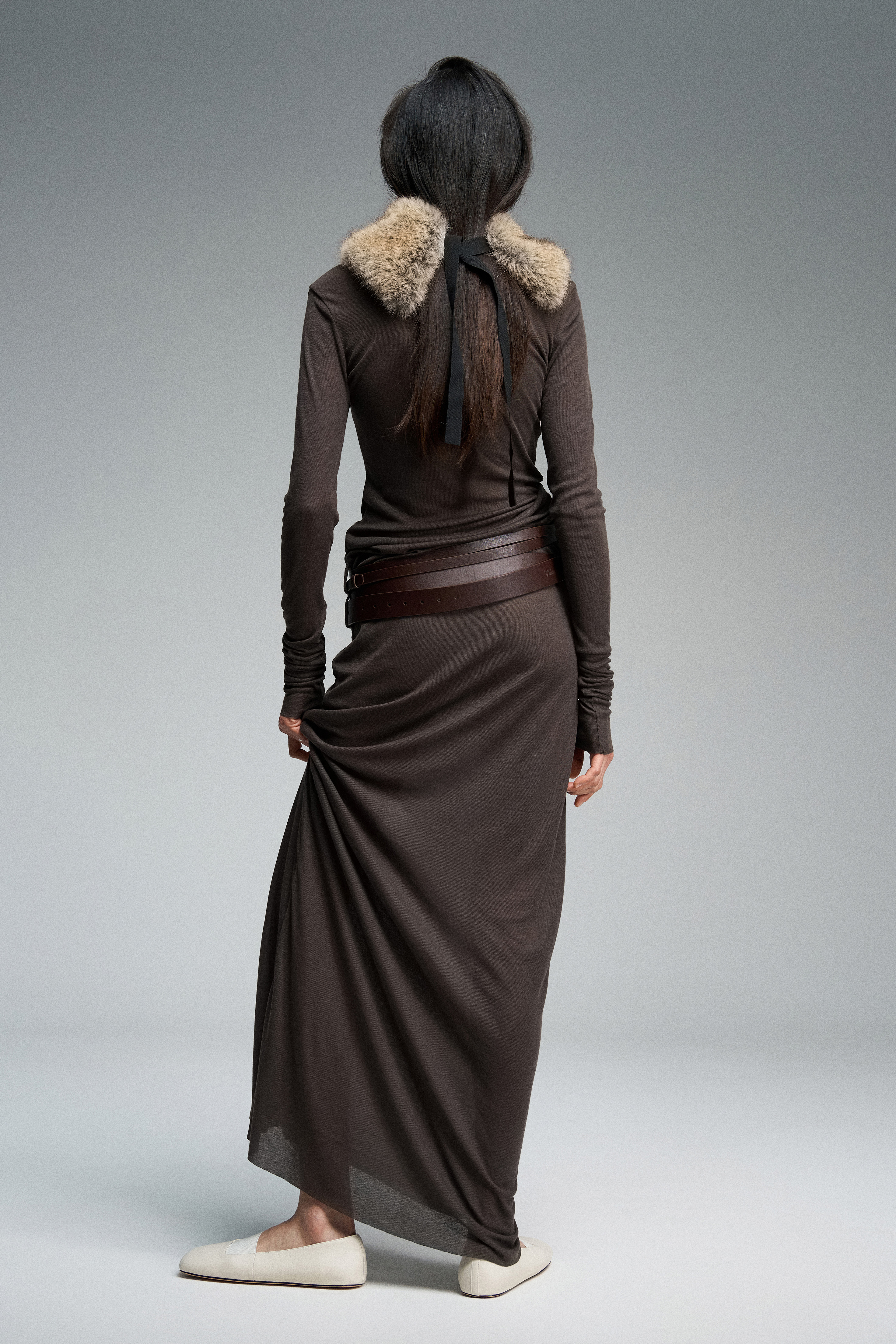 Платье длины макси из тонкого трикотажа, дополненное двойным рядом шлевок.