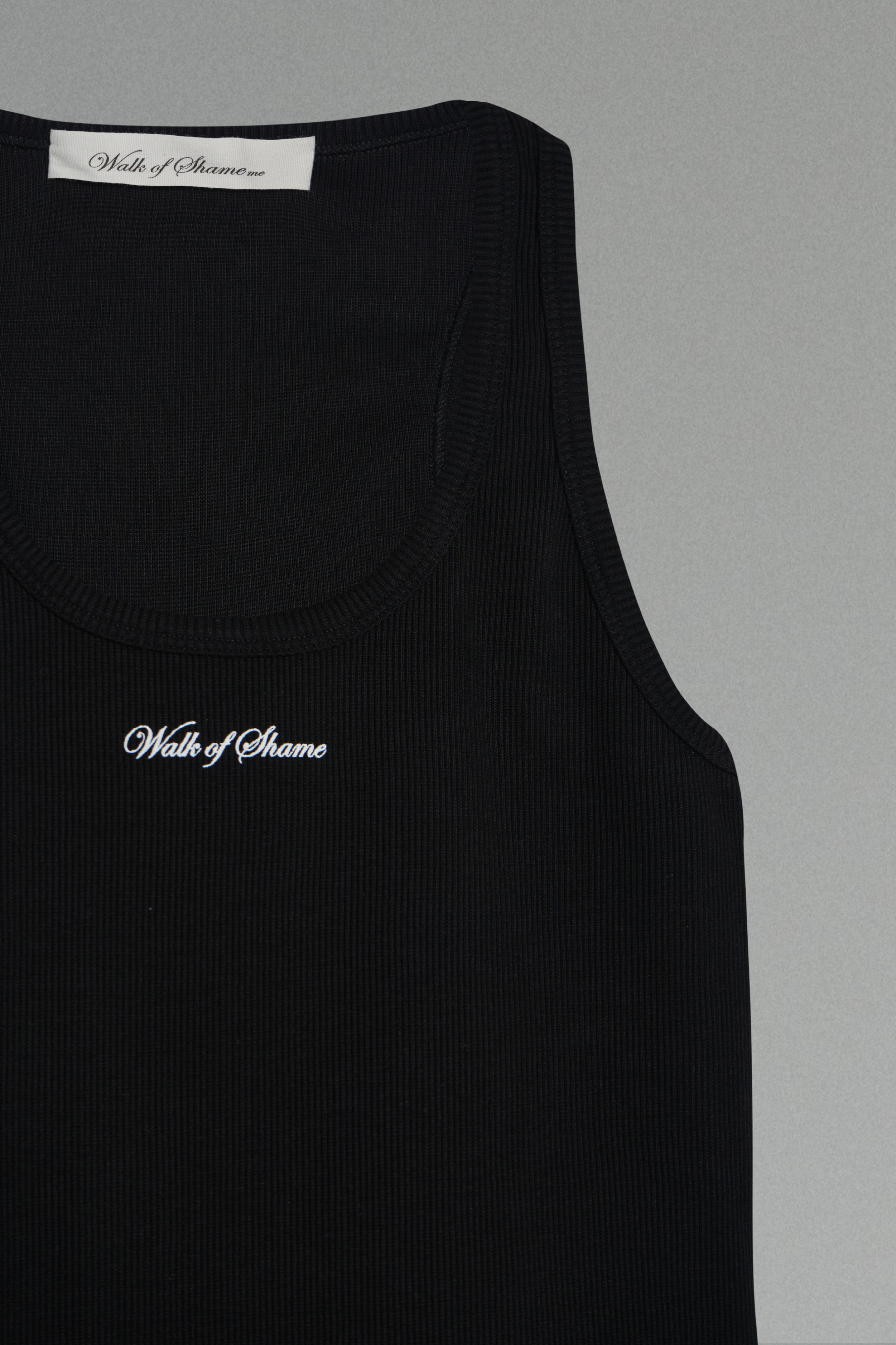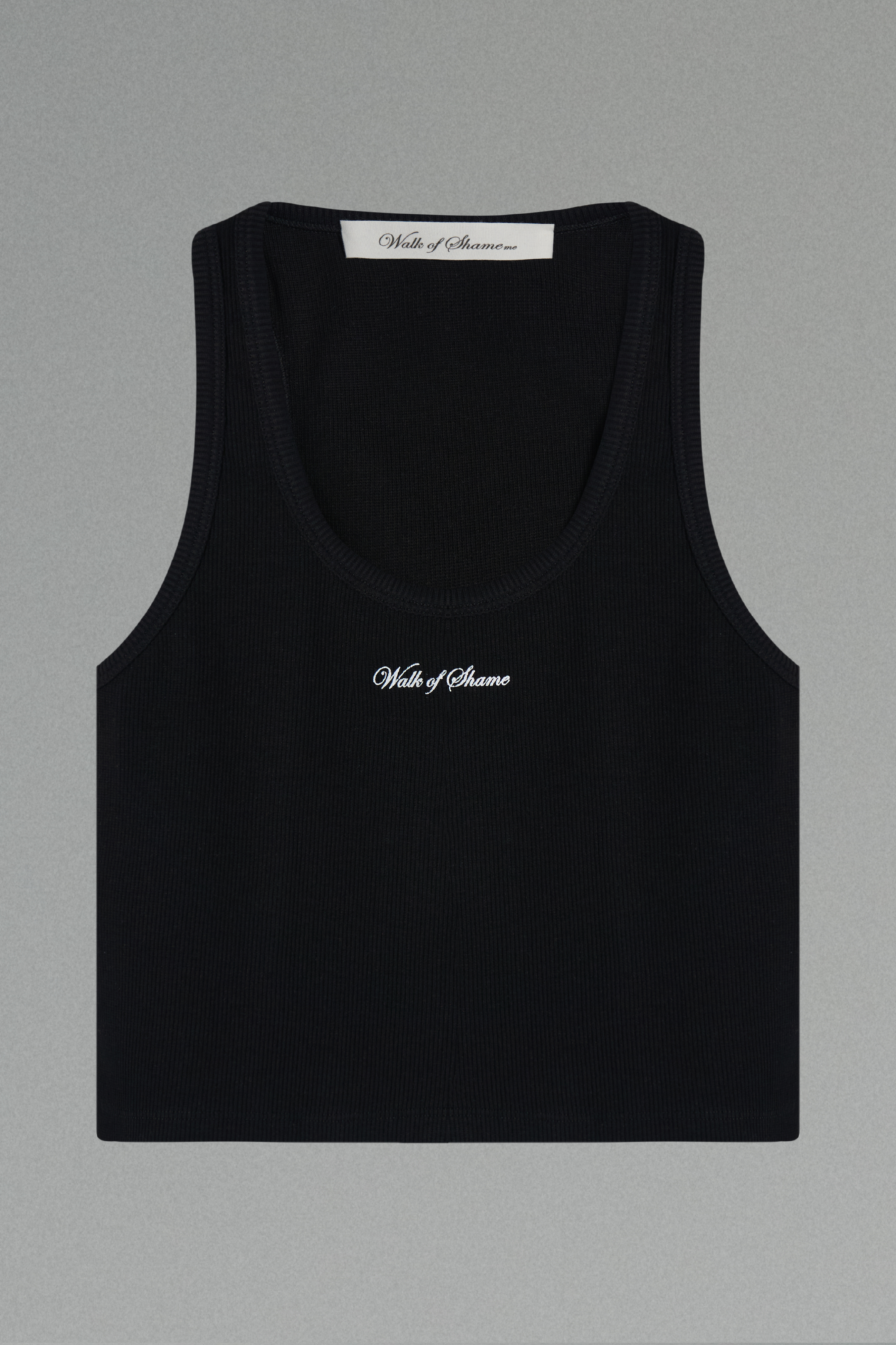 Черный кроп-топ c логотипом бренда Walk of Shame. Модель приталенного кроя.