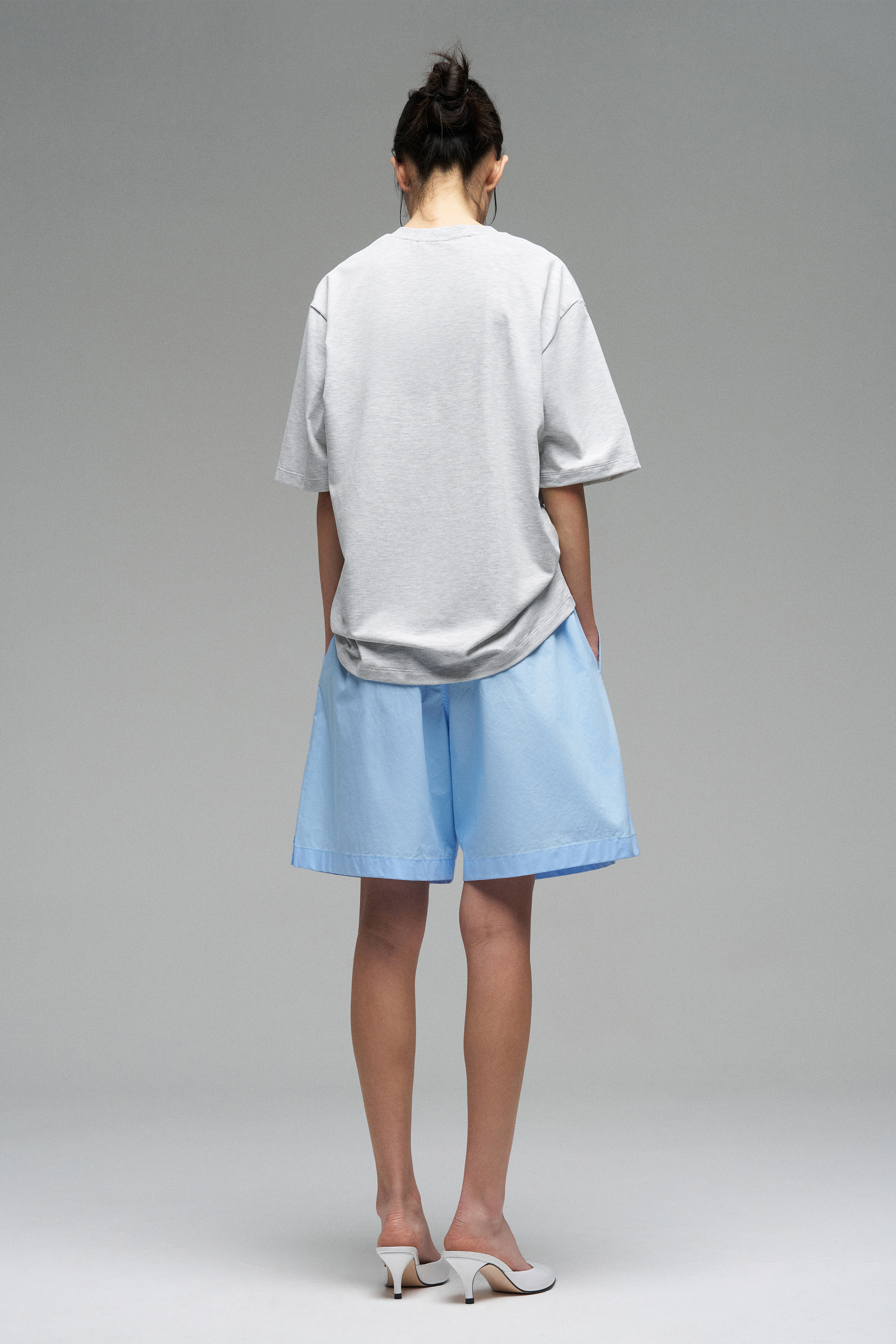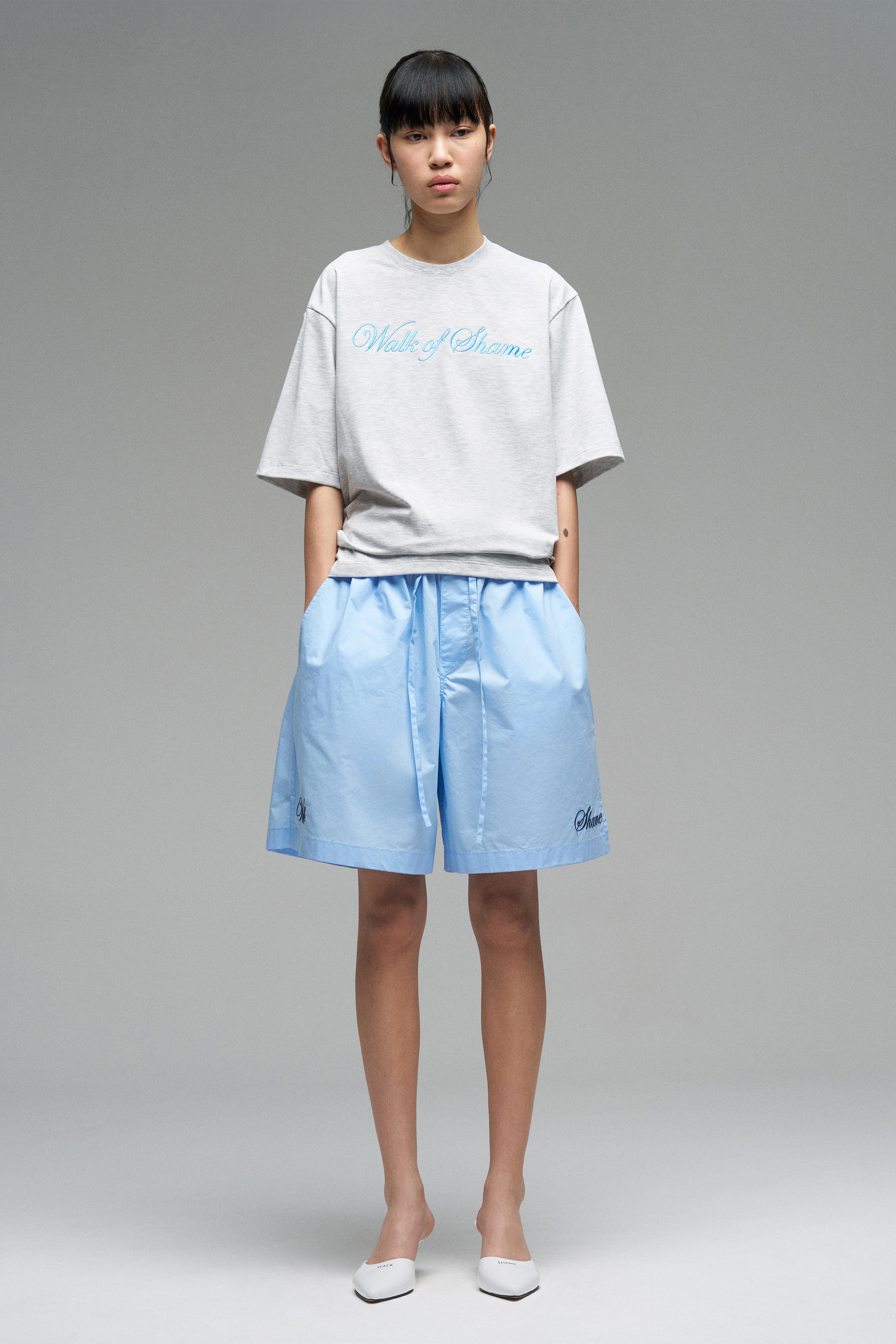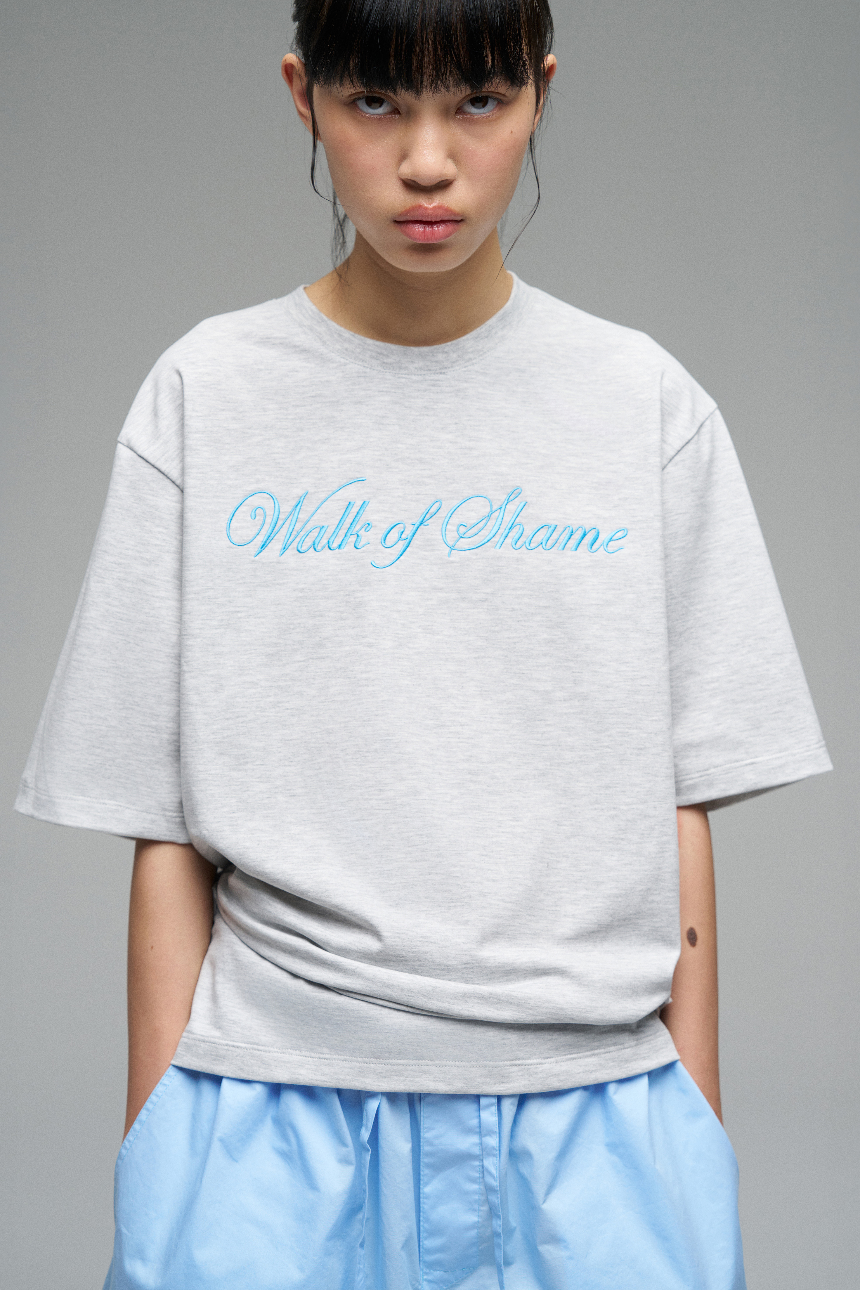 Футболка свободного кроя с вышивкой голубого цвета «Walk of Shame». Спущенная линия плеч, прямой крой.