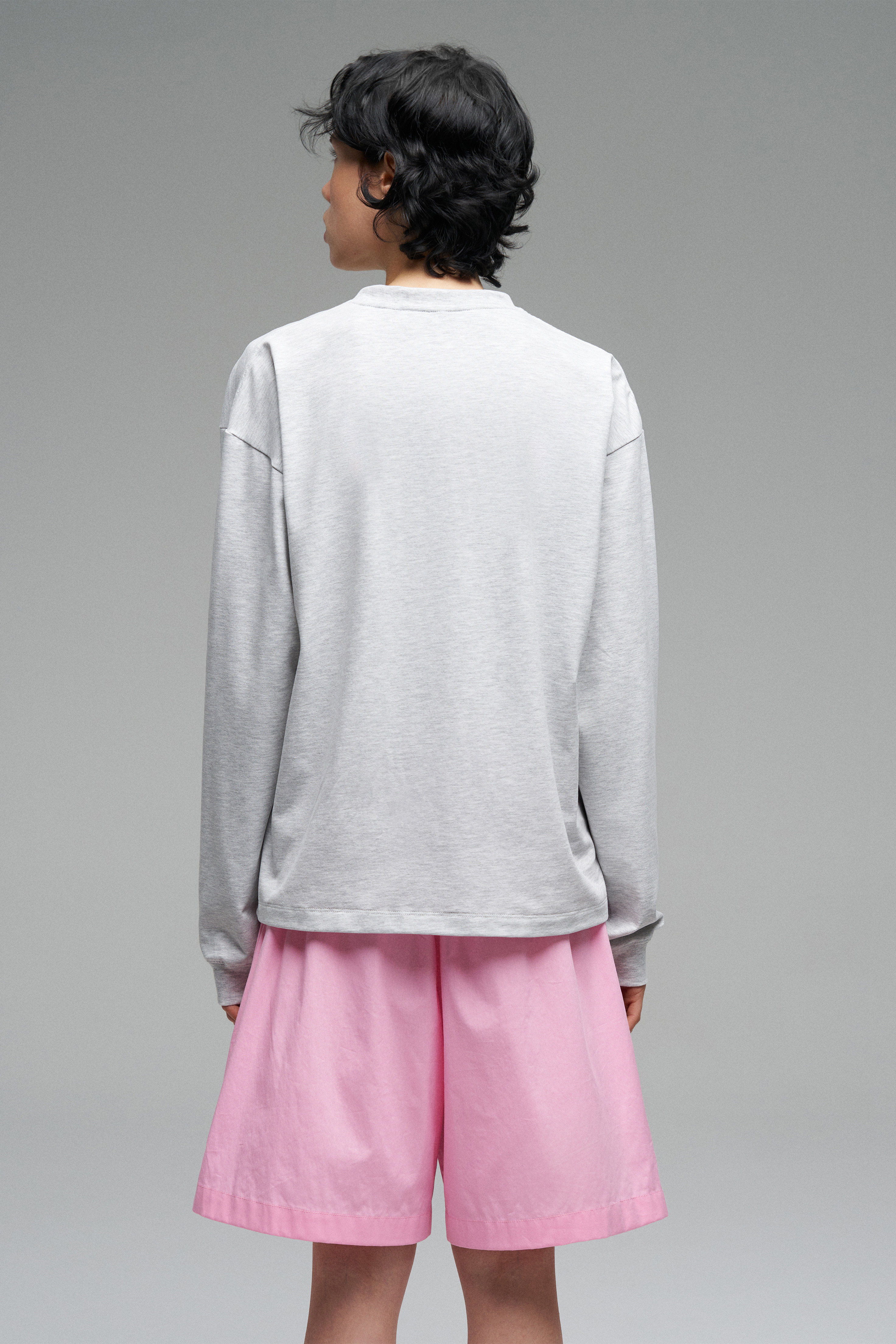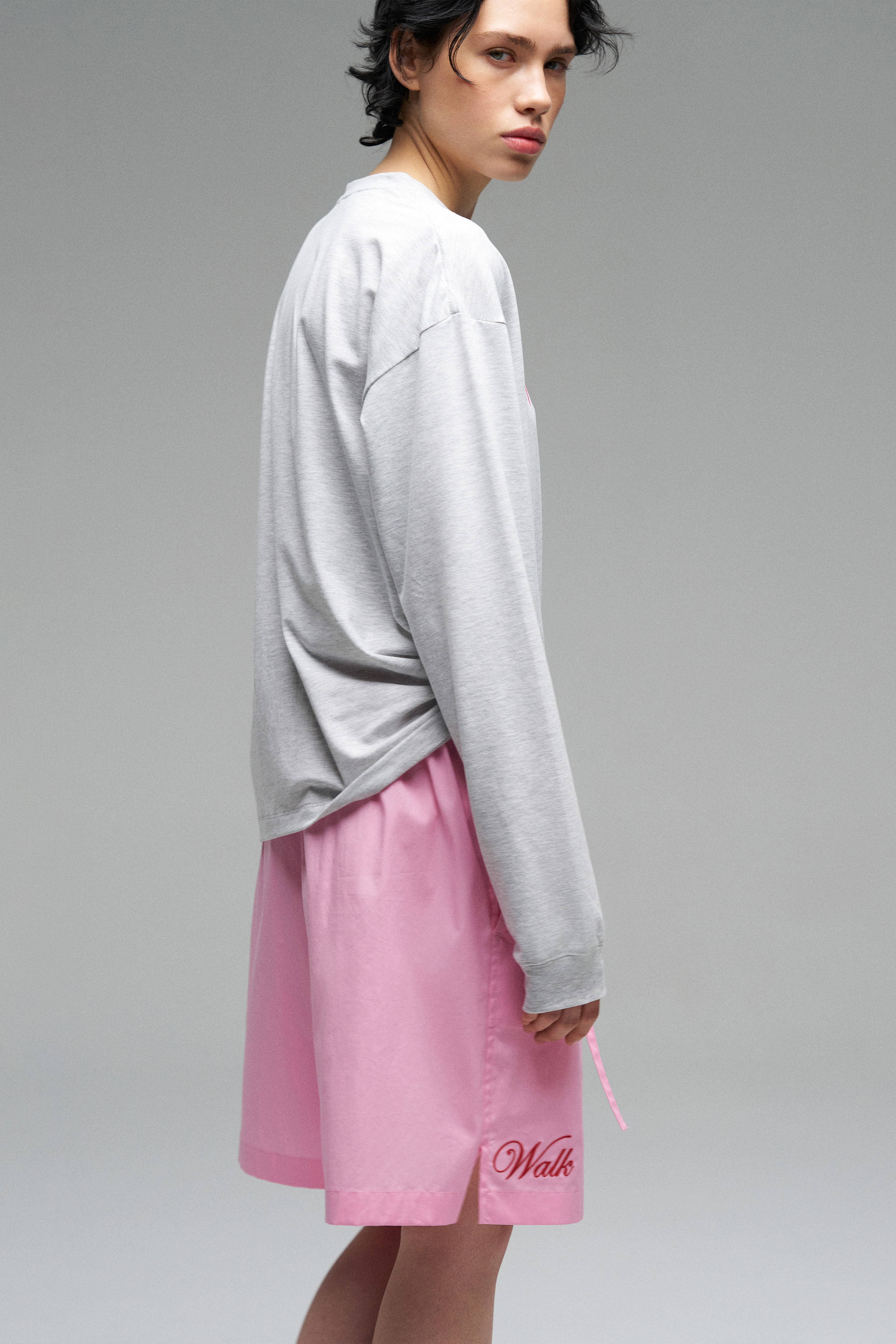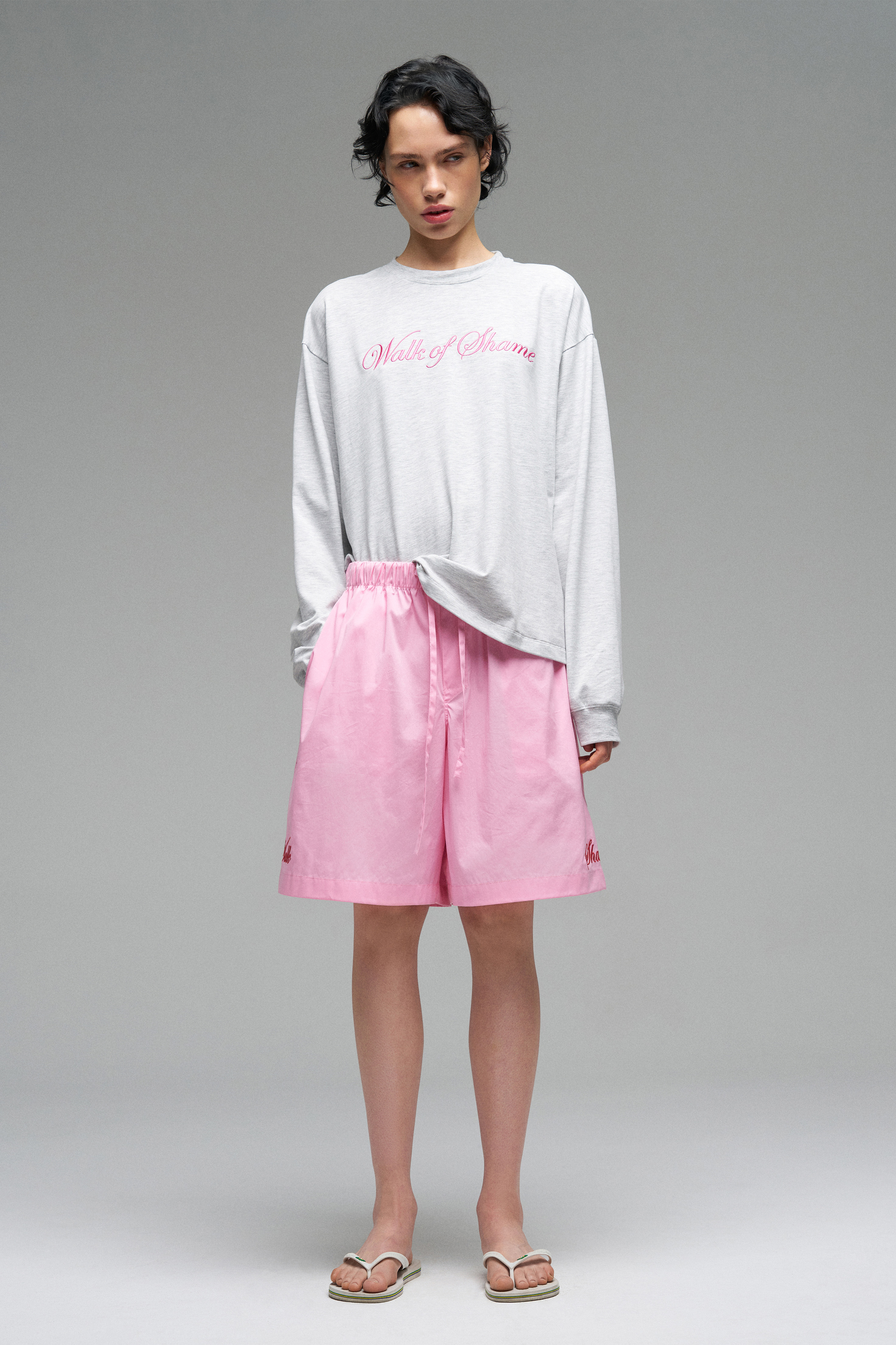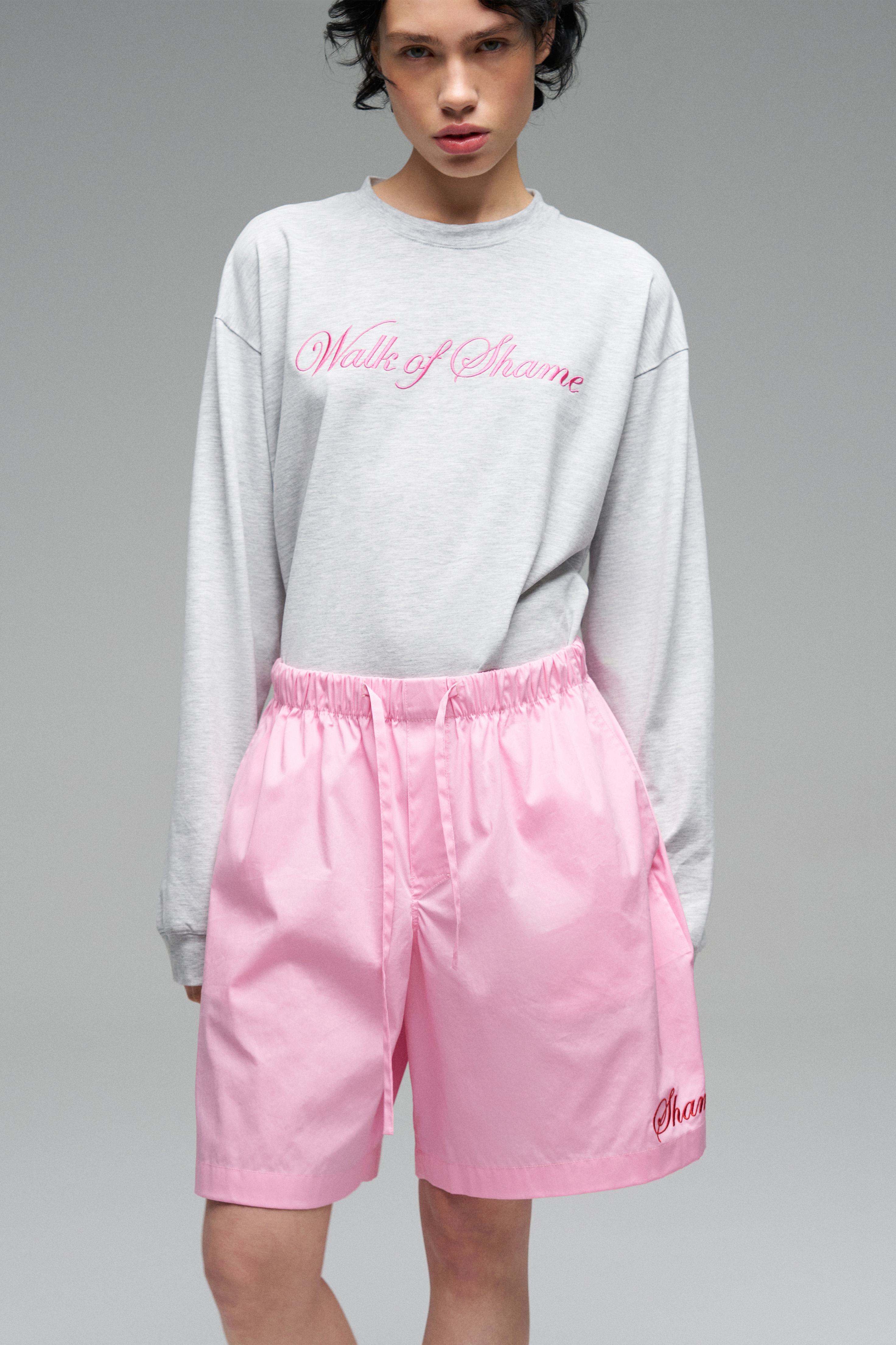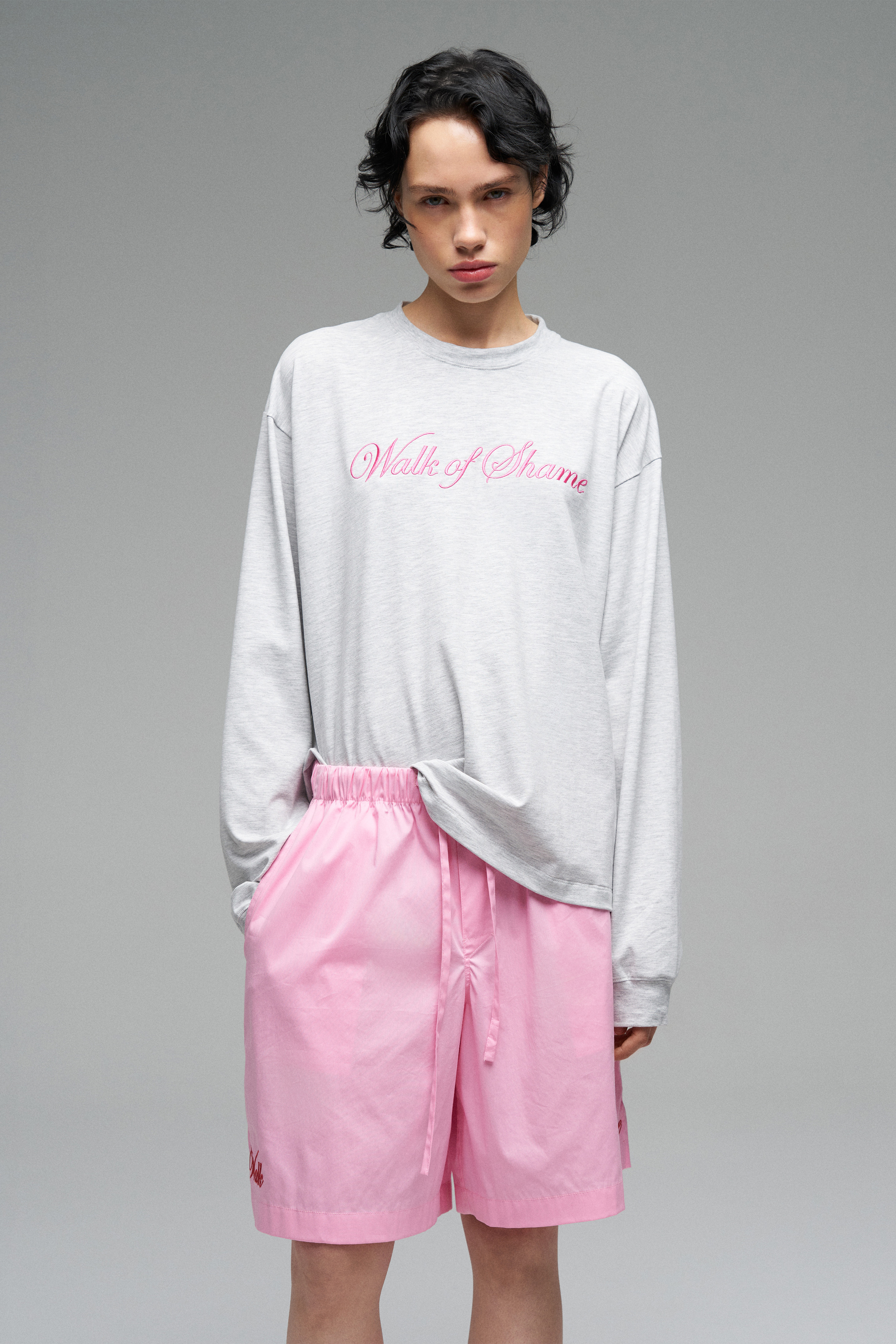Лонгслив с эластичными манжетами на рукавах и горловине. Модель с контрастной вышивкой розового цвета «Walk of Shame». Лонгслив прямого кроя со спущенной линией плеч.
