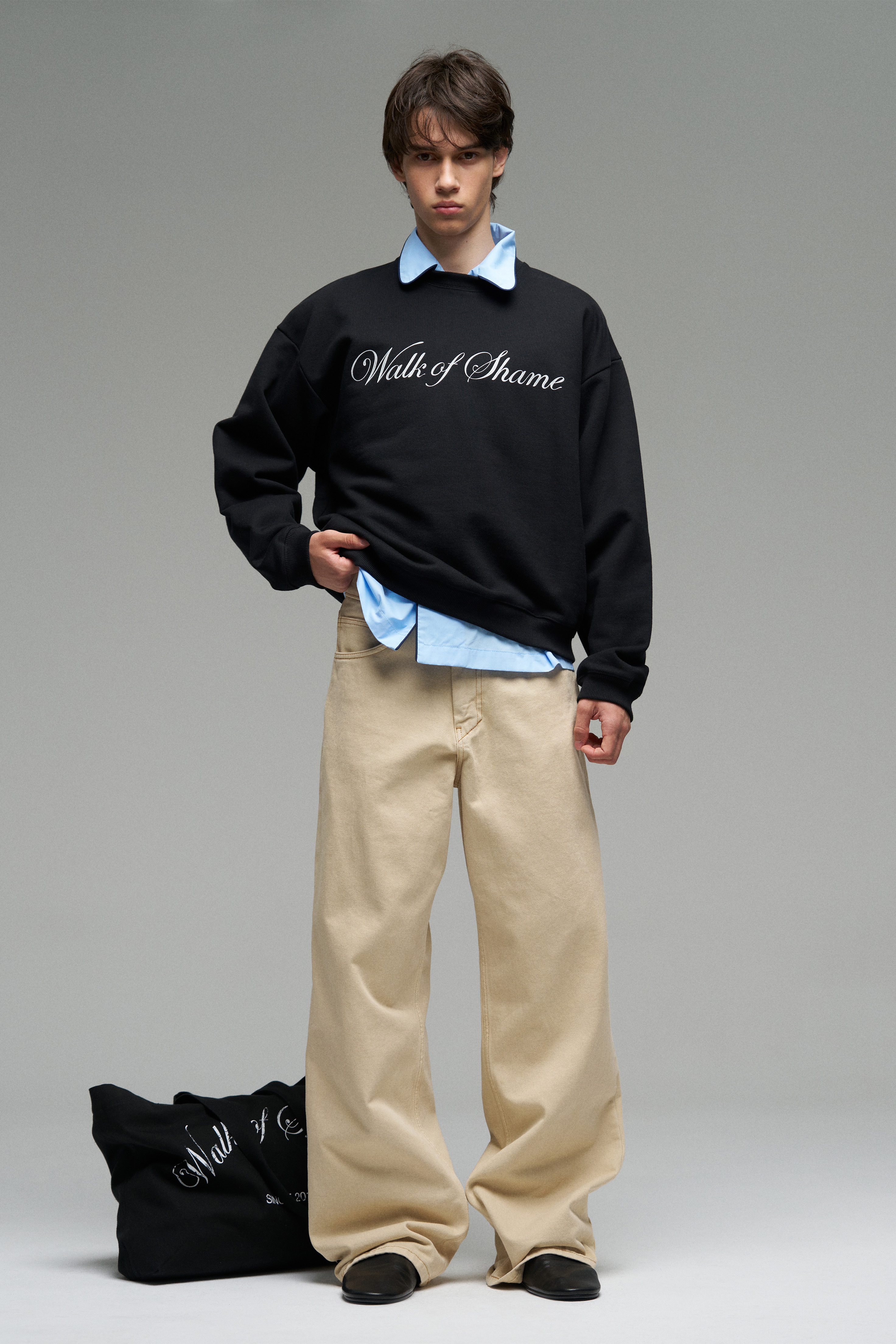 Свитшот свободного кроя с принтом "Walk of Shame". Спущенная линия плеч, эластичные манжеты.