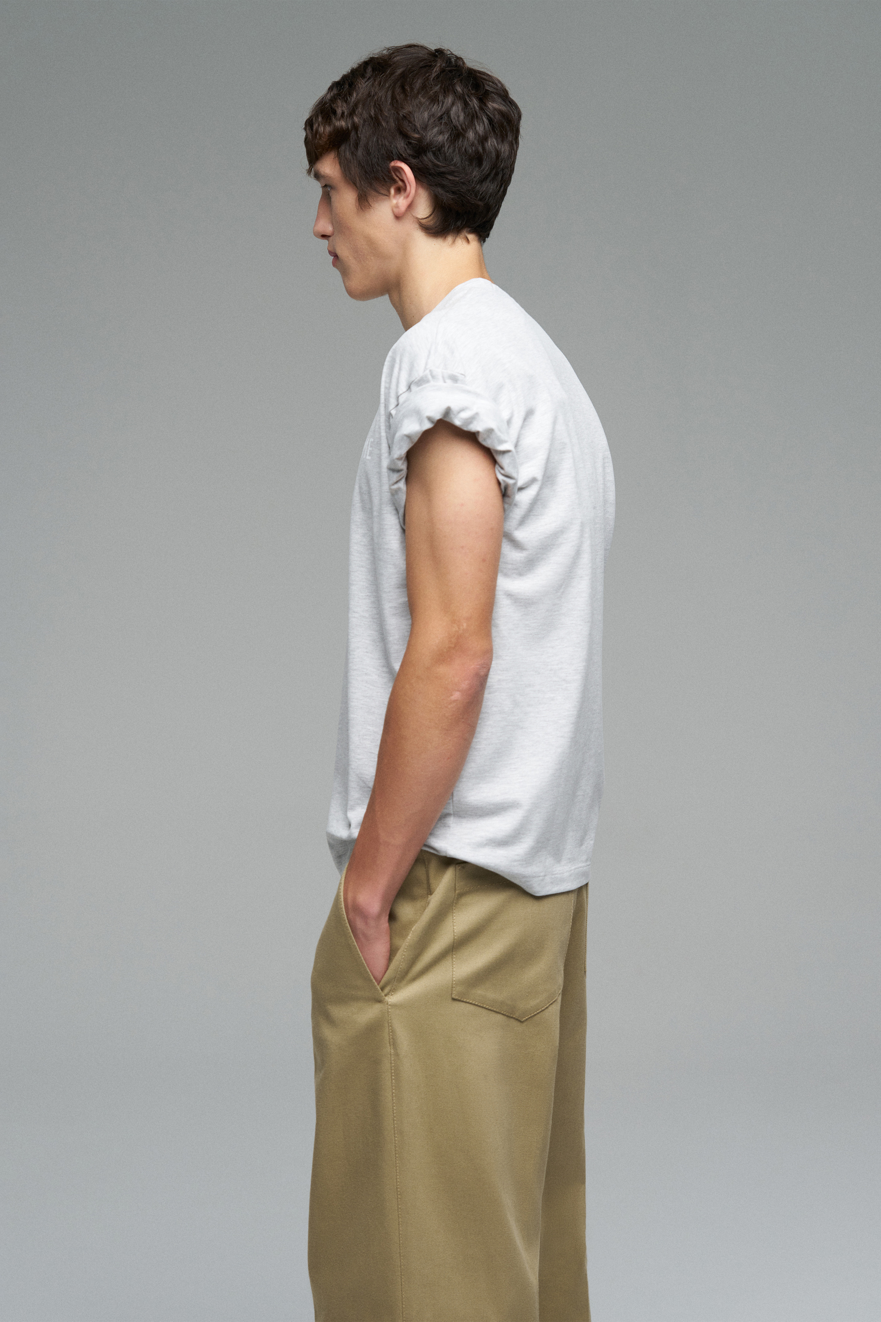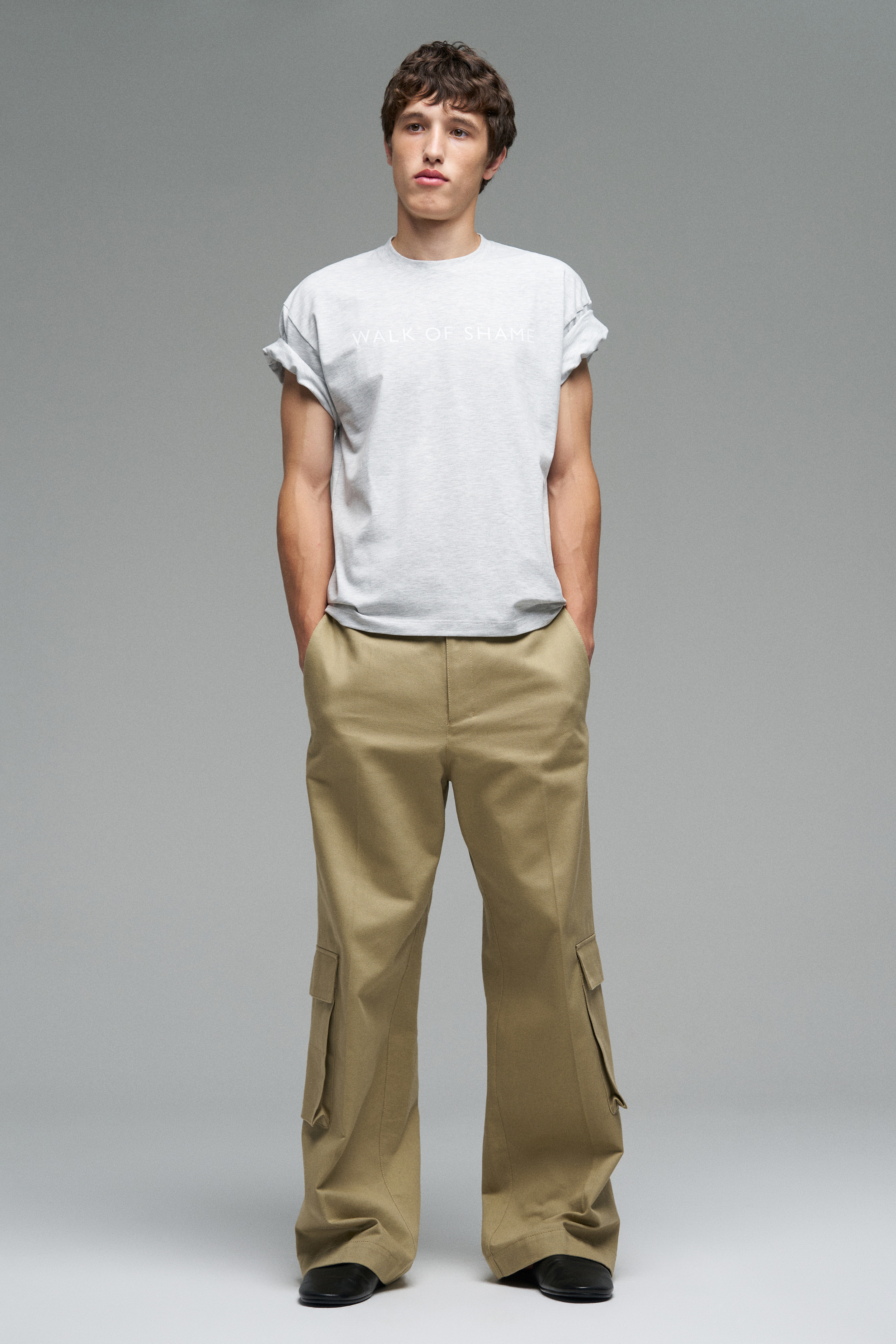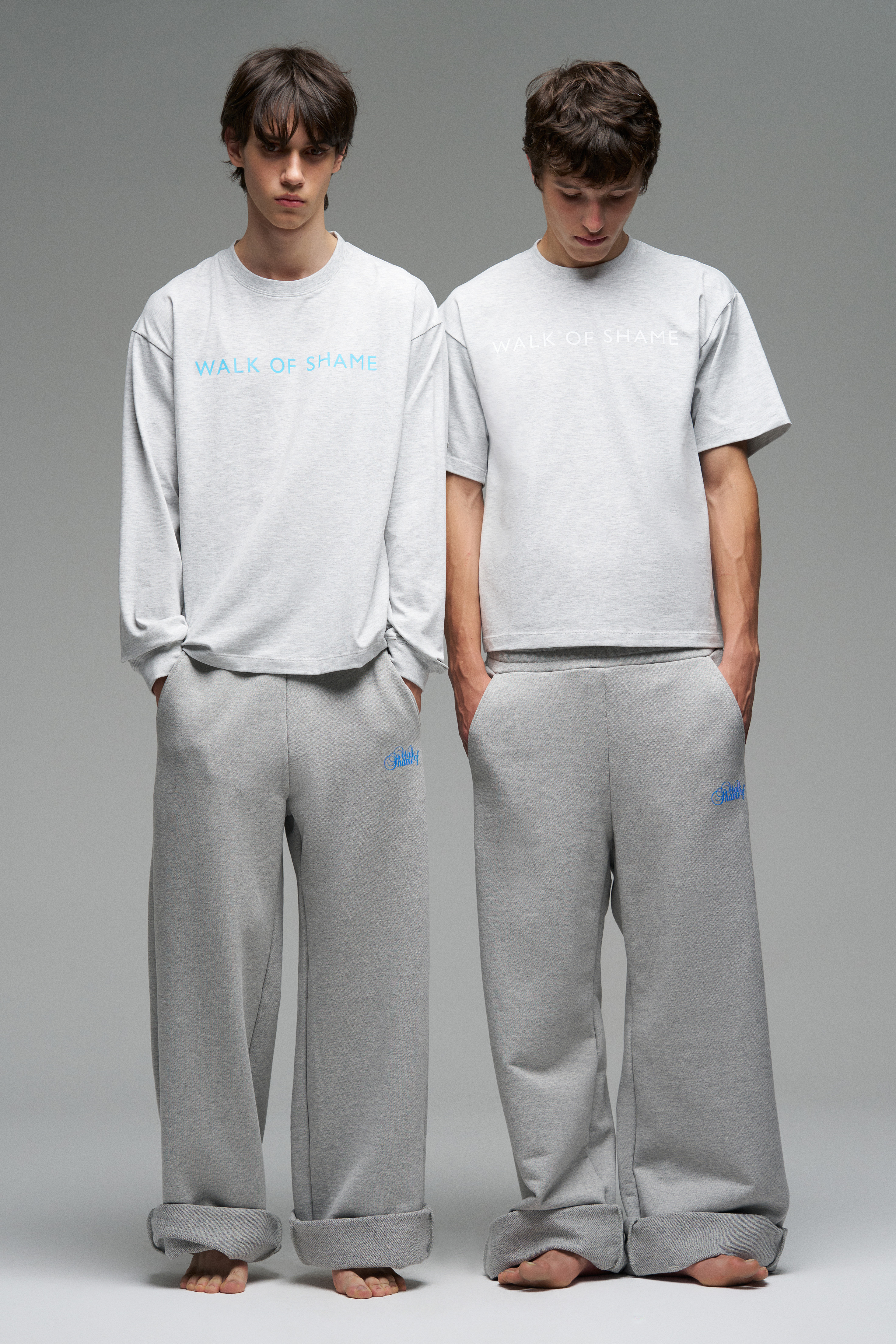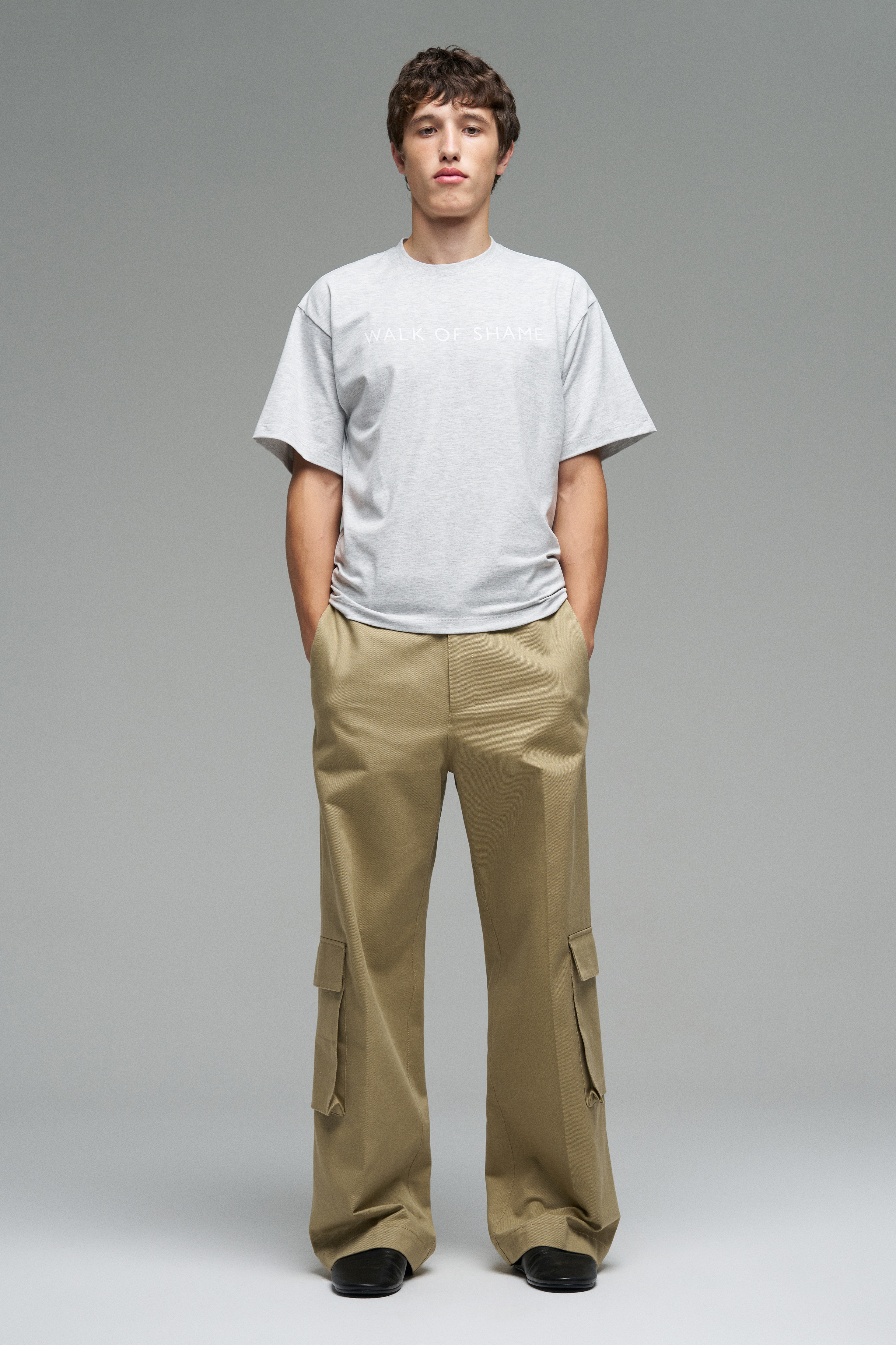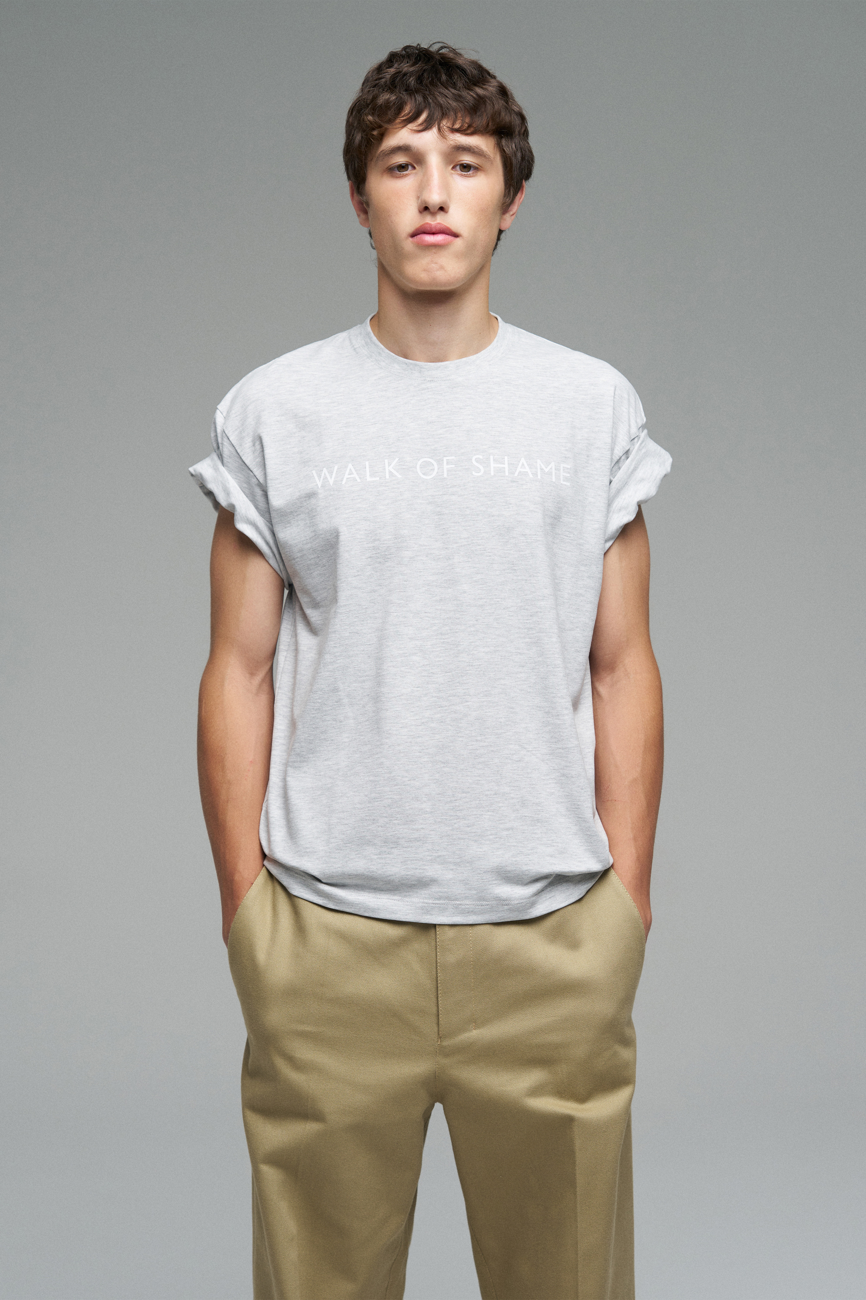 Футболка свободного кроя с шелкографией «Walk of Shame». Модель со спущенной линией плеч цвета серый меланж.