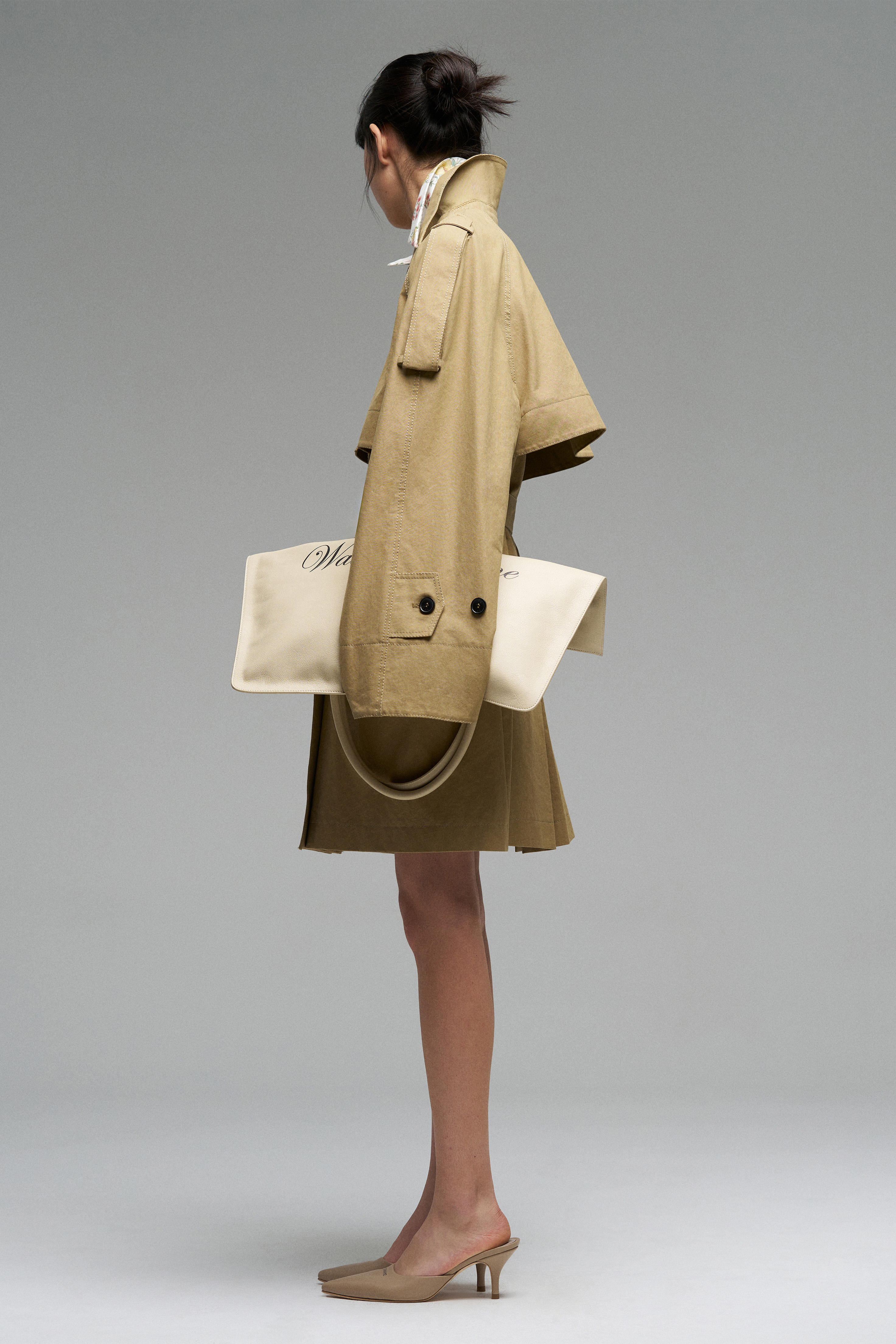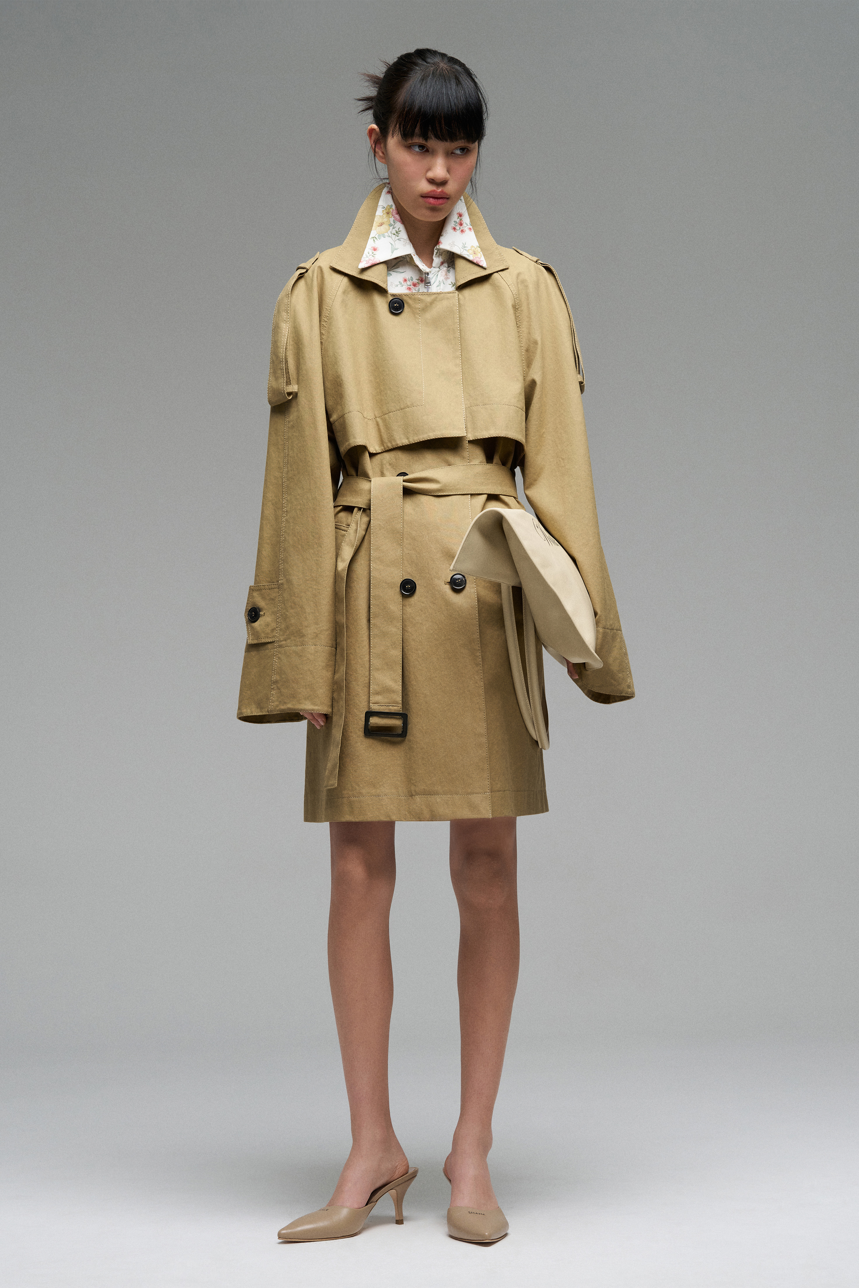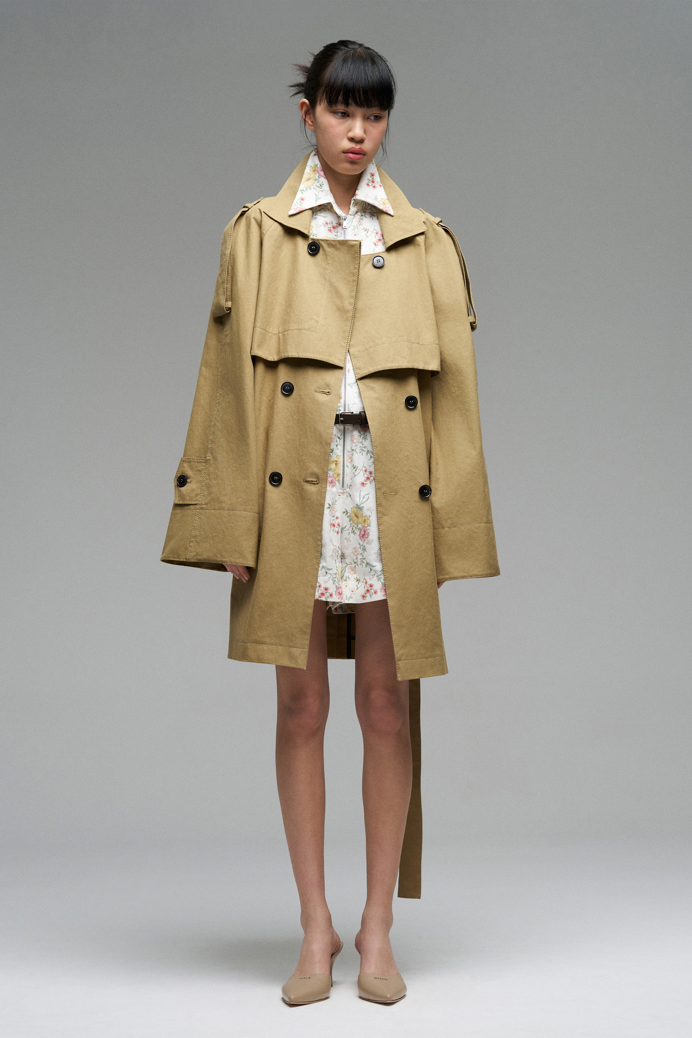 Двубортный тренч из плотного брезента. Застёжка спереди на пуговицы, пояс на талии, свободный крой.