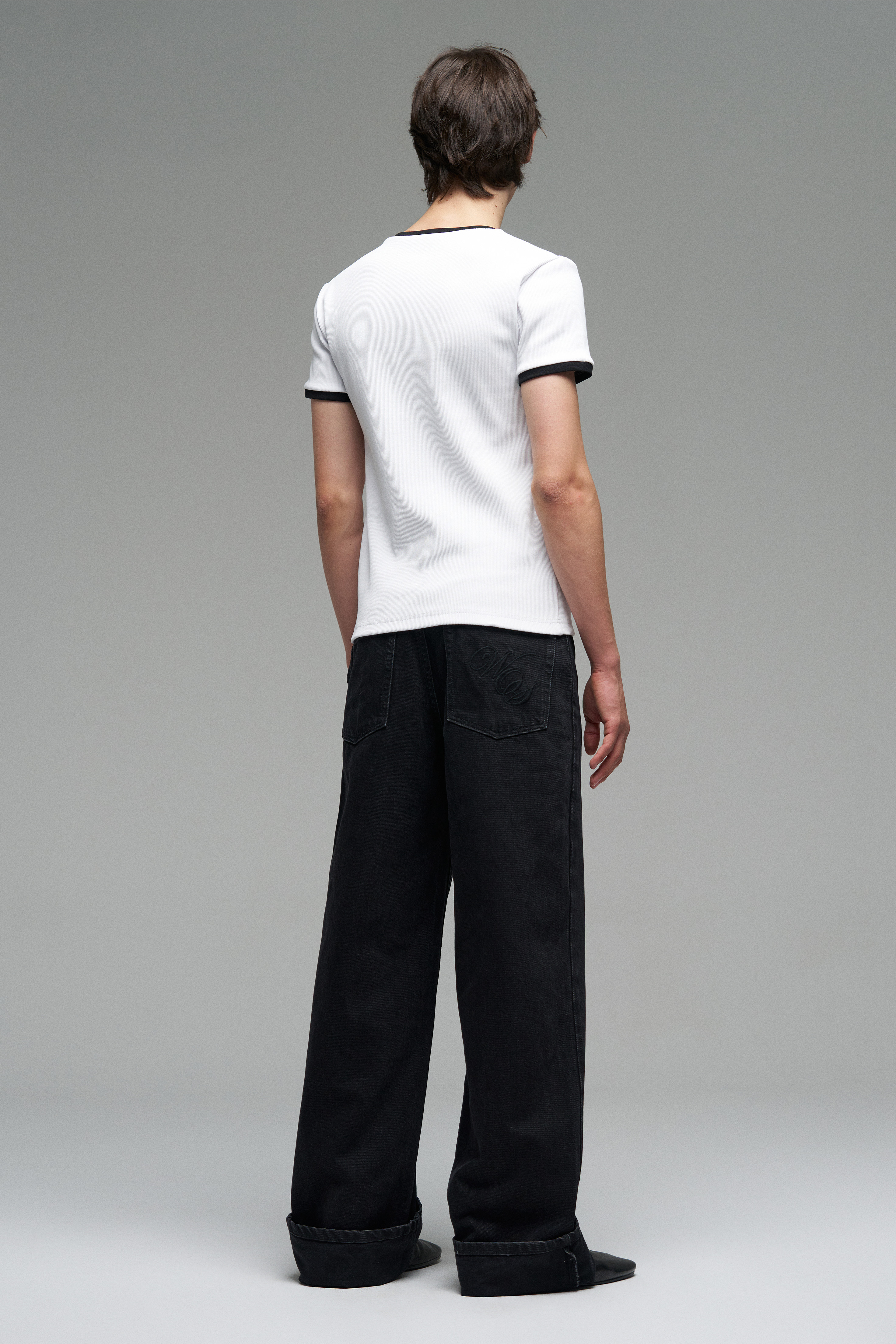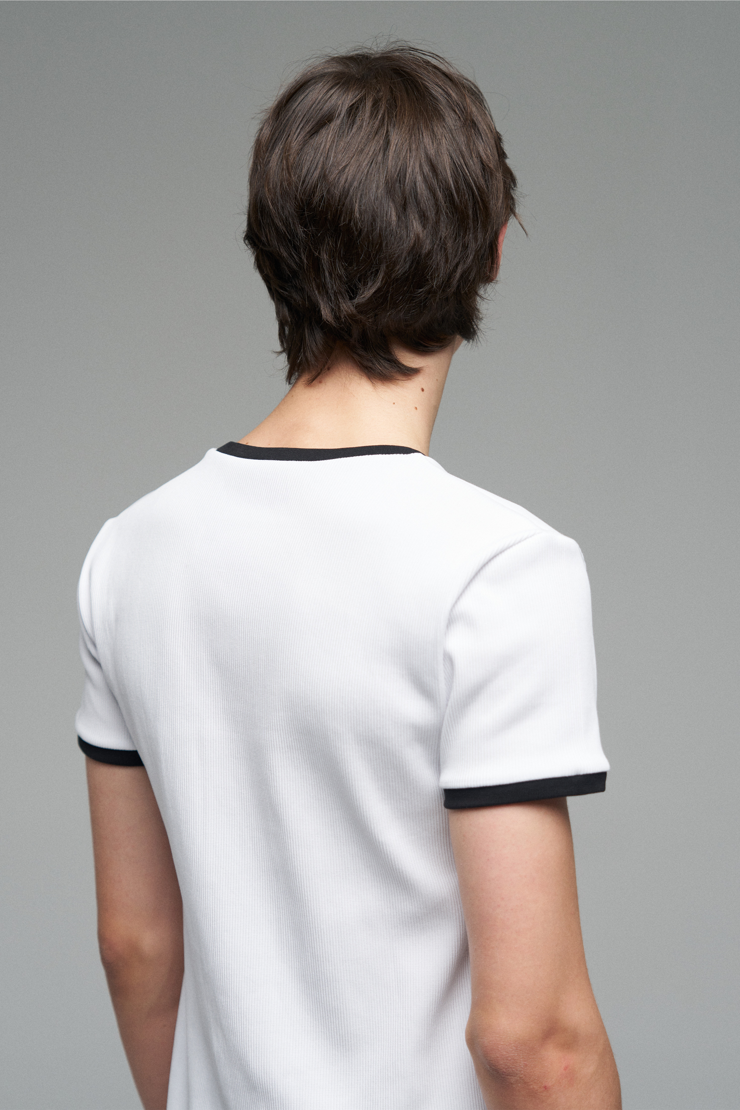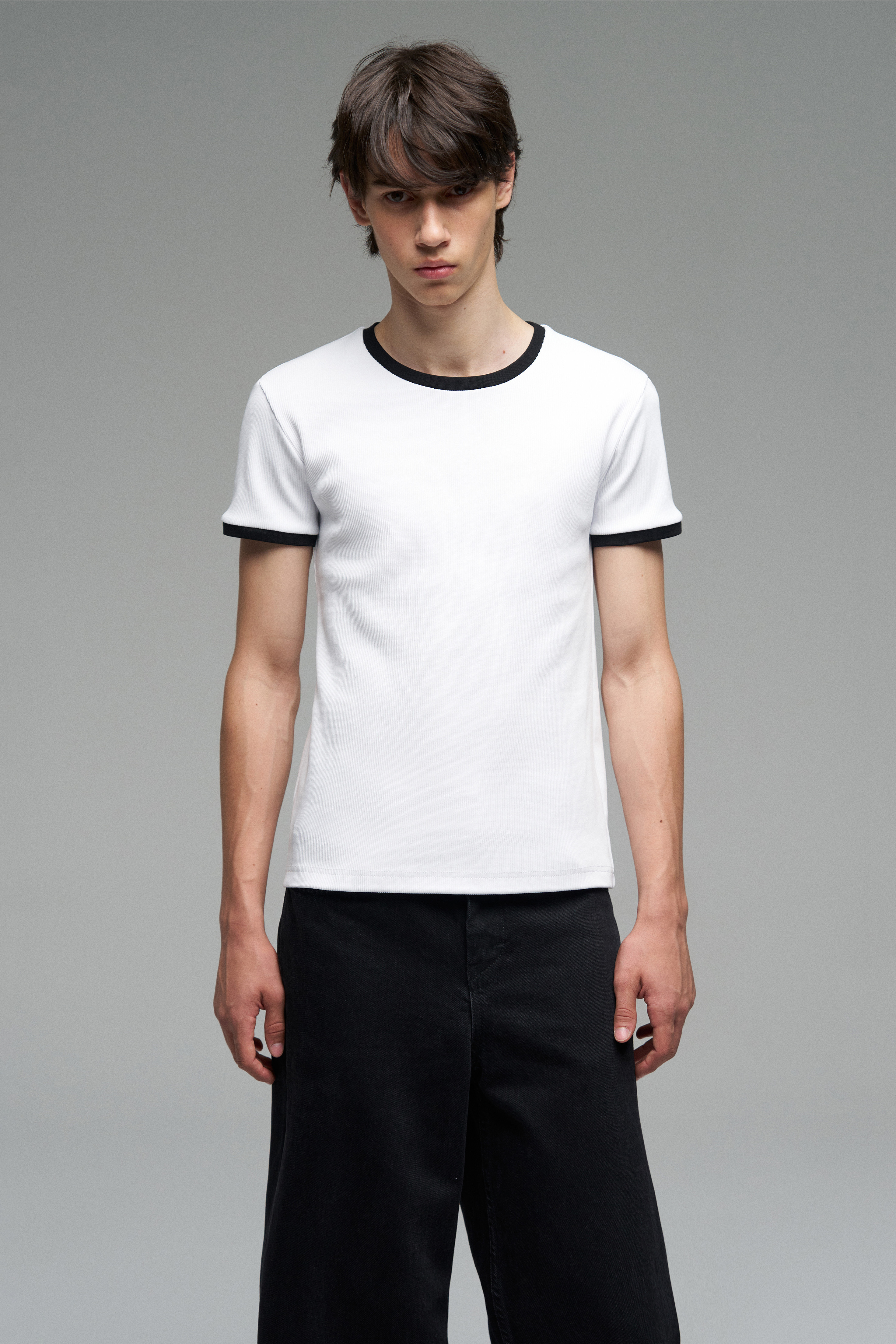 Футболка белого цвета с контрастной отделкой из черного рифлёного канта Ribbed по вороту и рукавам. Прямой силуэт, классическая посадка.
