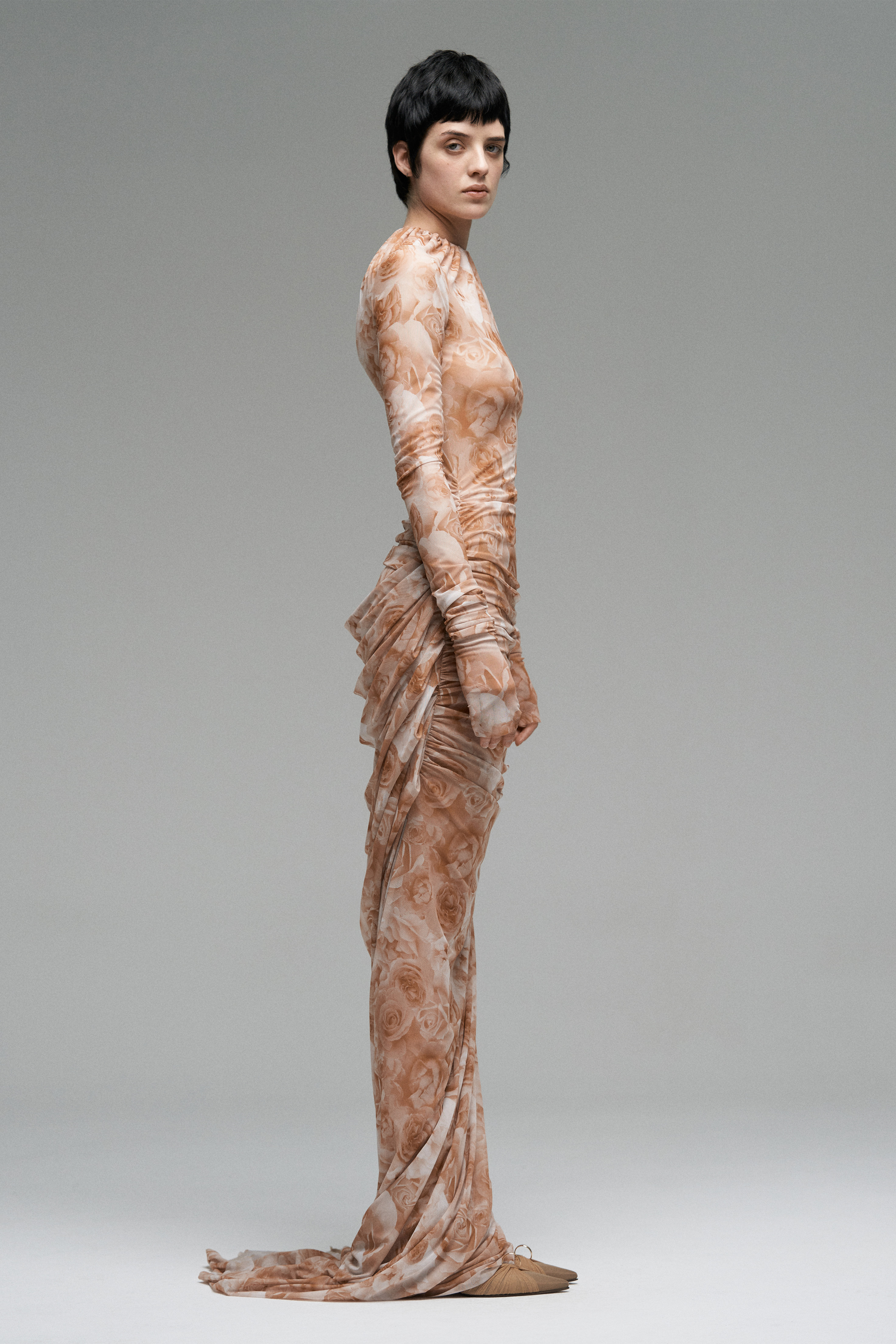 Длинные перчатки из эластичной ткани с плотным прилеганием по всей длине руки. Мягкий материал обеспечивает комфортную посадку и свободу движений. Принт розы.