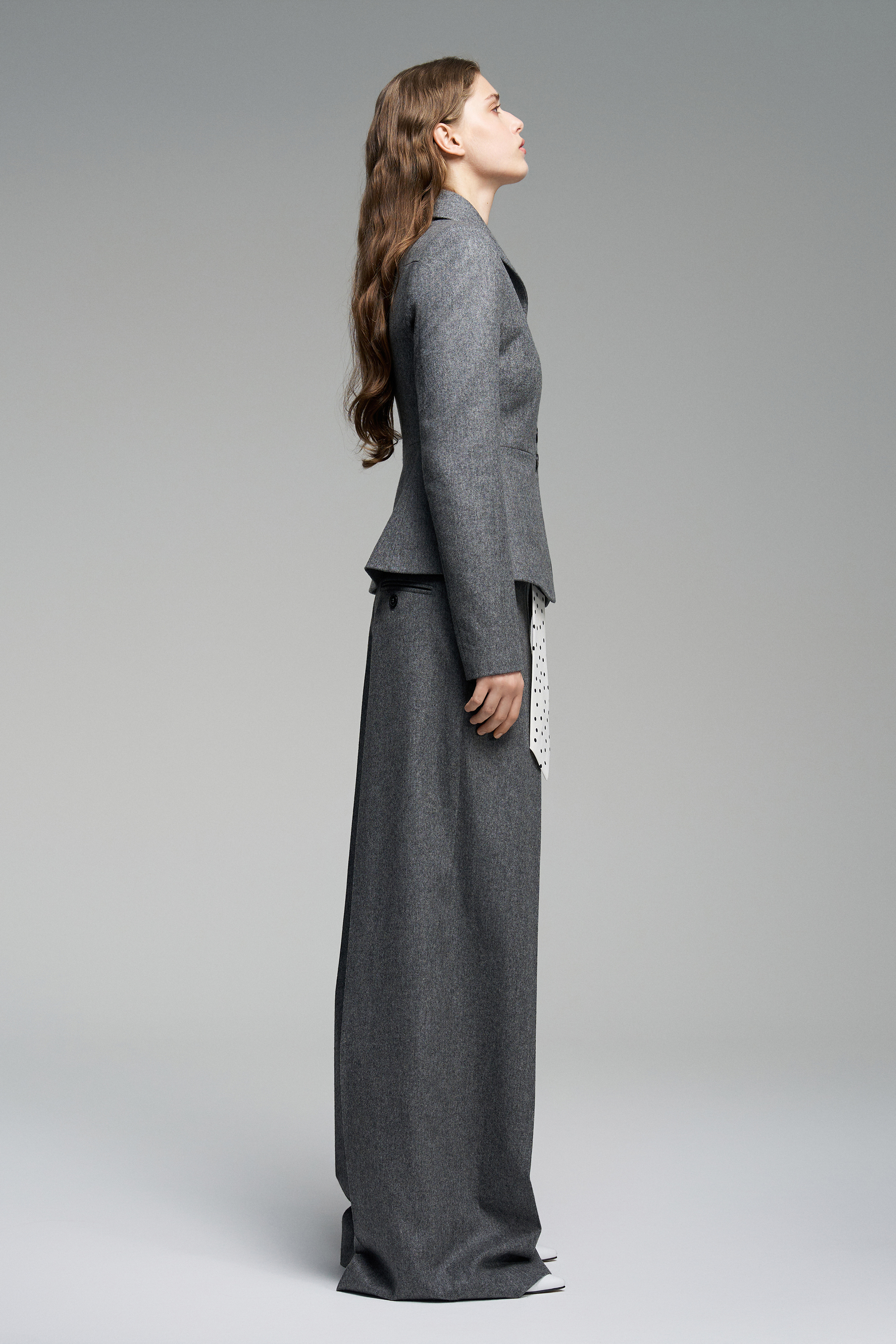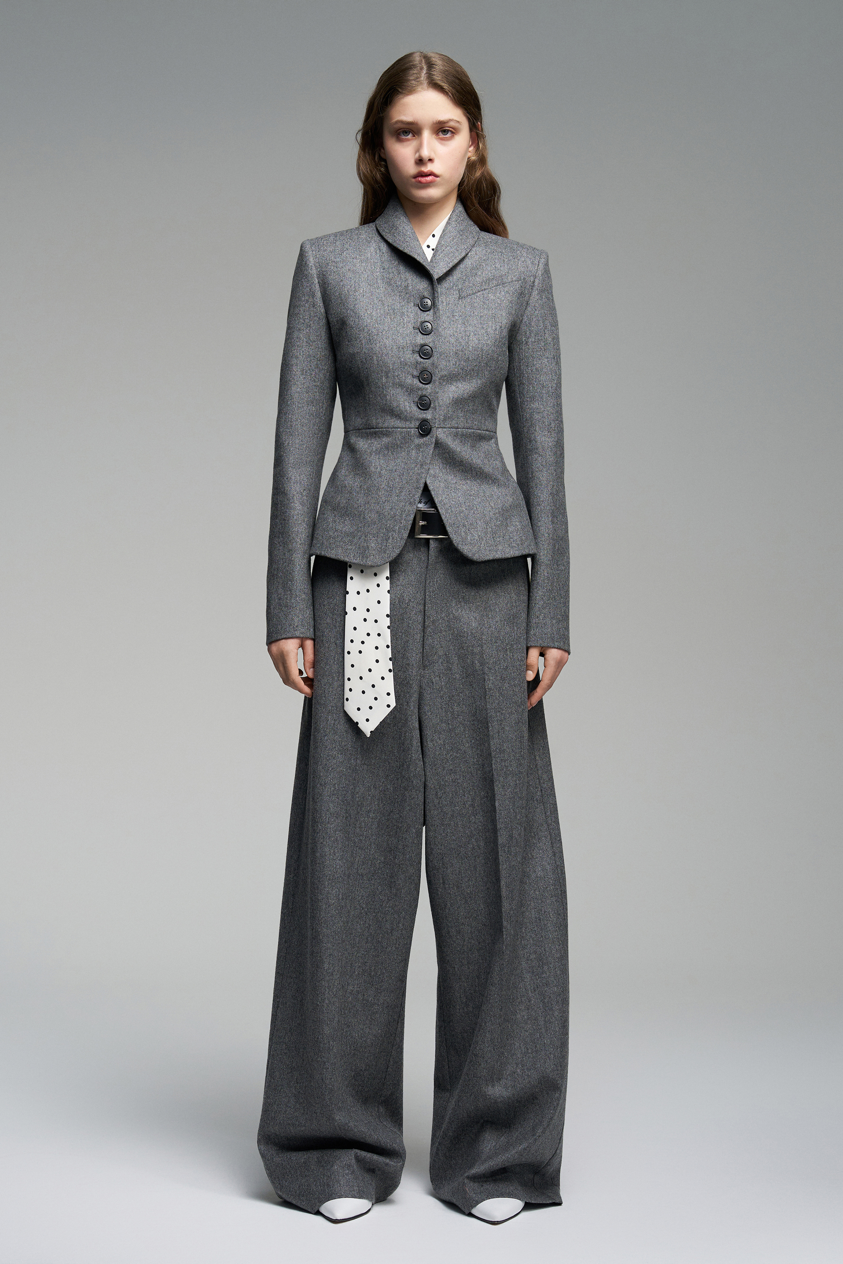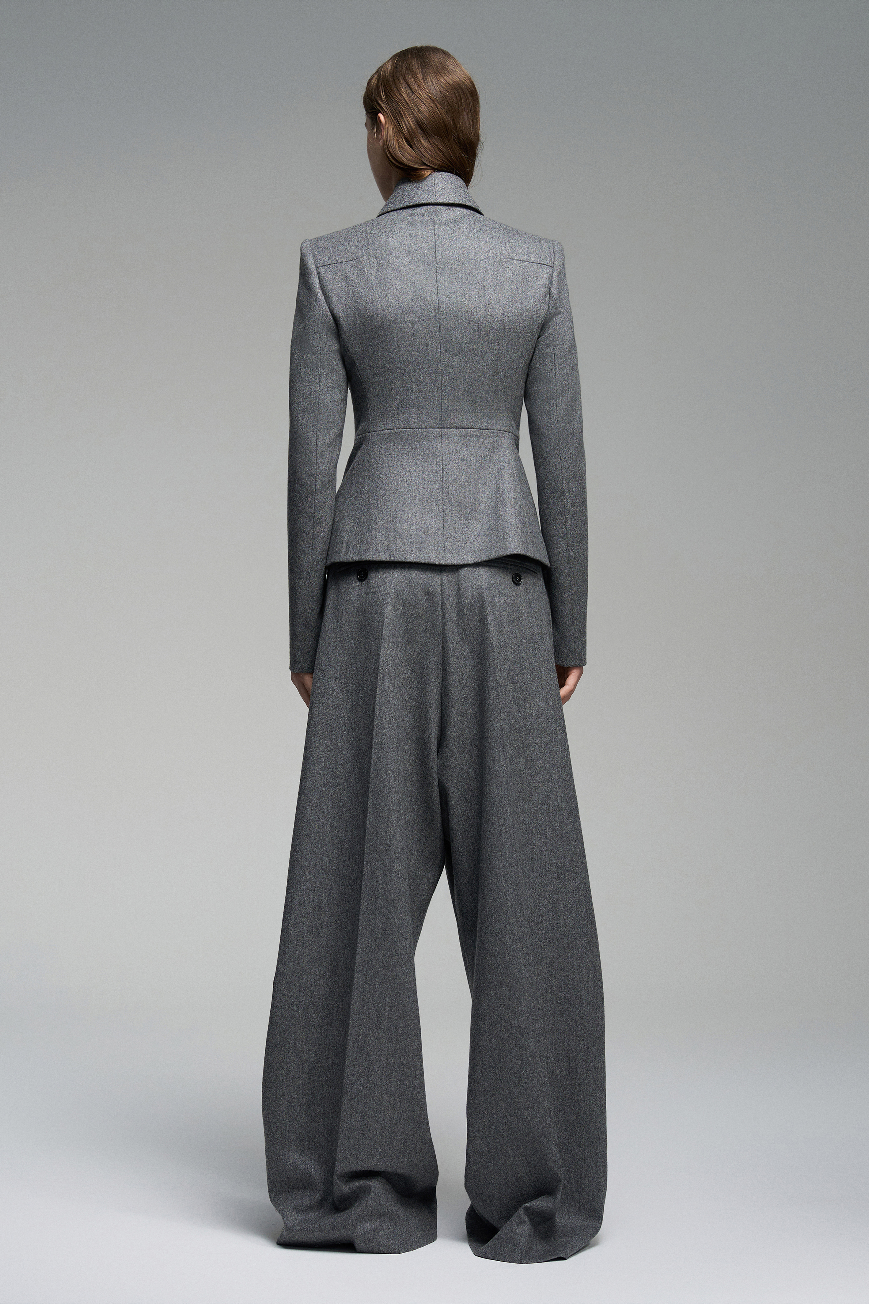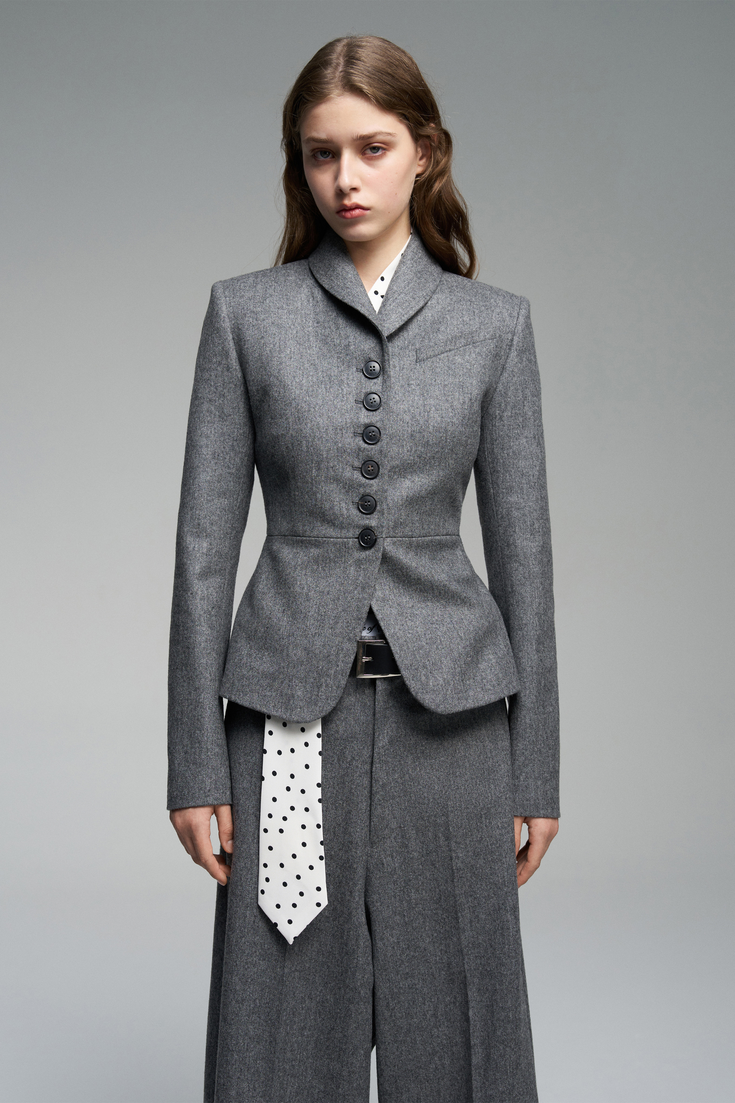 Приталенный жакет из мягкой шерсти, подчеркивающий силуэт. Застёгивается на обтянутые той же тканью пуговицы.