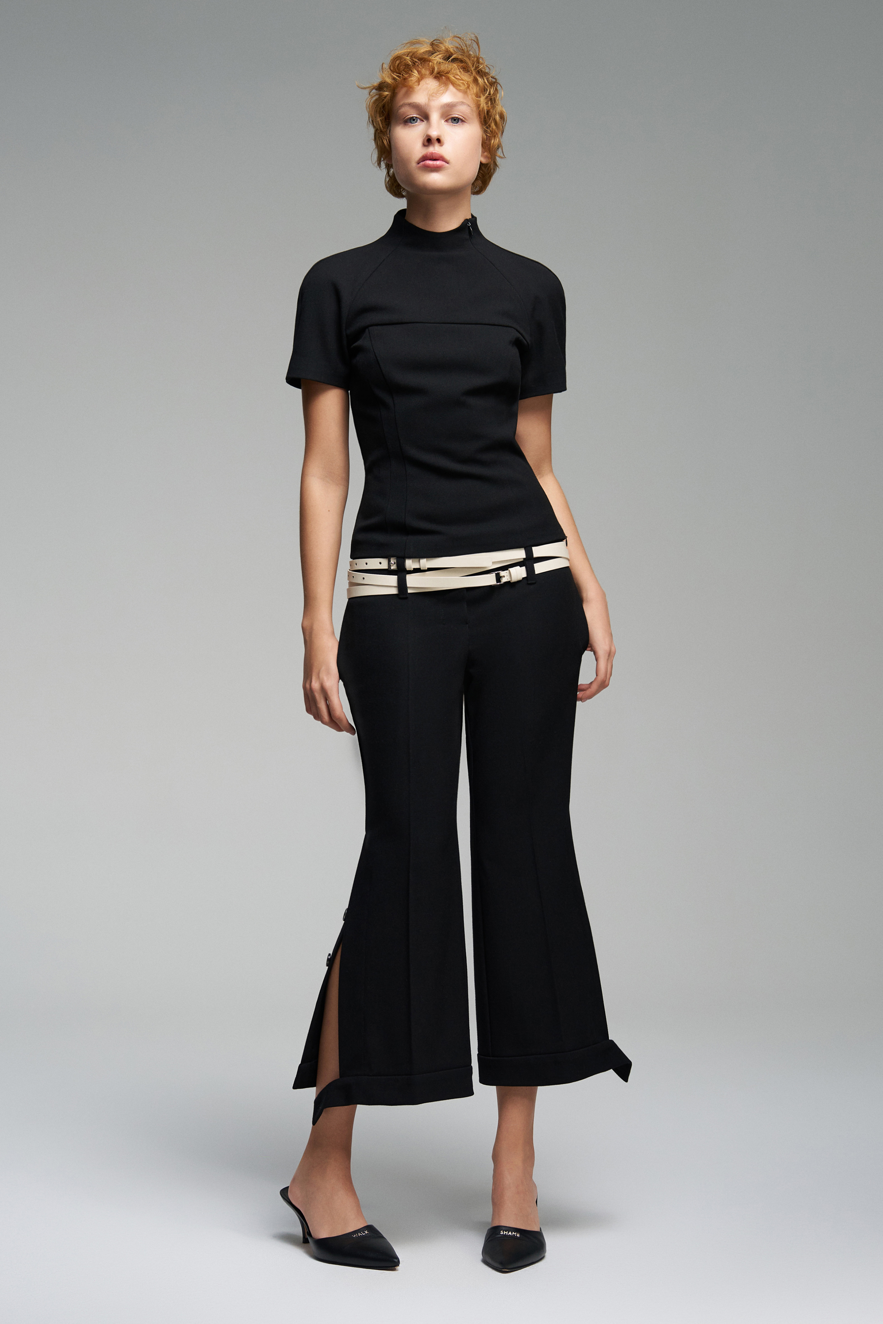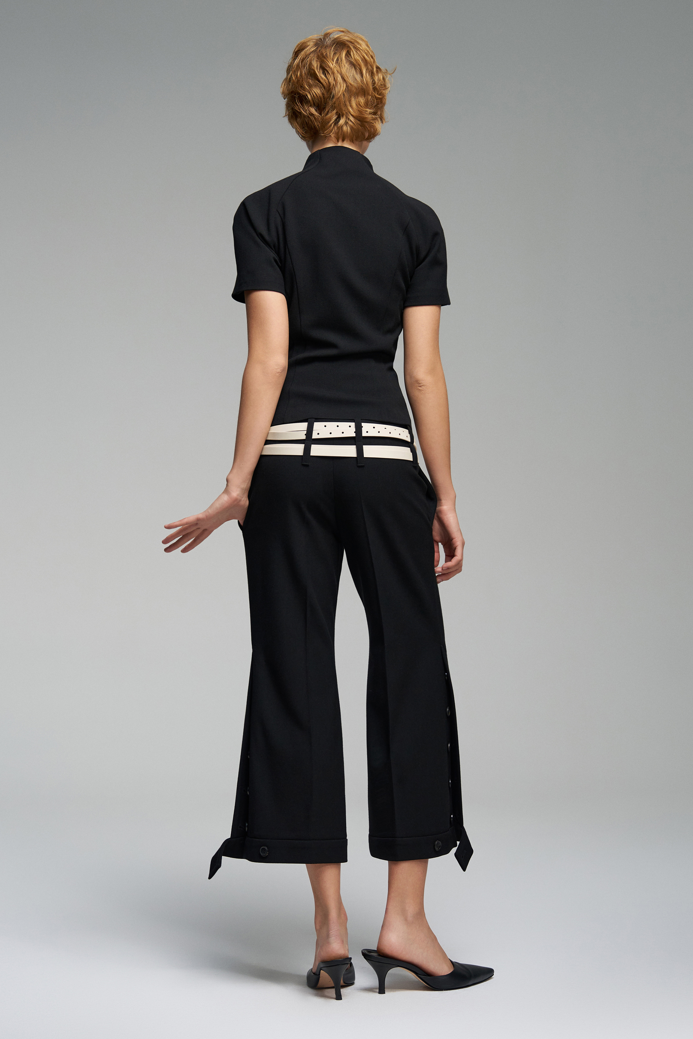 Капри из костюмной ткани на средней посадке. Нижний край штанин выполнен в форме пояса, который застёгивается на пуговицы, создавая графичную линию низа. Модель с карманами по бокам, шлицей на поясе и застежкой.