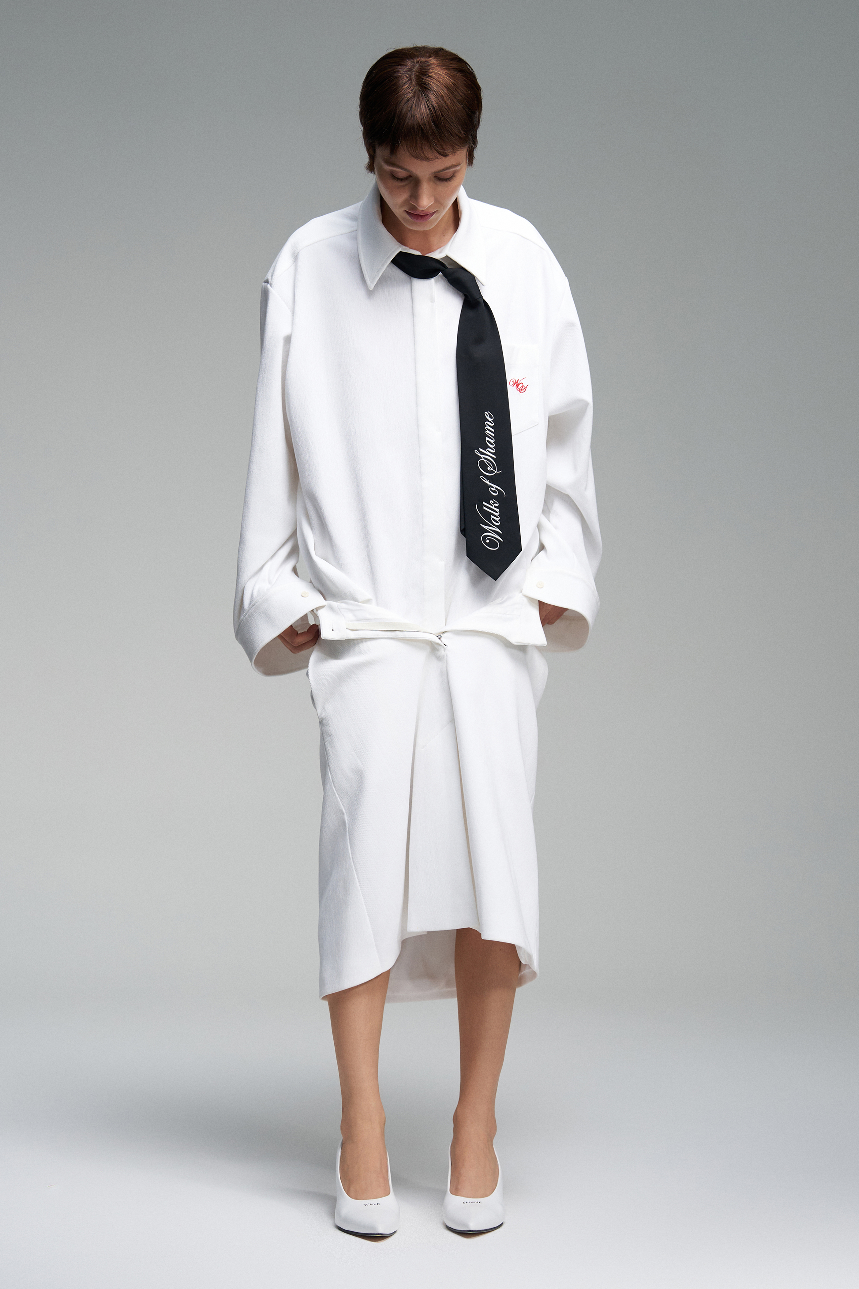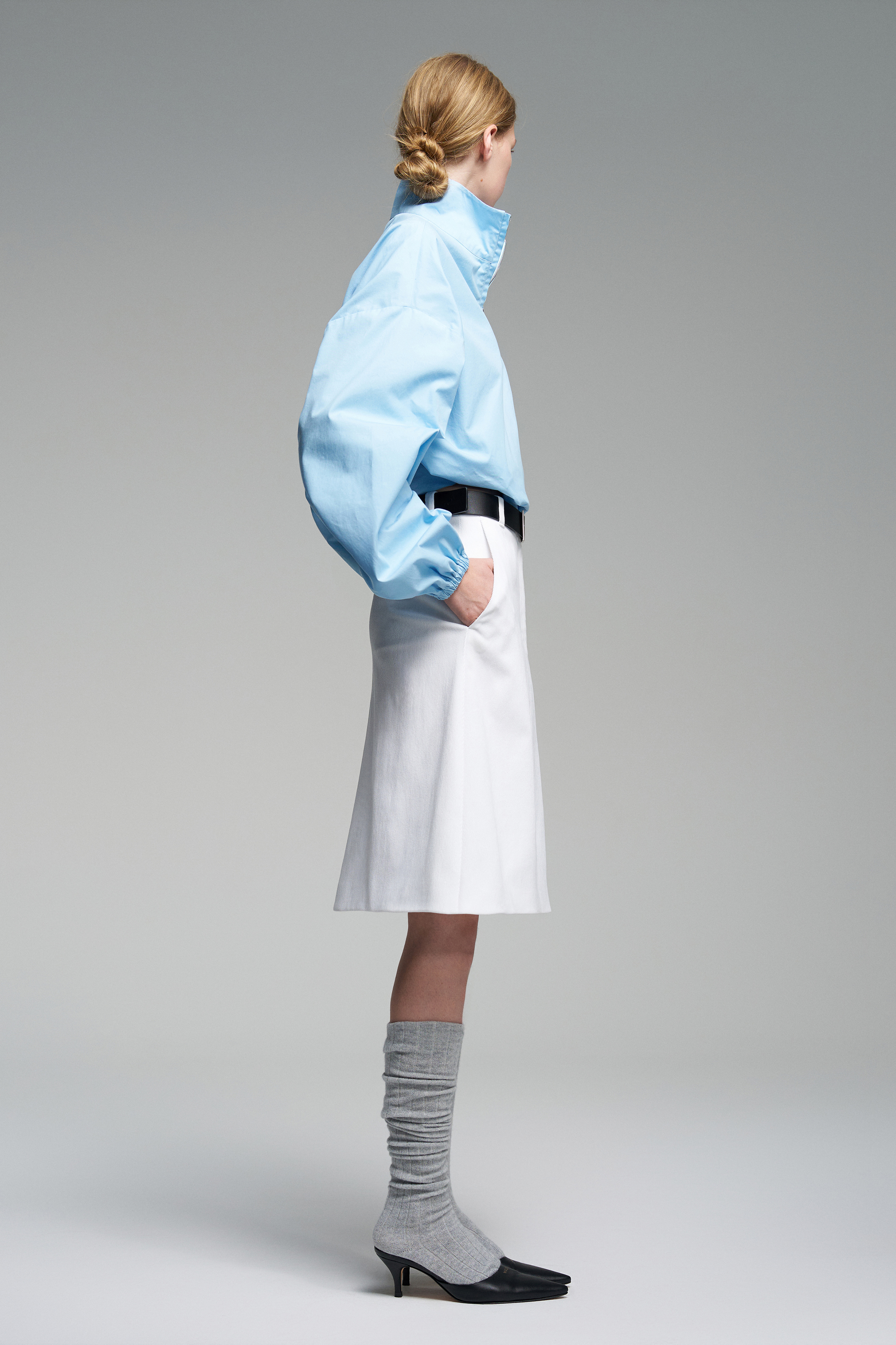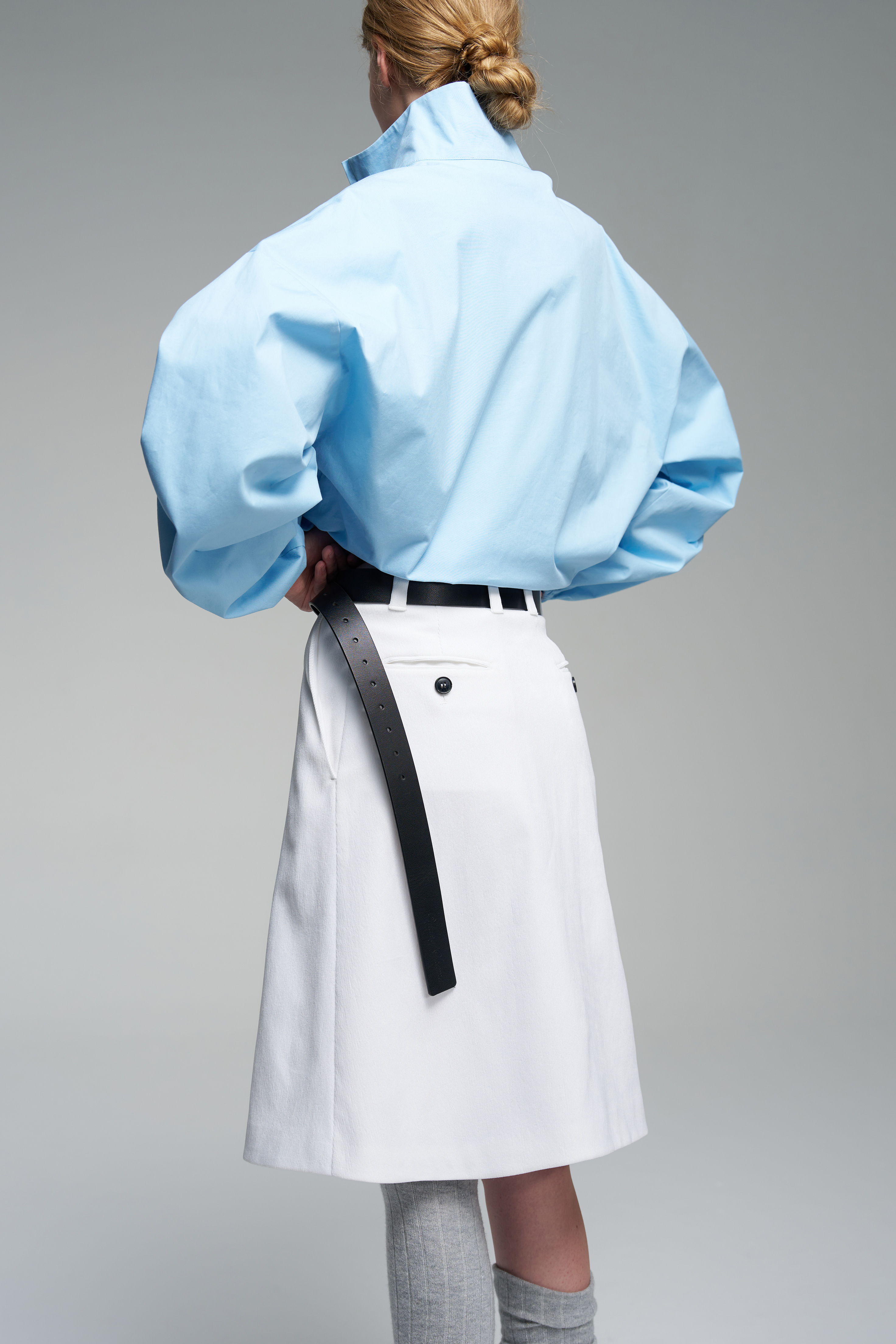 Юбка А-силуэта на низкой посадке. Длиной модели слегка прикрывает колени. Вдохновением для формы стали 80-е, а для придания современного вида было решено перенести шлицу на перед изделия.