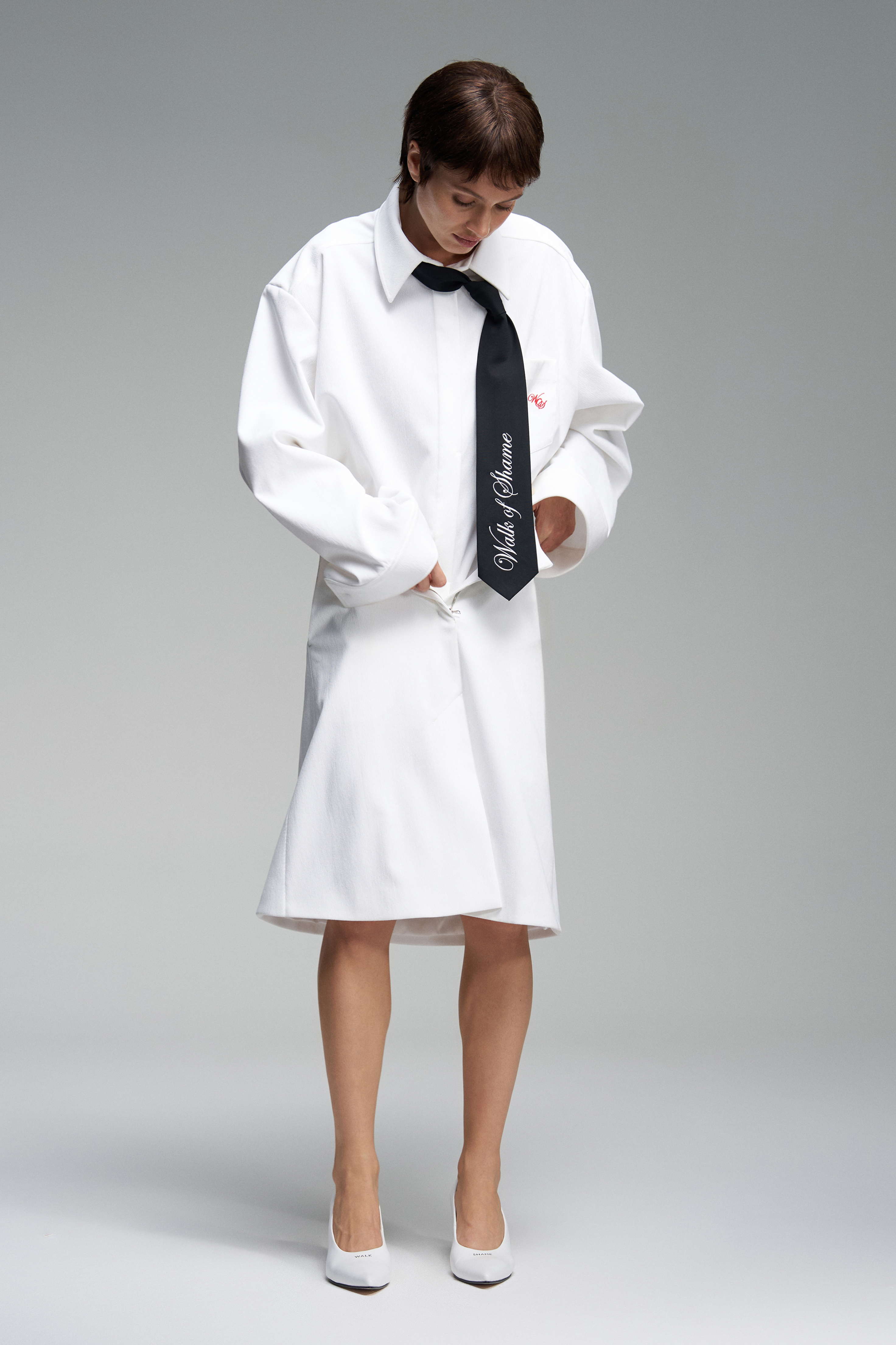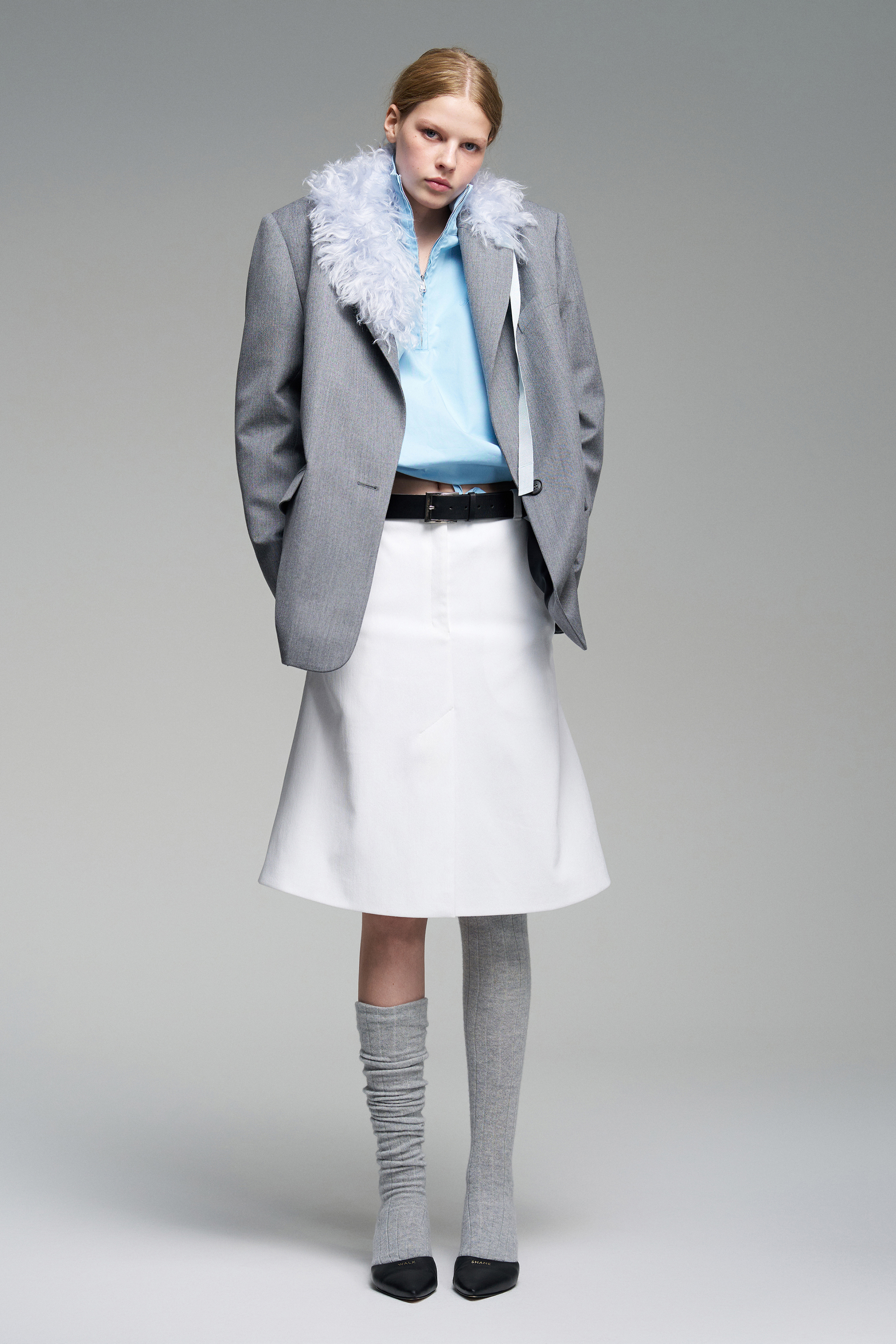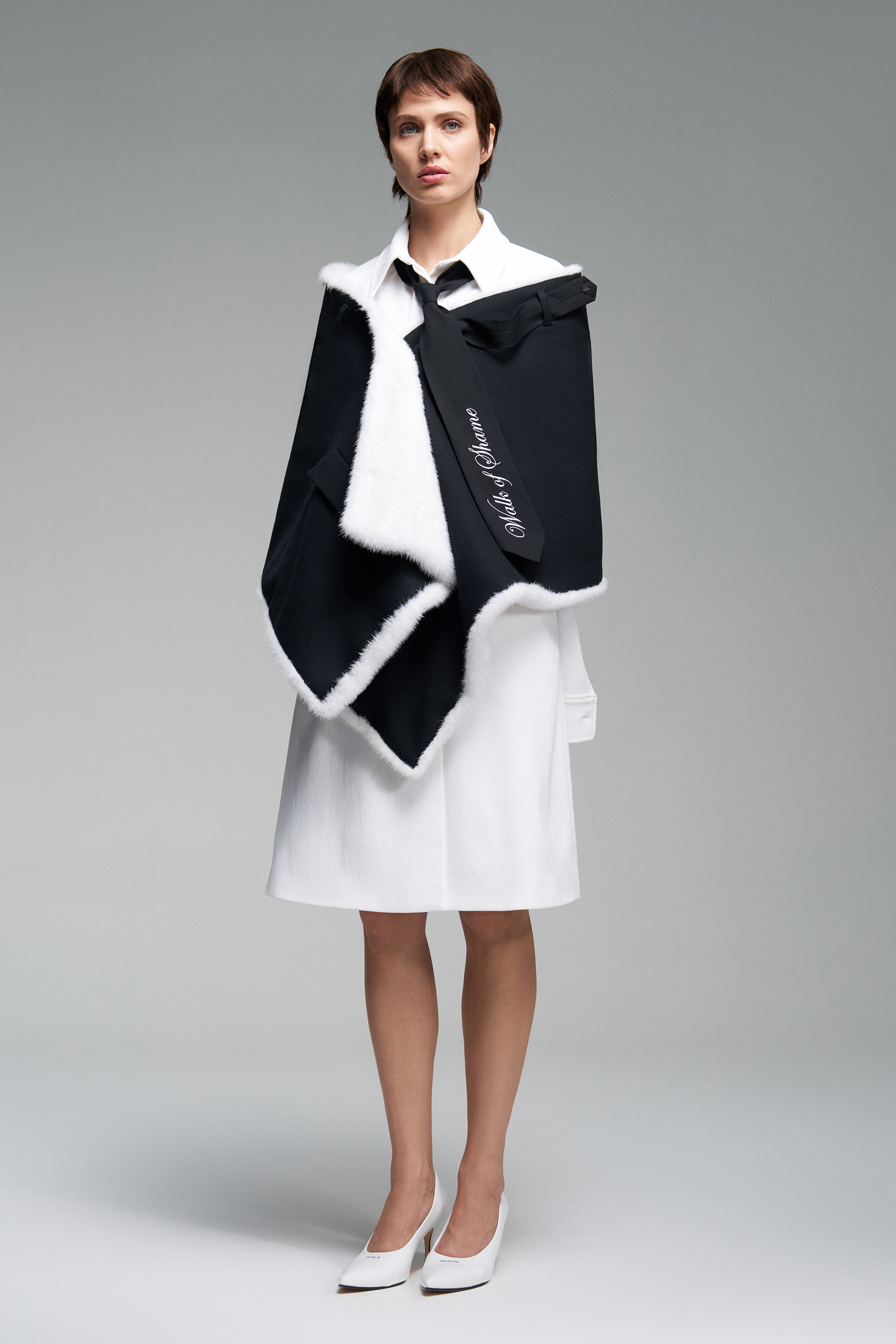Юбка А-силуэта на низкой посадке. Длиной модели слегка прикрывает колени. Вдохновением для формы стали 80-е, а для придания современного вида было решено перенести шлицу на перед изделия.