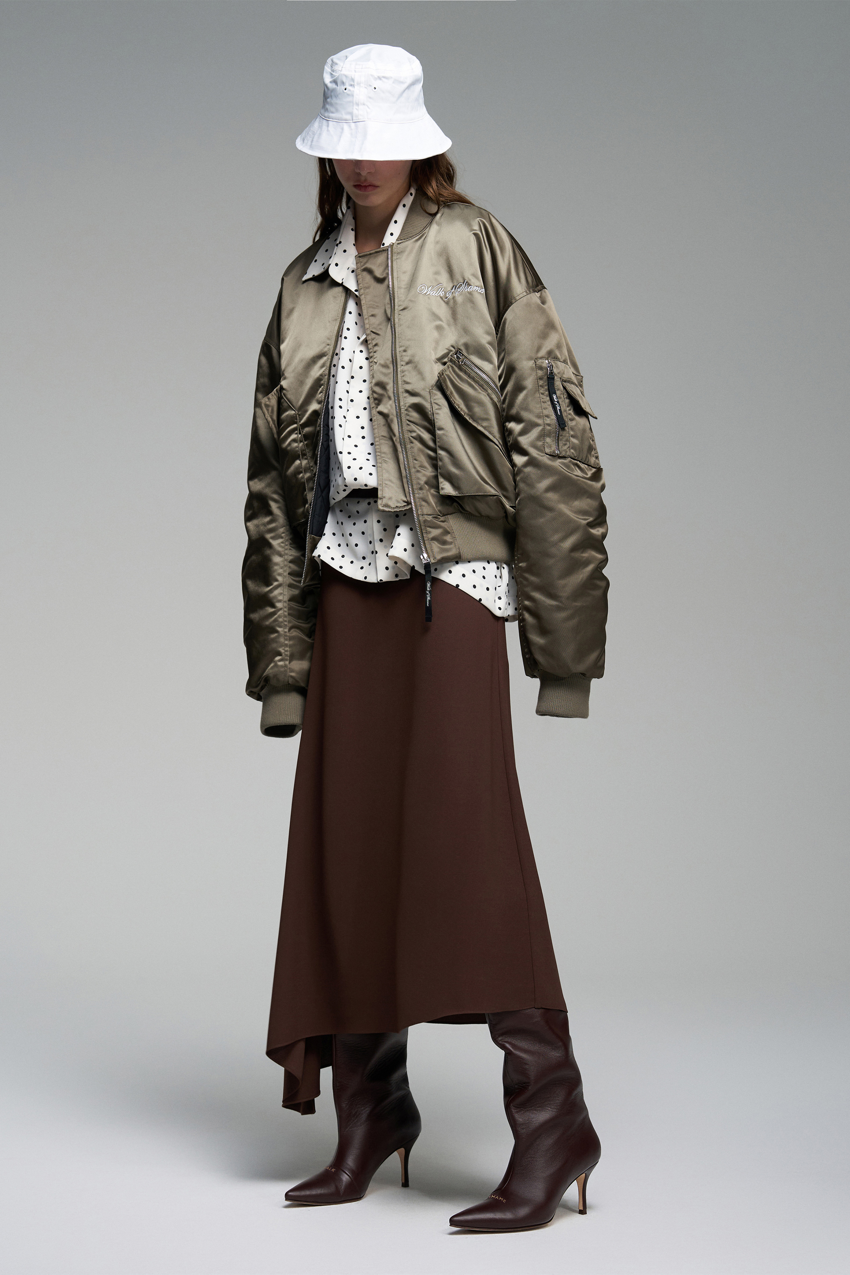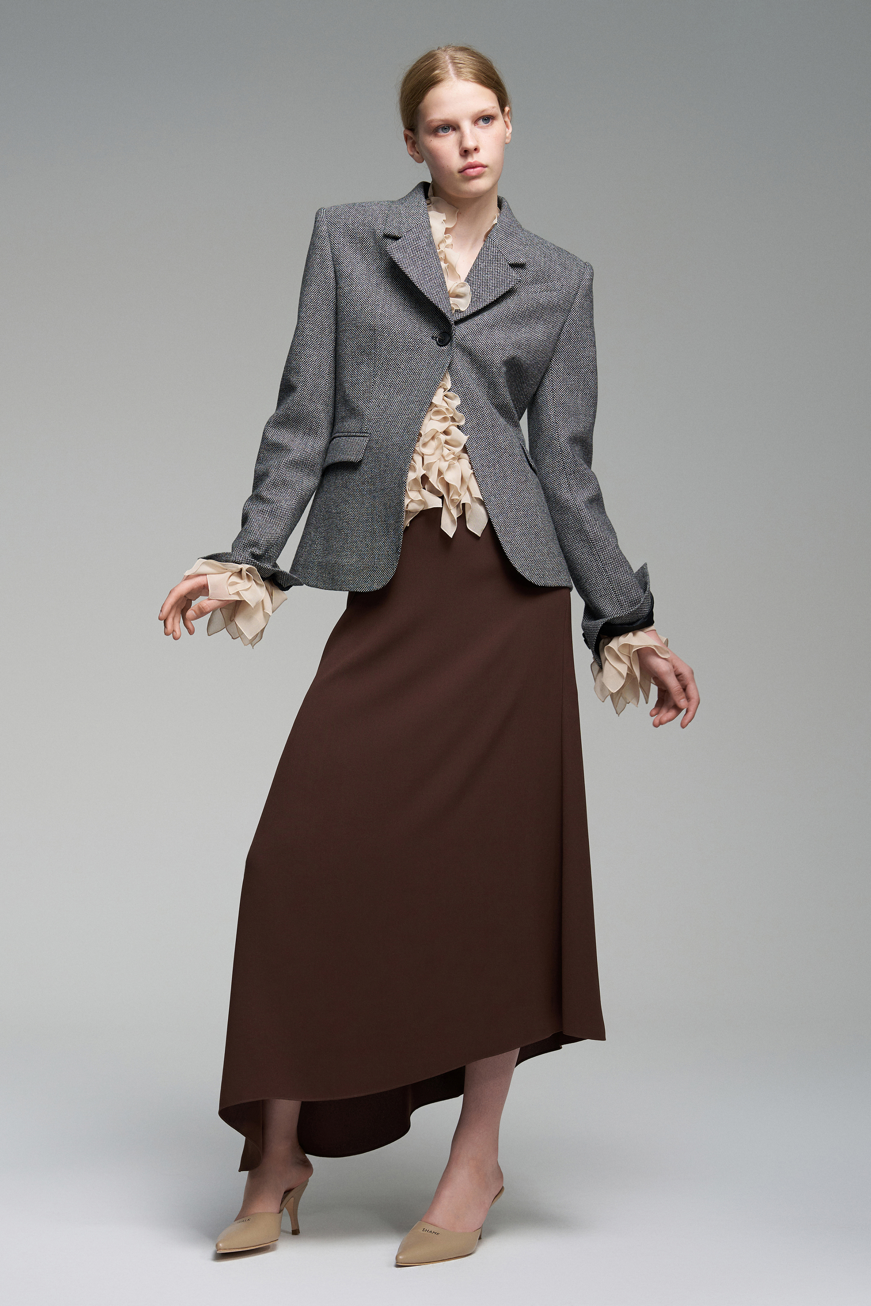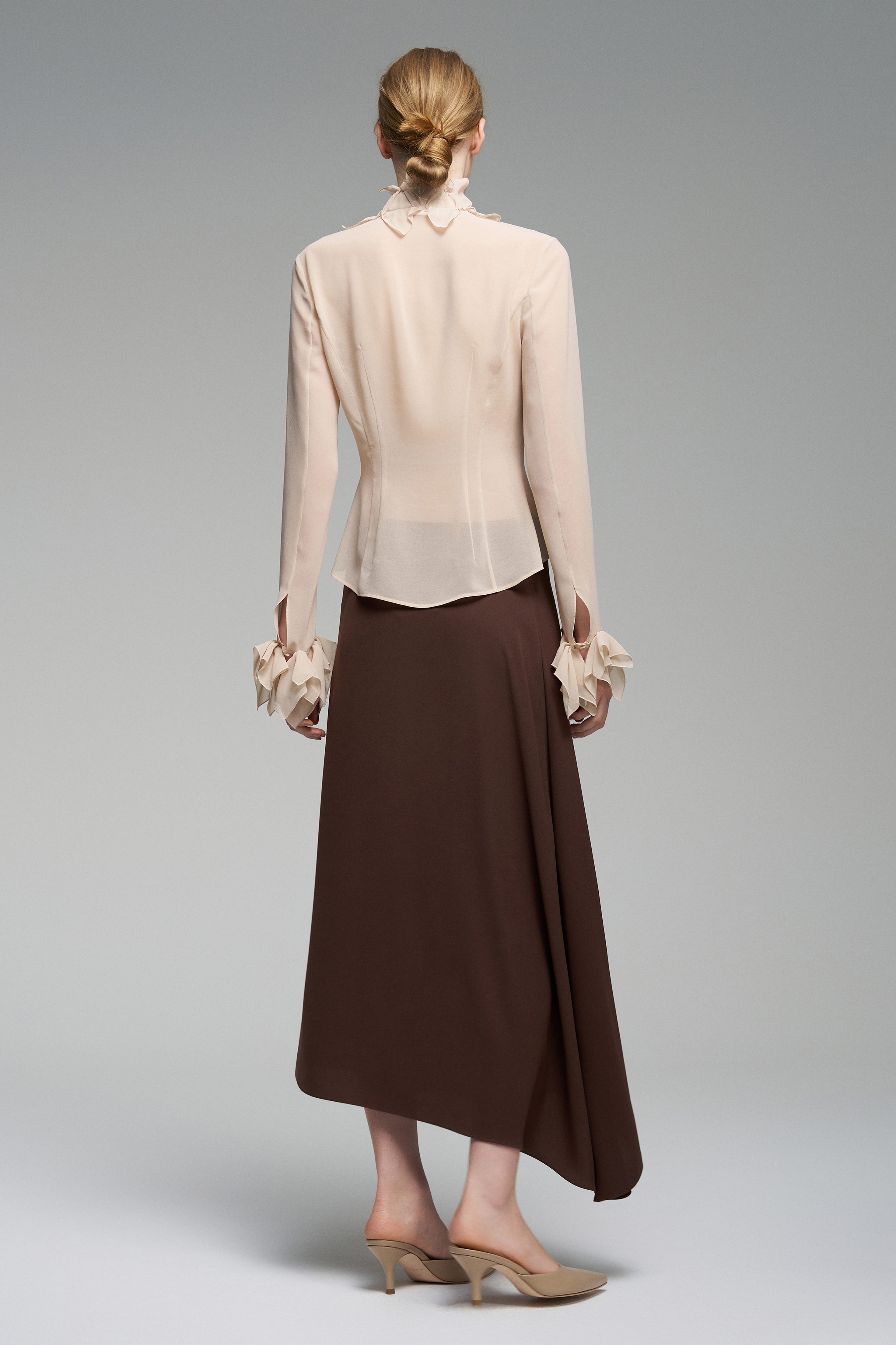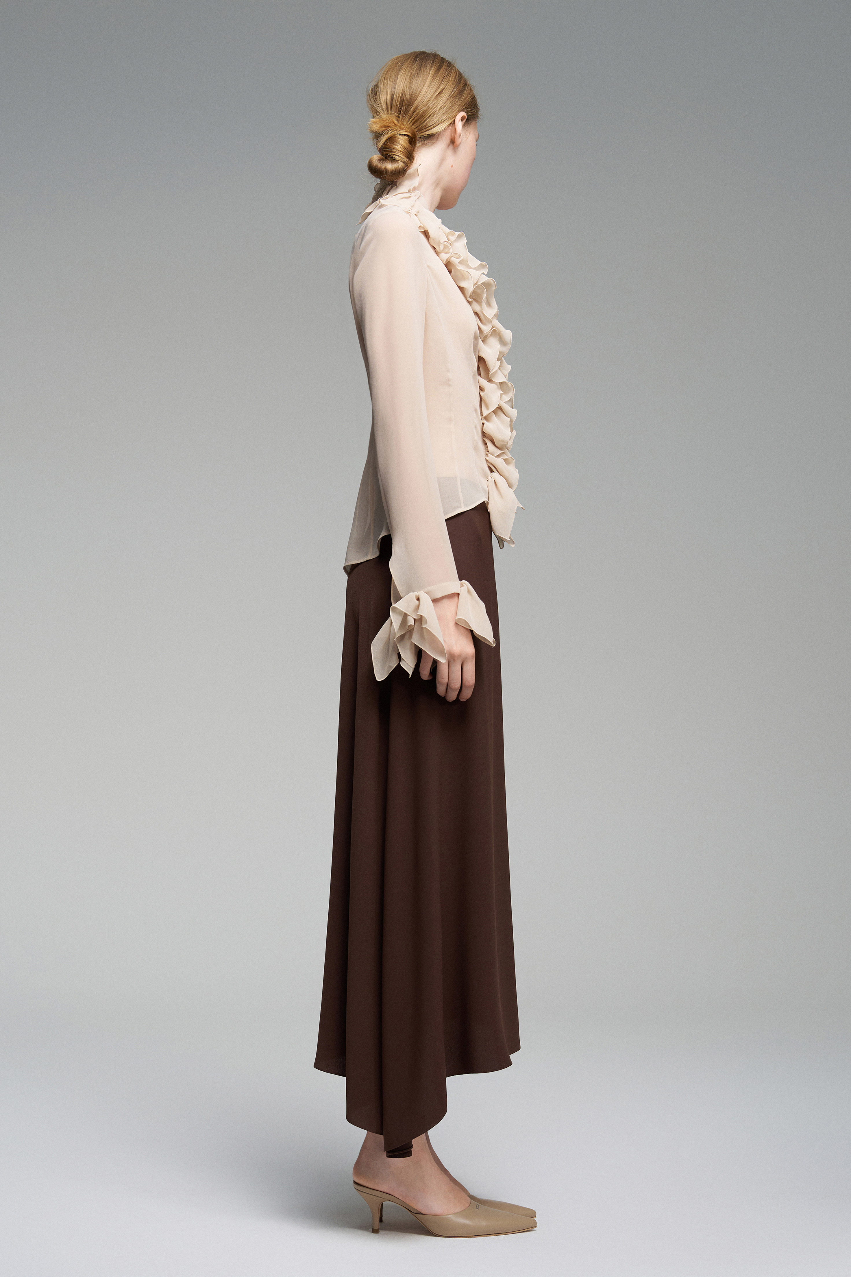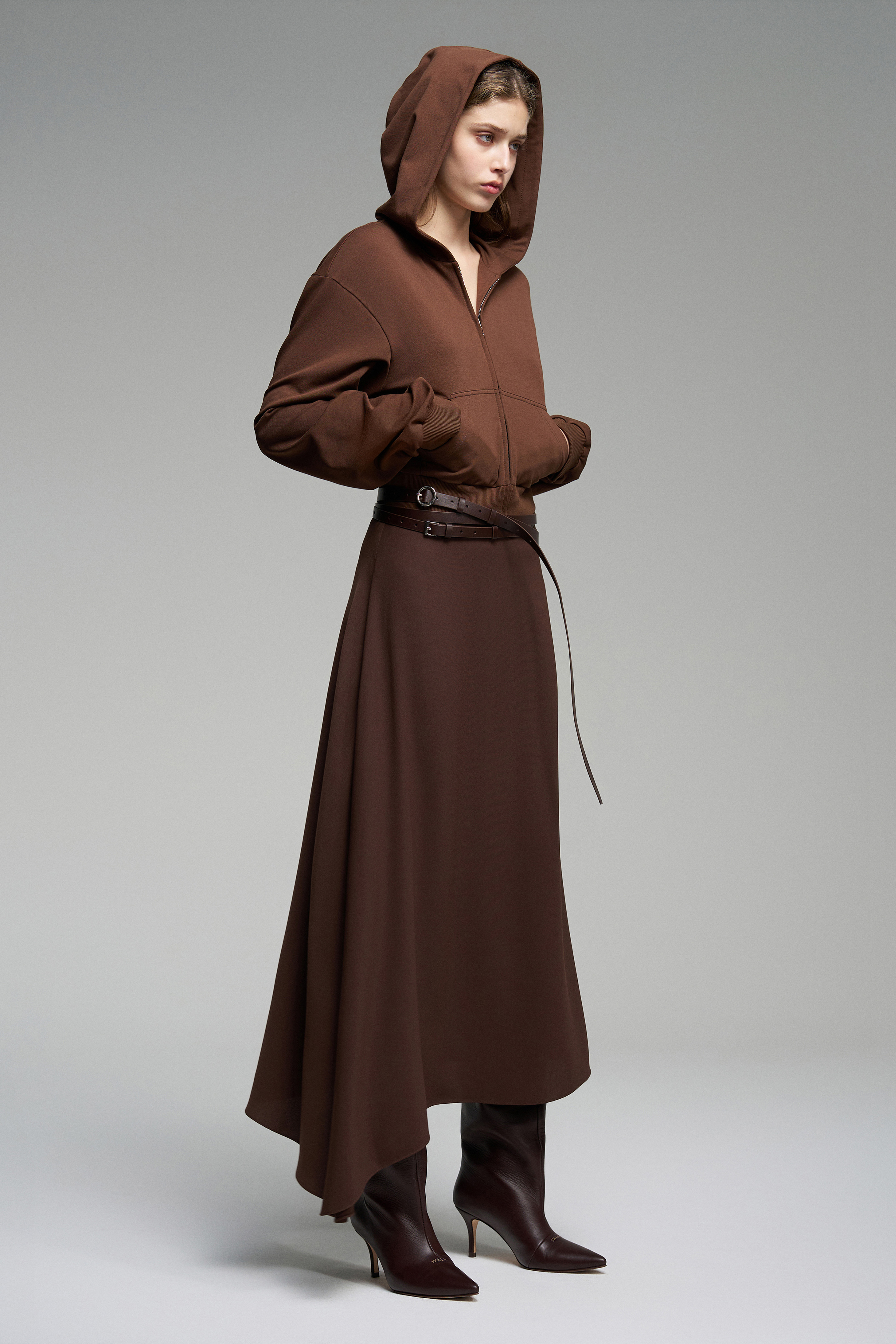 Юбка миди сшита из коричневого крепа. Асимметричный крой придаёт образу динамику, а застёжка на молнию делает посадку удобной и лаконичной. Отсутствие подкладки позволяет ткани идеально повторять силуэт, создавая чистый и графичный образ.