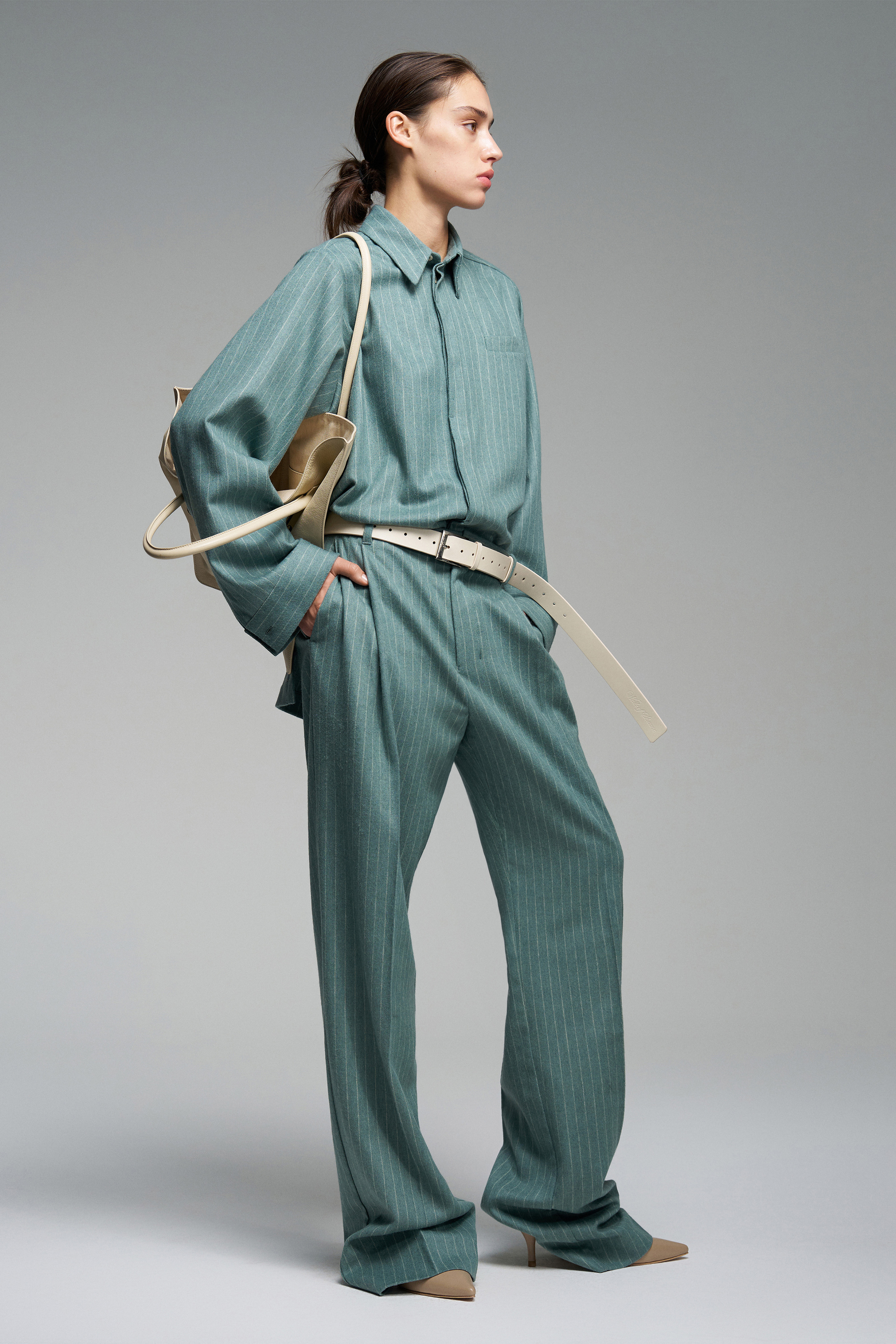 Рубашка зеленого цвета в полоску со скрытой застежкой на пуговицах. Со спущенной линией плеч, манжетах на пуговицах и классическим воротником.