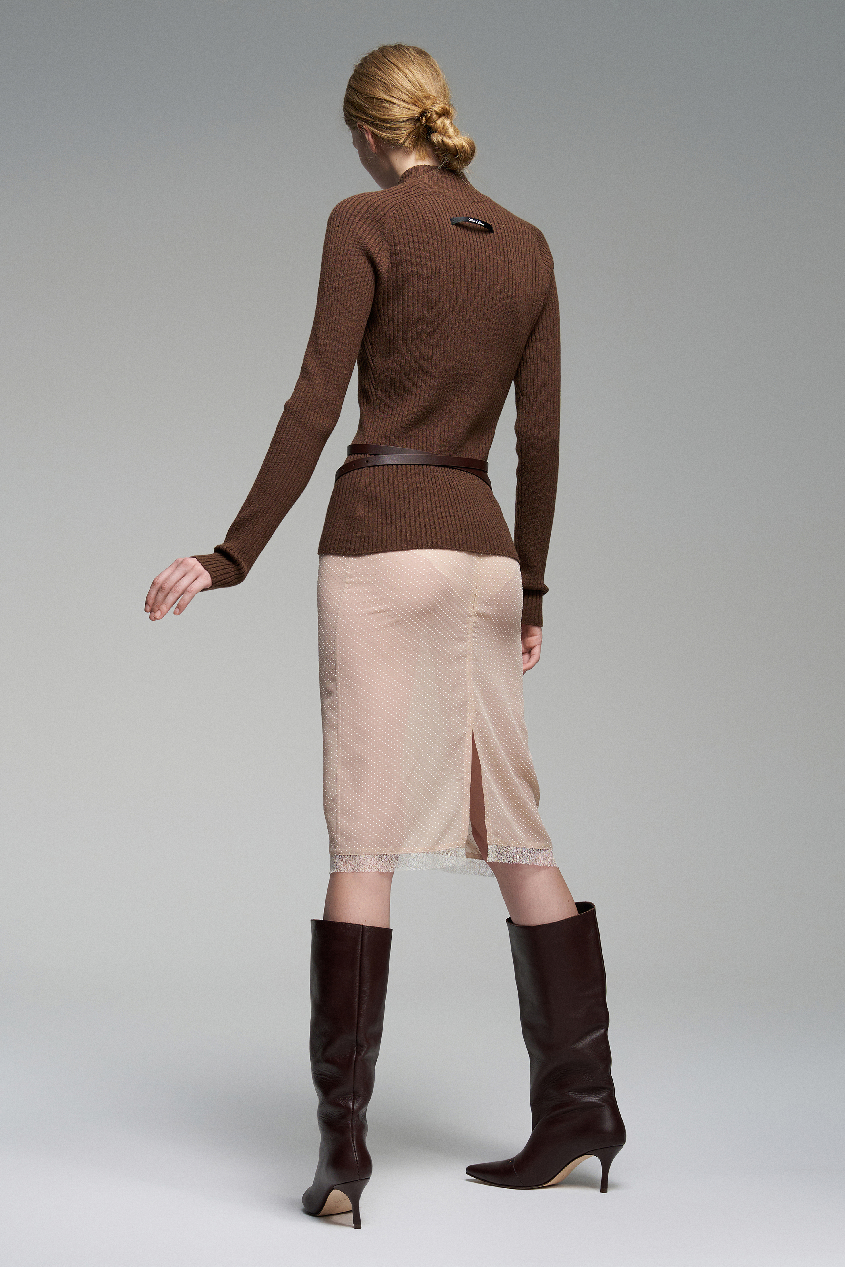Кардиган коричневого цвета, трикотажный, прилегающего силуэта с молнией, регулируемой сверху и снизу. В качестве декоративного элемента используется репсовая лента с логотипом бренда вместе с традиционной вышивкой. Молнии Riri также украшены логотипом.
