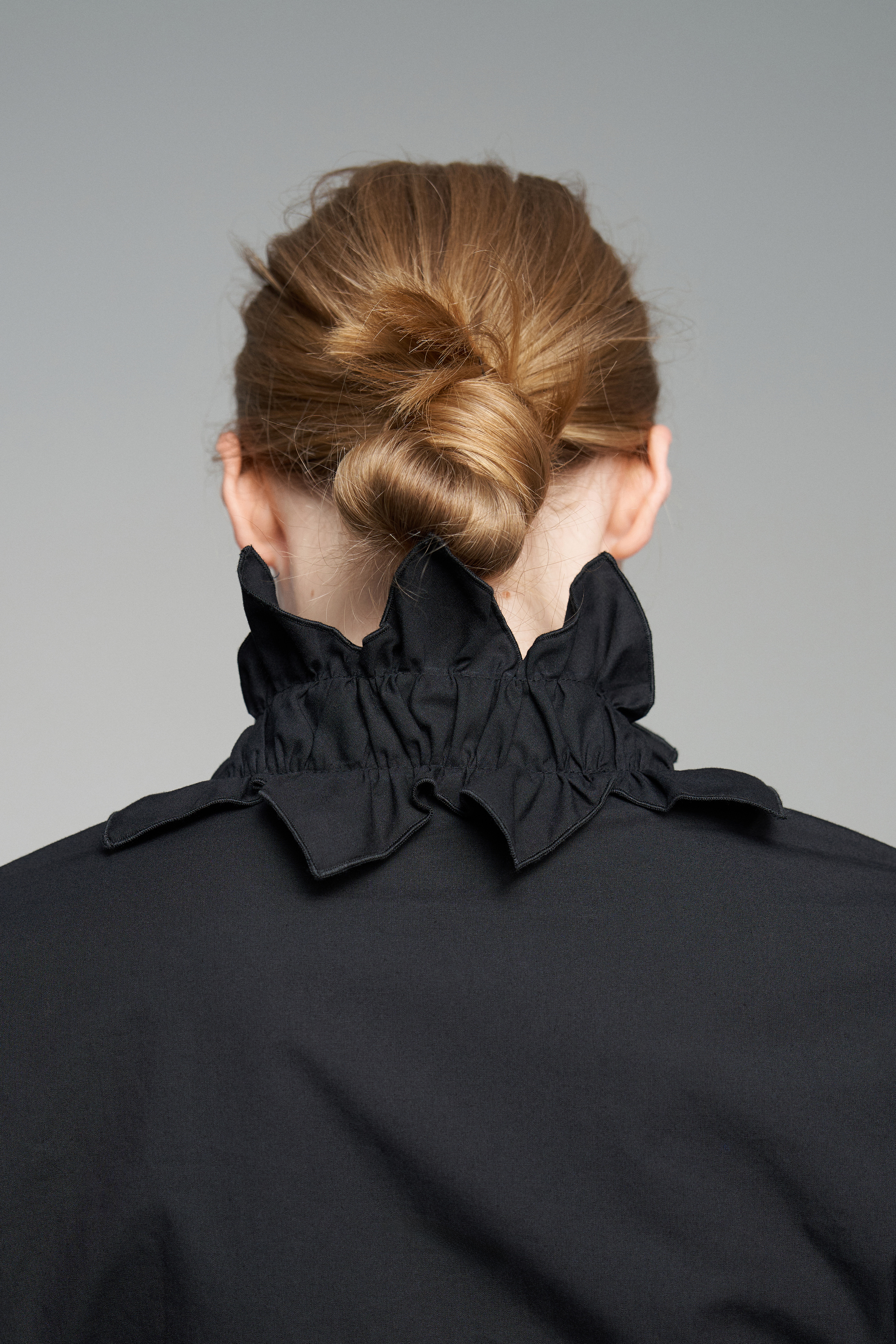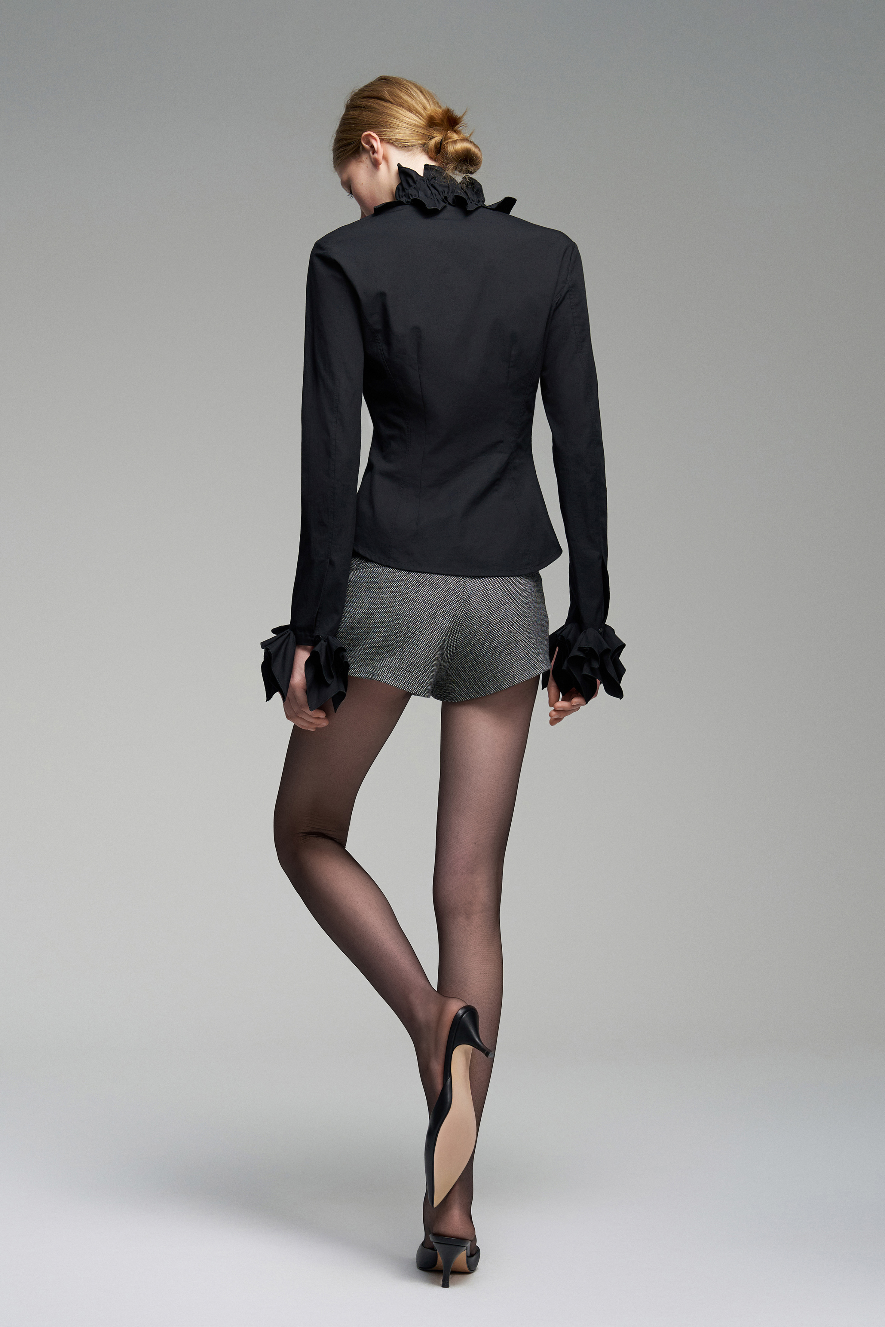 Приталенная блуза украшена рюшами — они проходят вдоль линии застёжки и на рукавах. В этой модели глубокий вырез, а сама застёжка на пуговицы остаётся функциональной деталью.