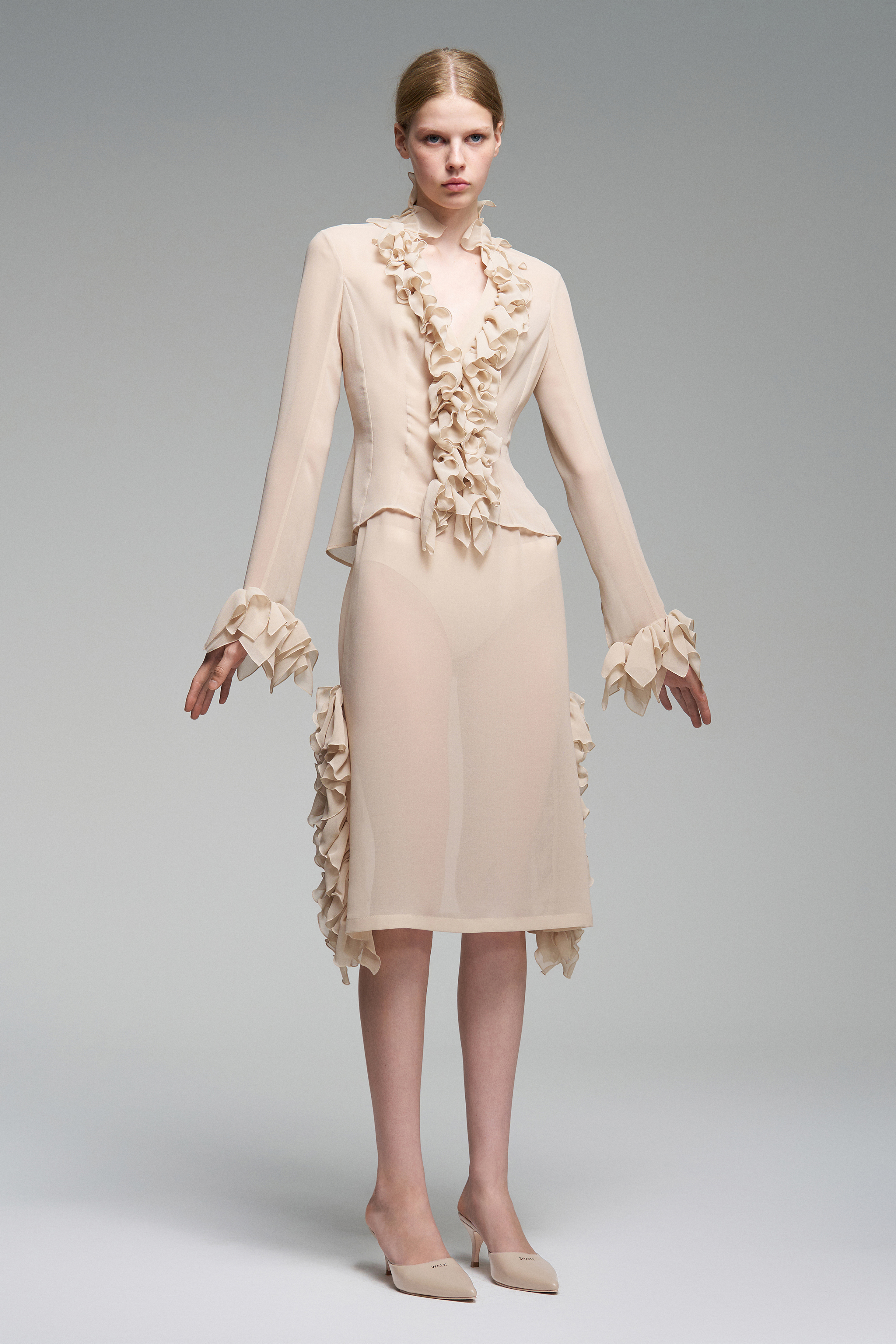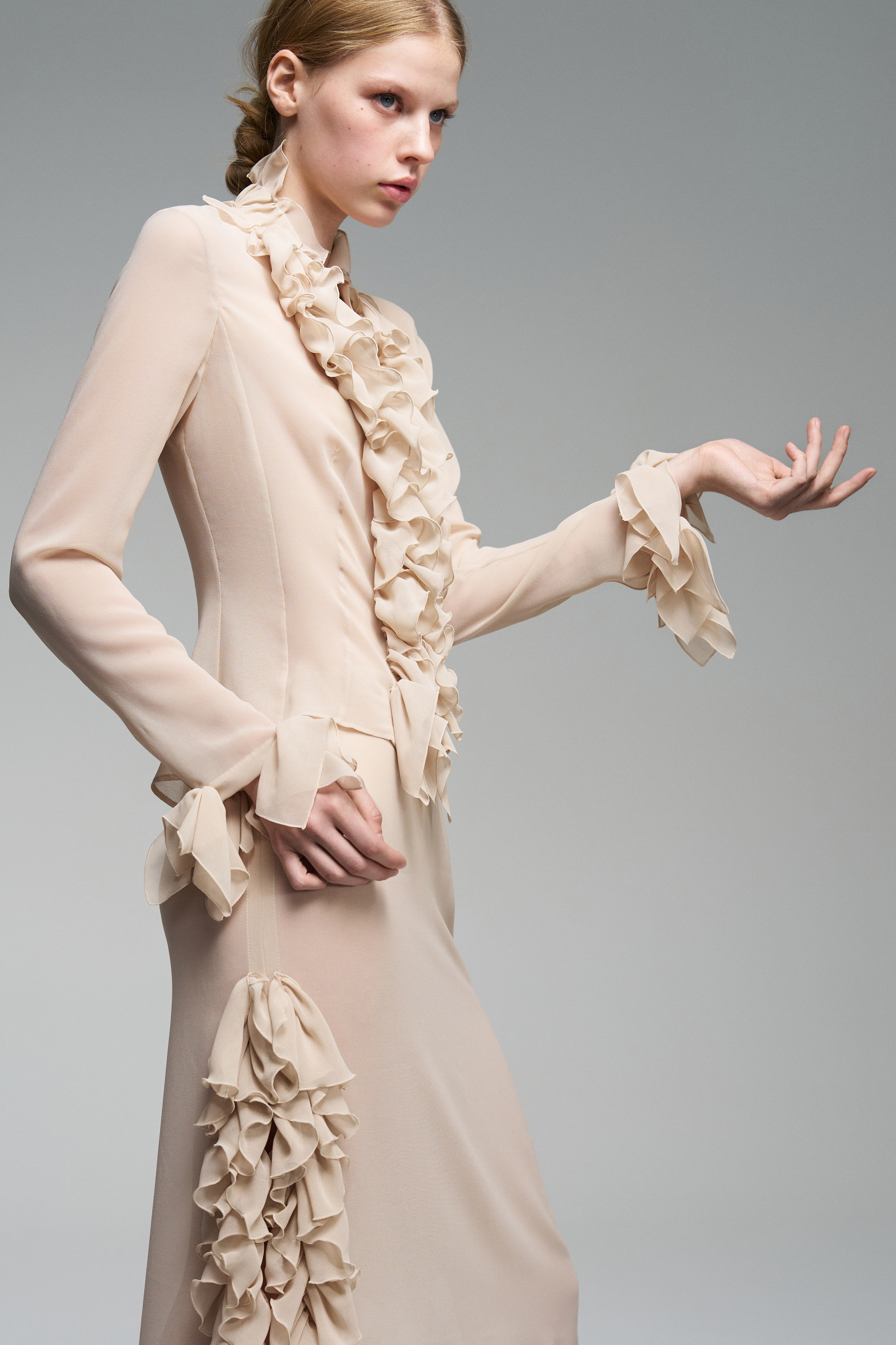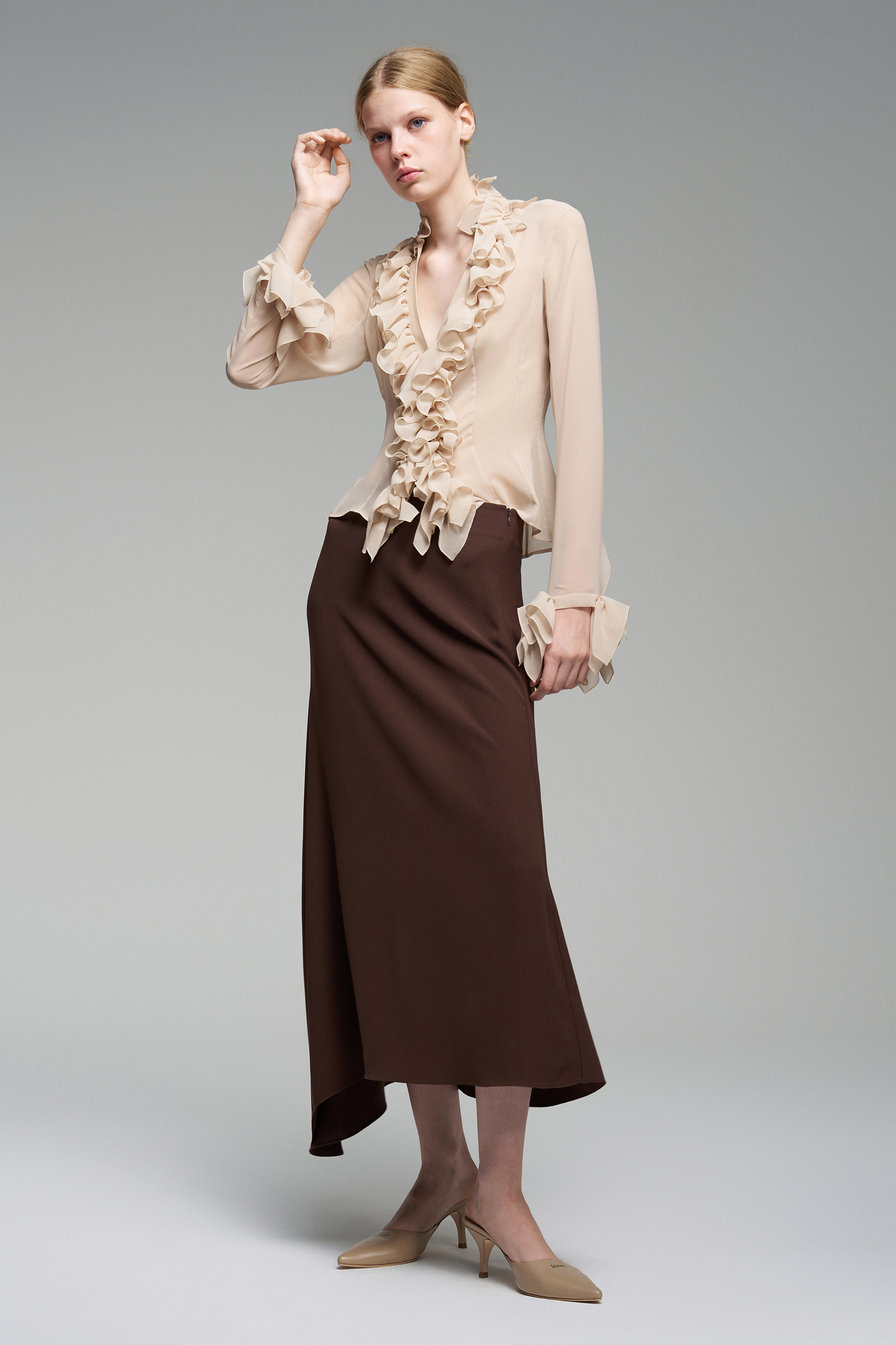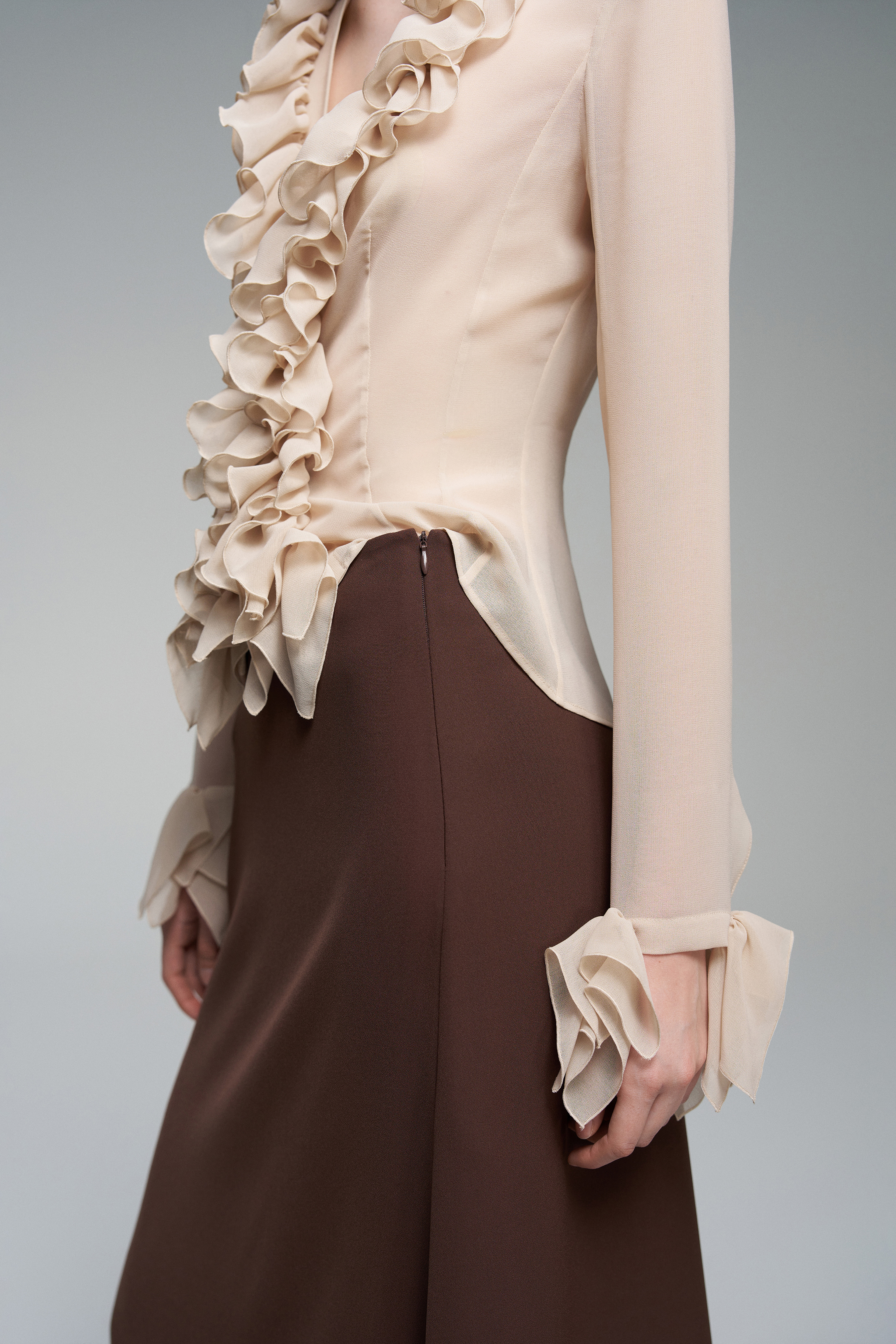 Приталенная блуза украшена рюшами — они проходят вдоль линии застёжки и на рукавах. В этой модели глубокий вырез, а сама застёжка на пуговицы остаётся функциональной деталью.
