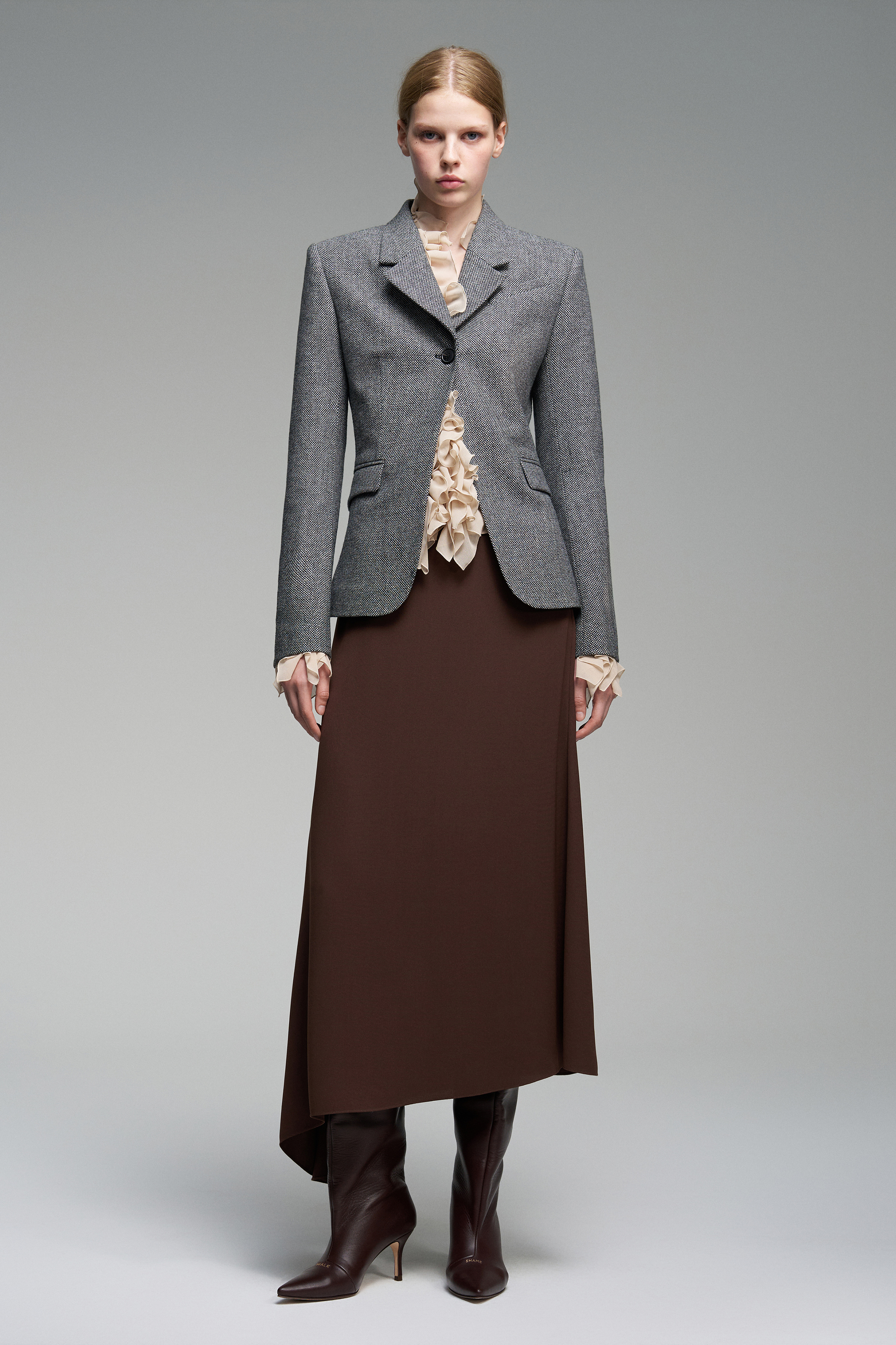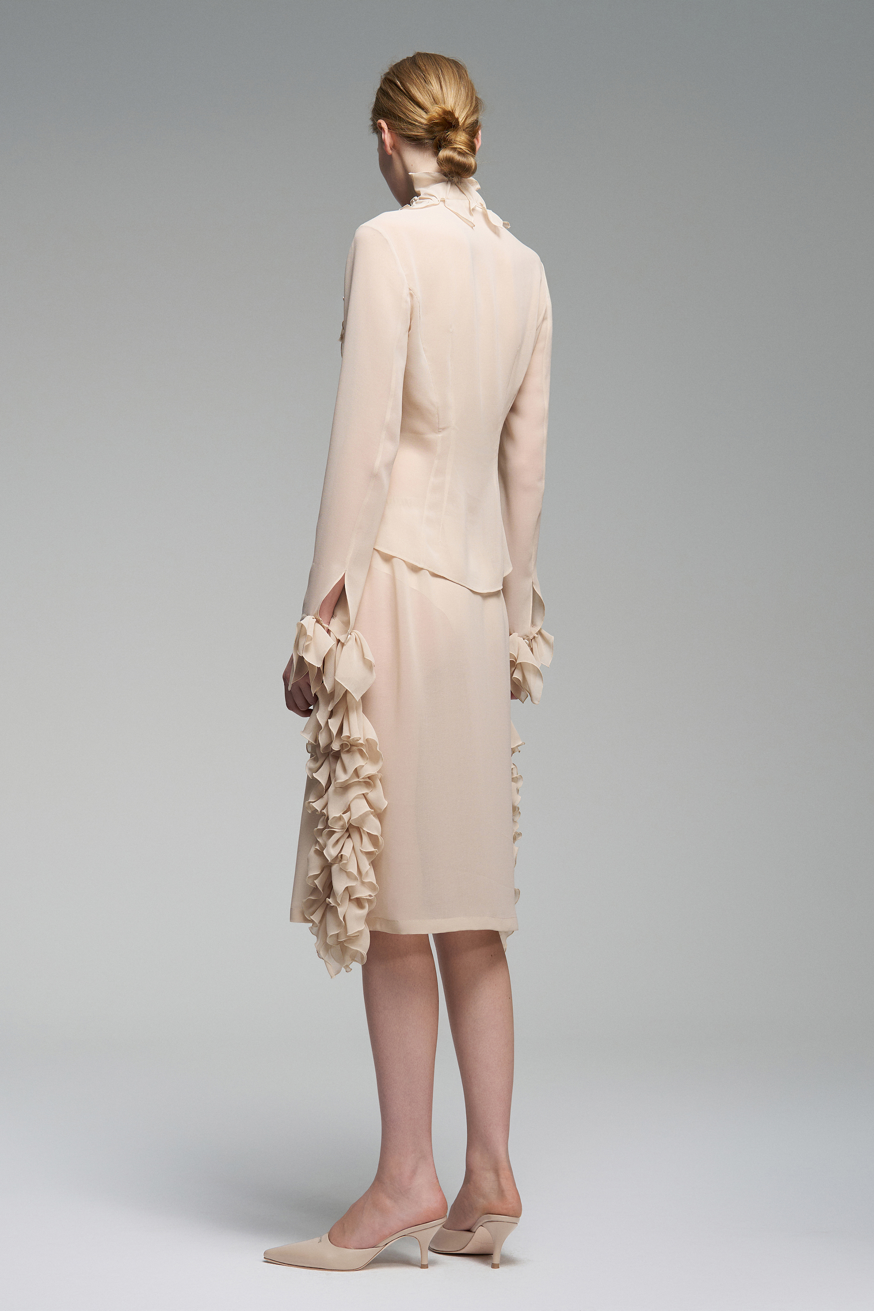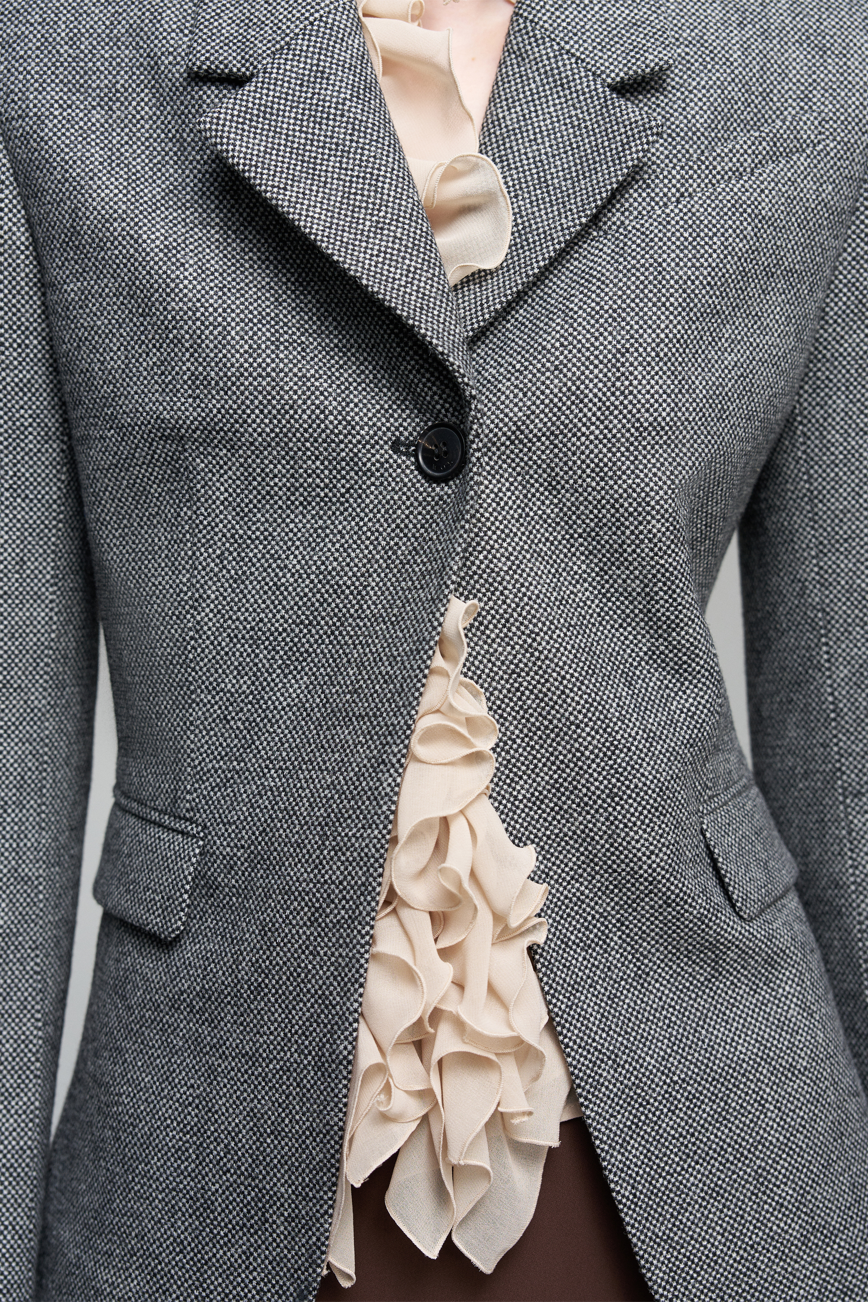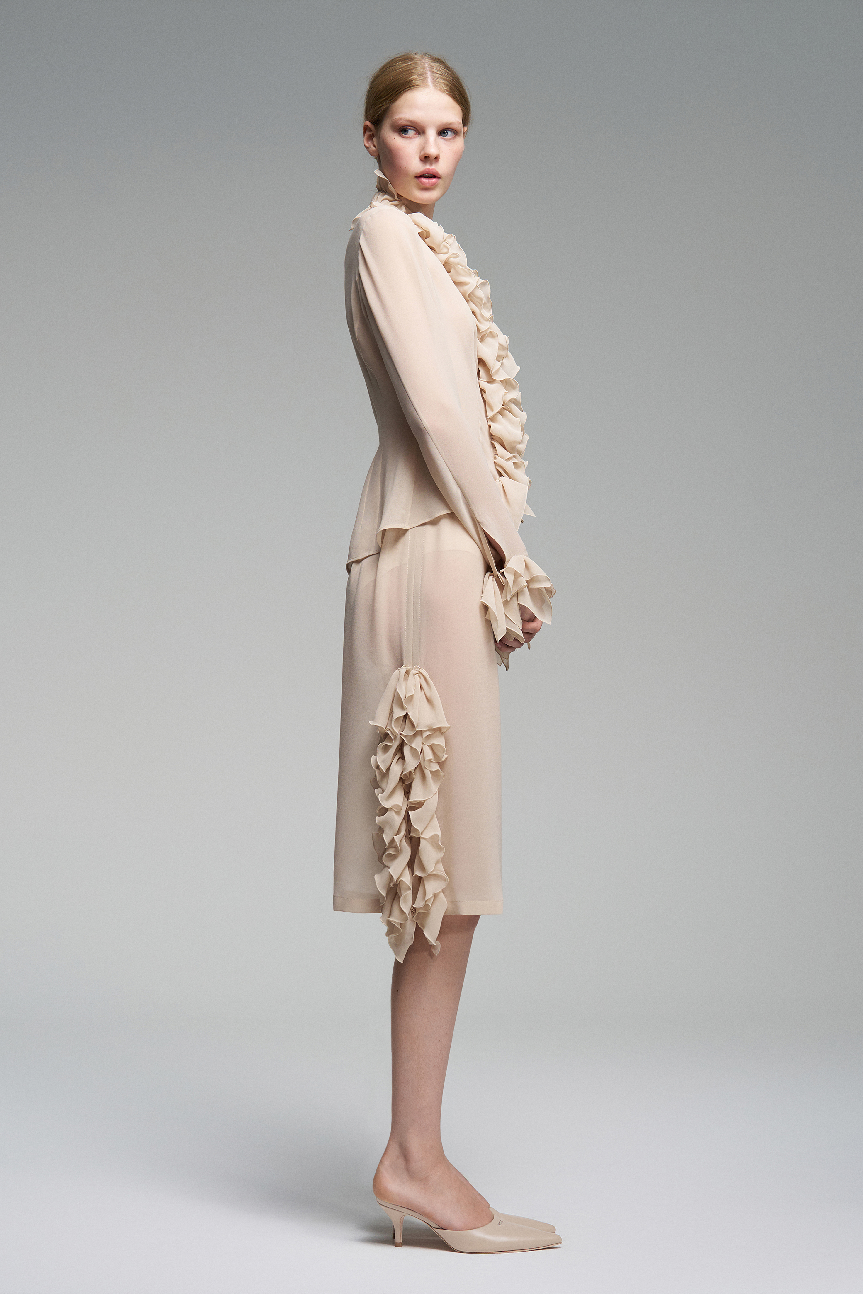 Приталенная блуза украшена рюшами — они проходят вдоль линии застёжки и на рукавах. В этой модели глубокий вырез, а сама застёжка на пуговицы остаётся функциональной деталью.