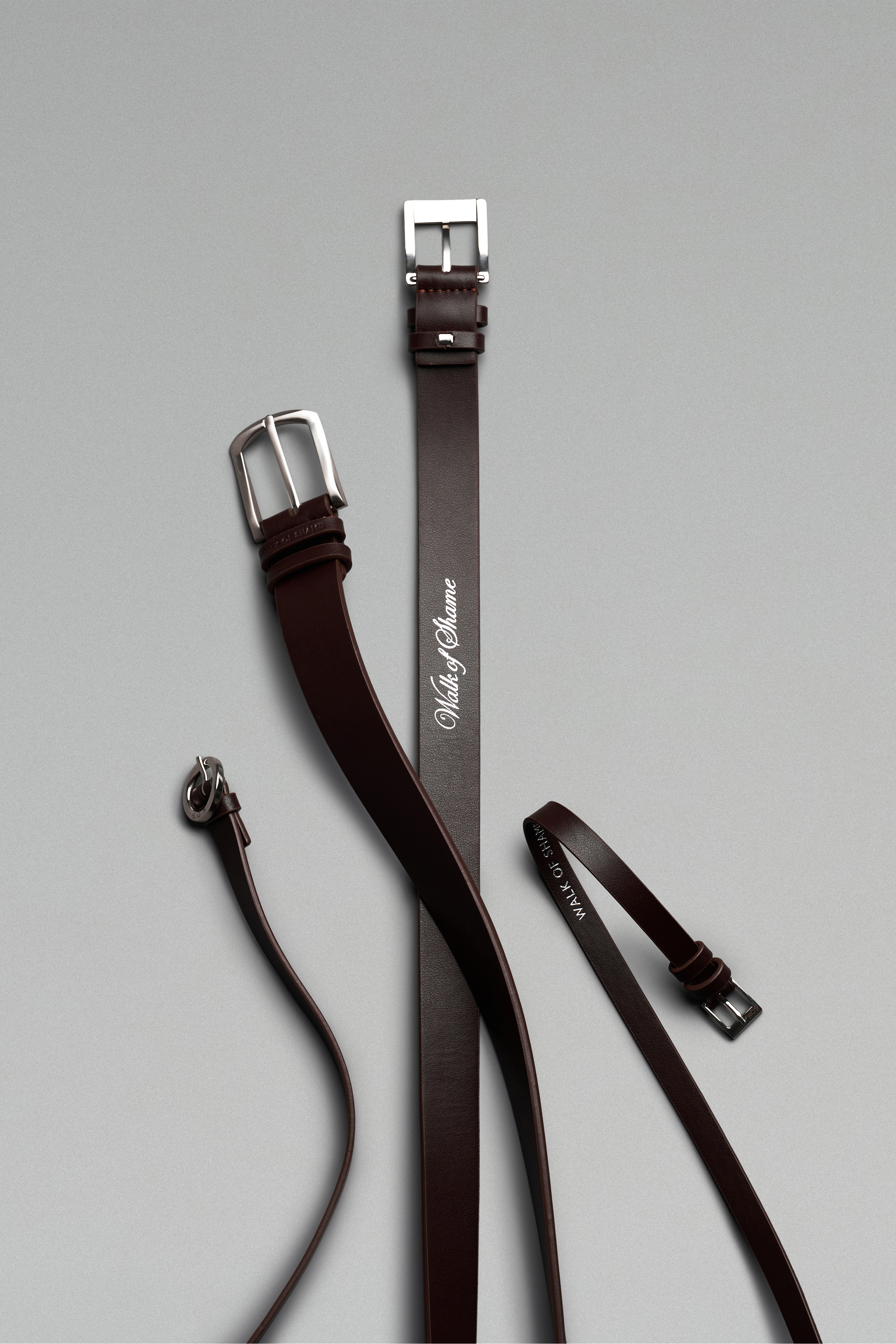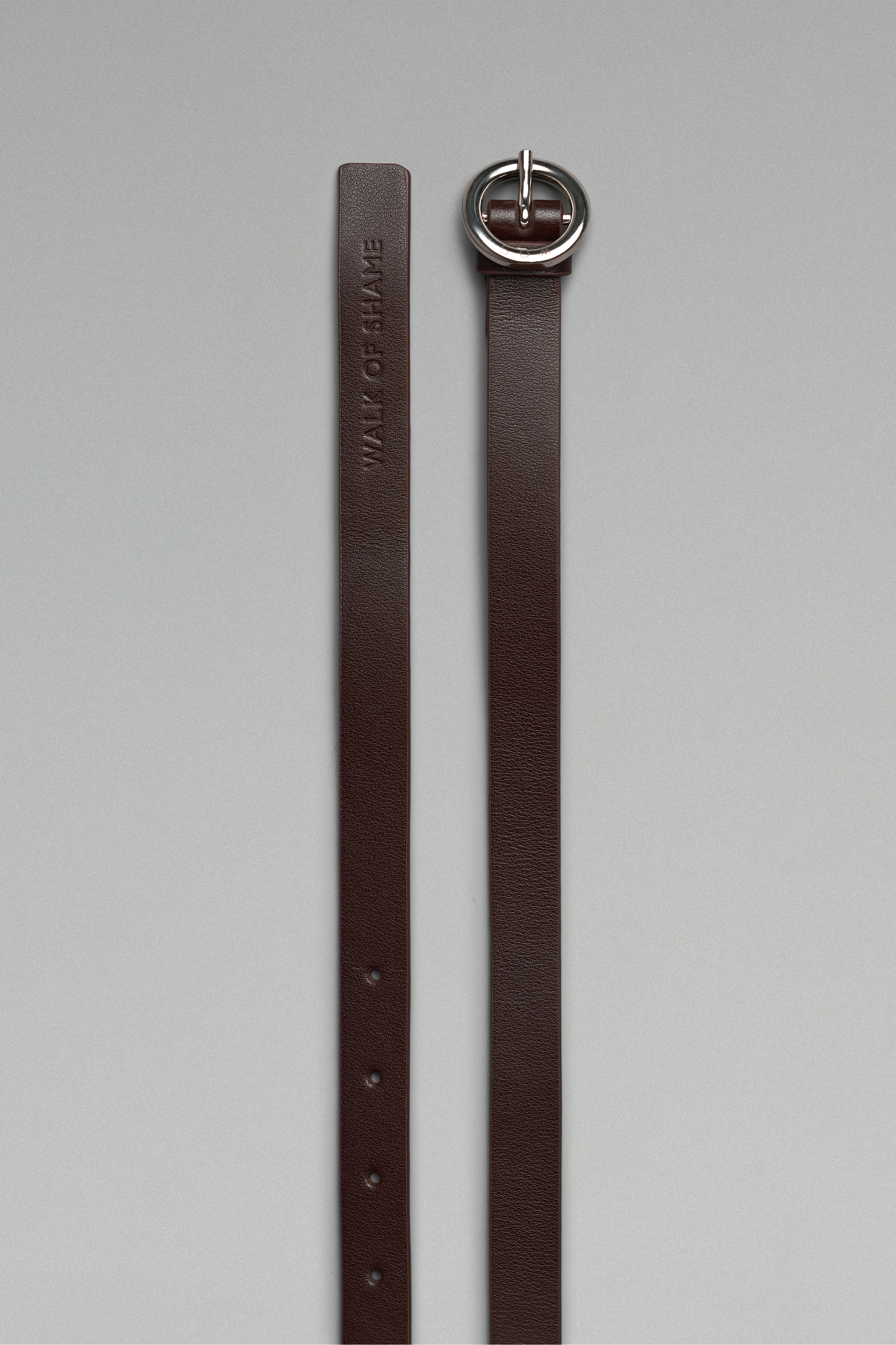 Коричневый кожаный ремень длиной 140 см с круглой металлической пряжкой серебристого цвета.