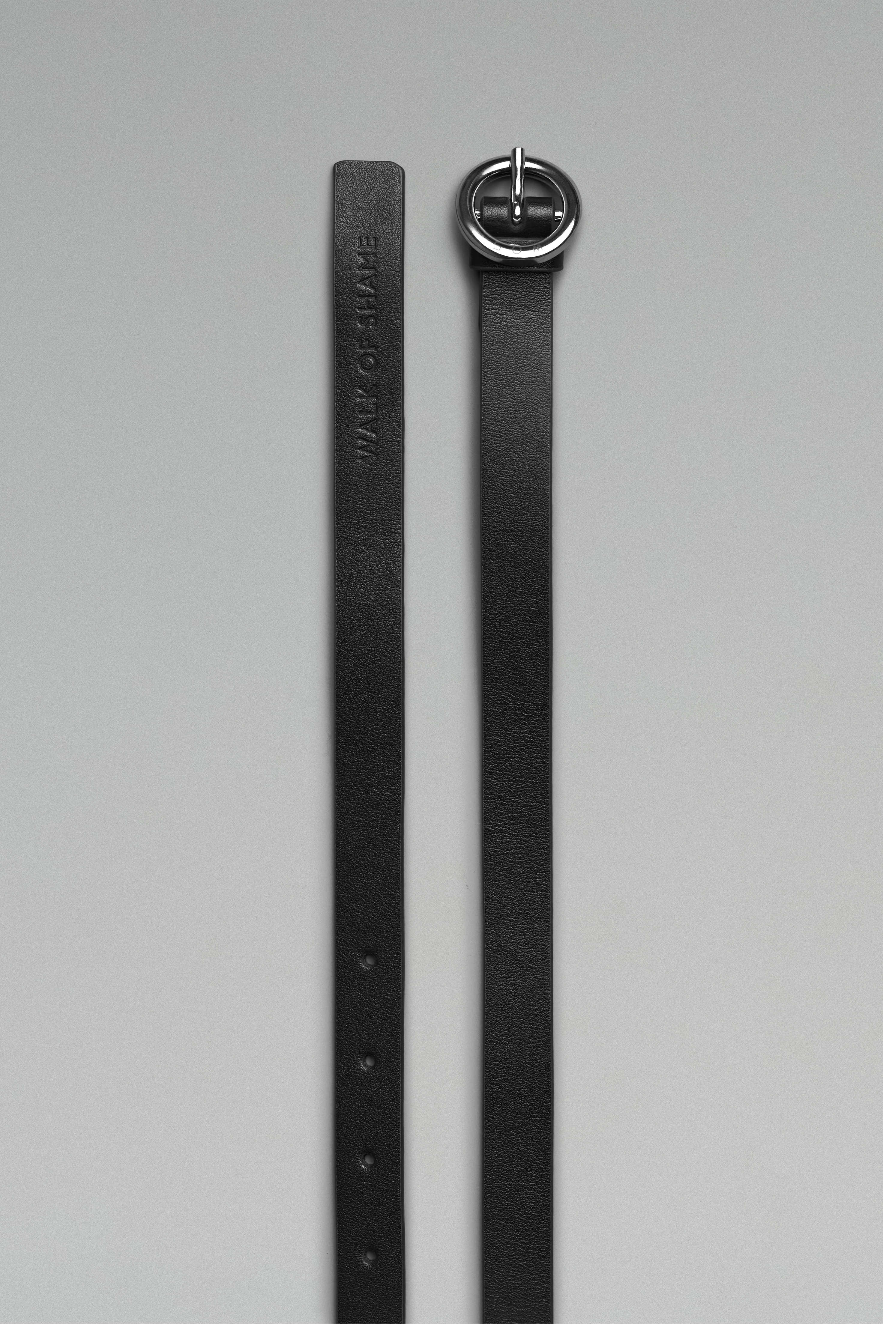 Черный кожаный ремень длиной 140 см с круглой металлической пряжкой серебристого цвета.