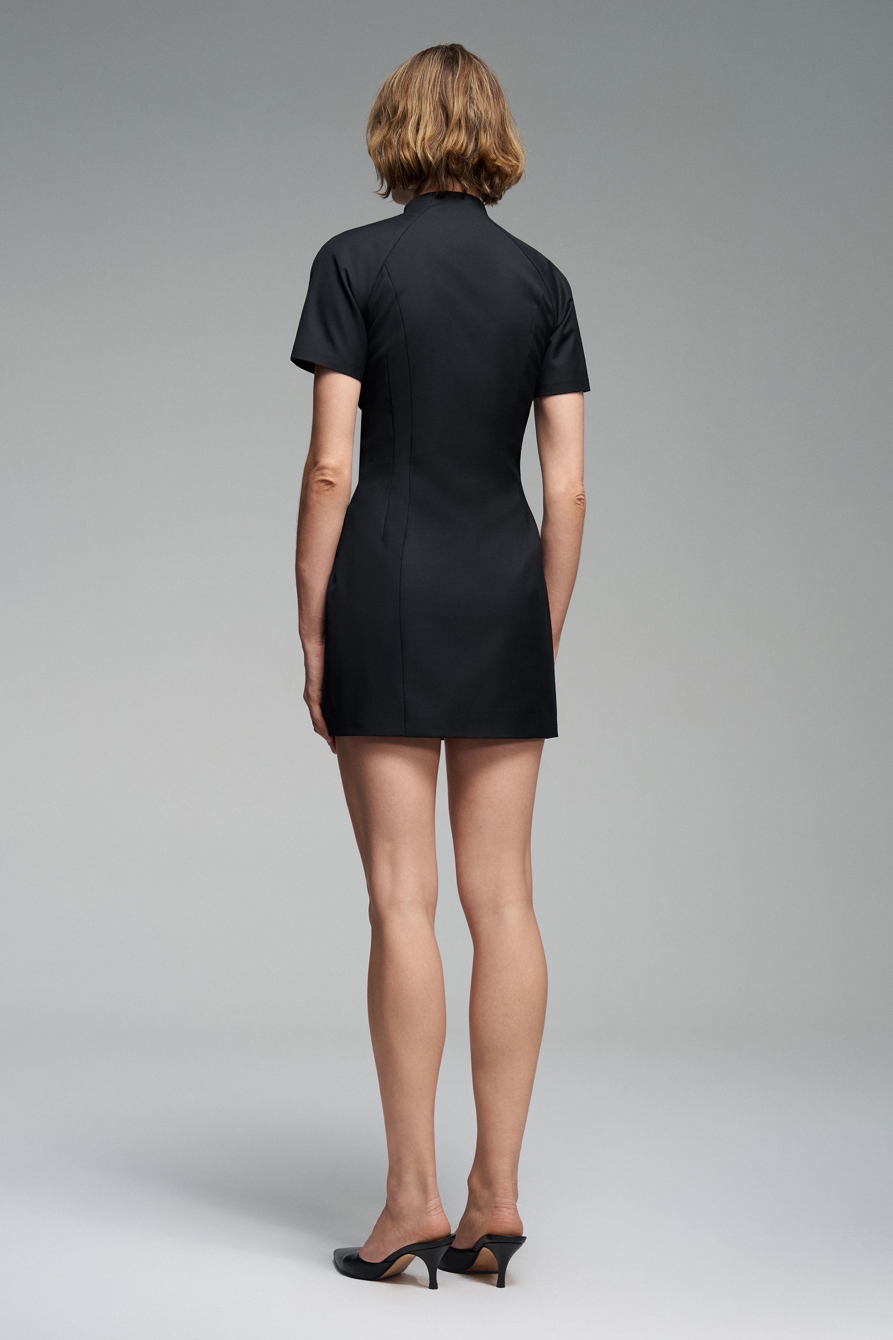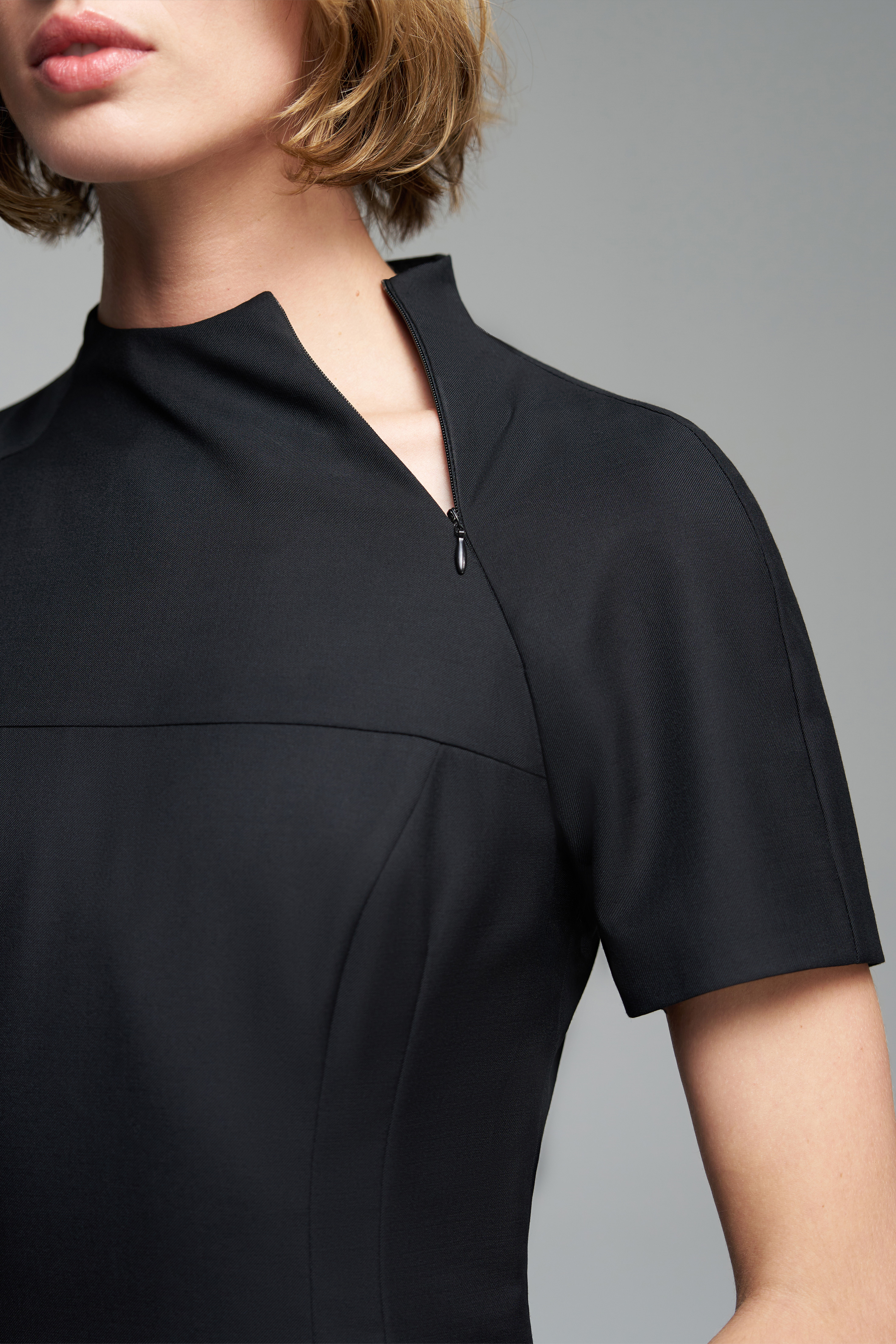 Платье мини из костюмной ткани. Приталенный силуэт, скрытая застёжка сбоку. На верхней части изделия — функциональная молния.