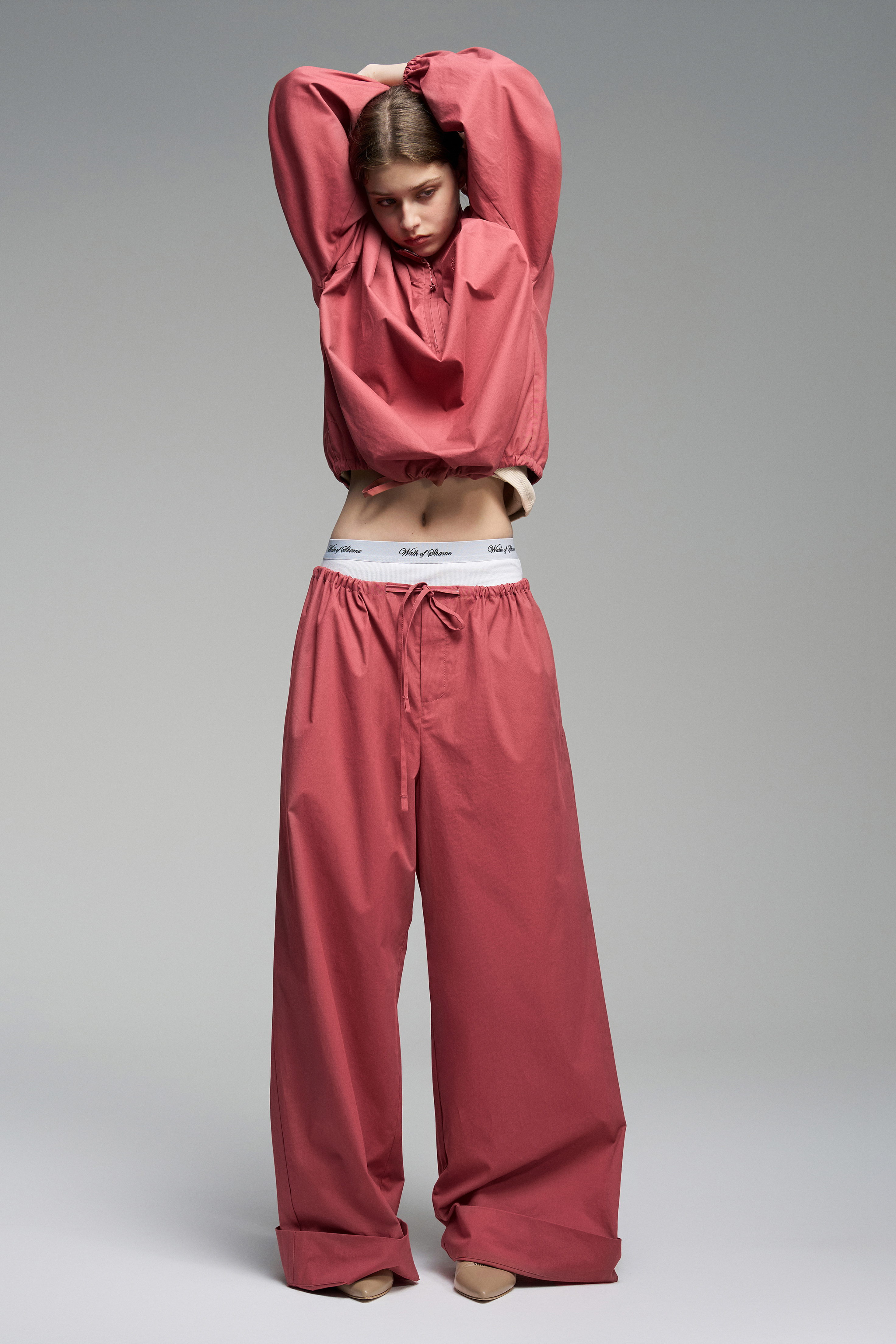 Прямые хлопковые брюки с поясом на резинке. По бокам — врезные карманы.