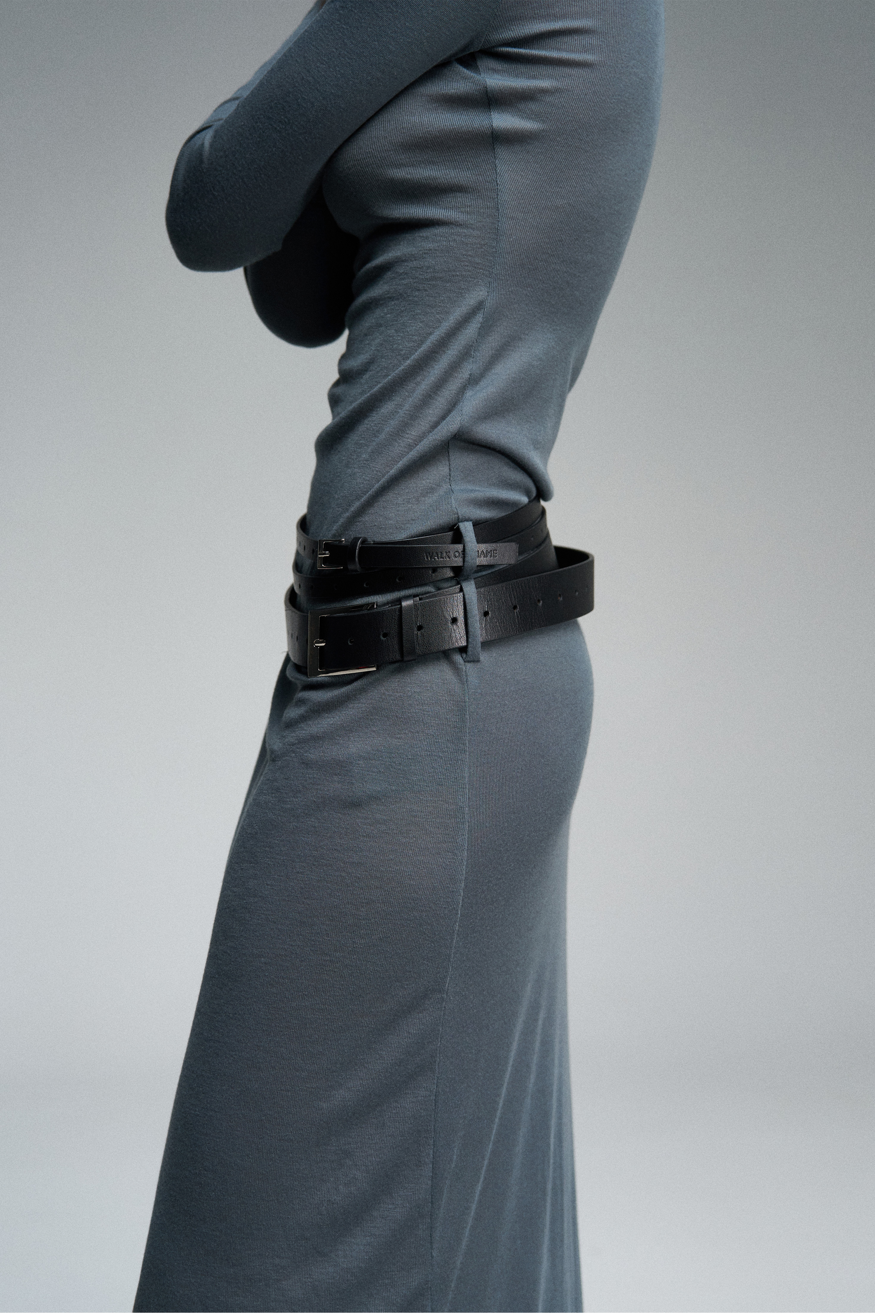 Черный кожаный ремень длиной 140 см с квадратной металлической пряжкой серебристого цвета.